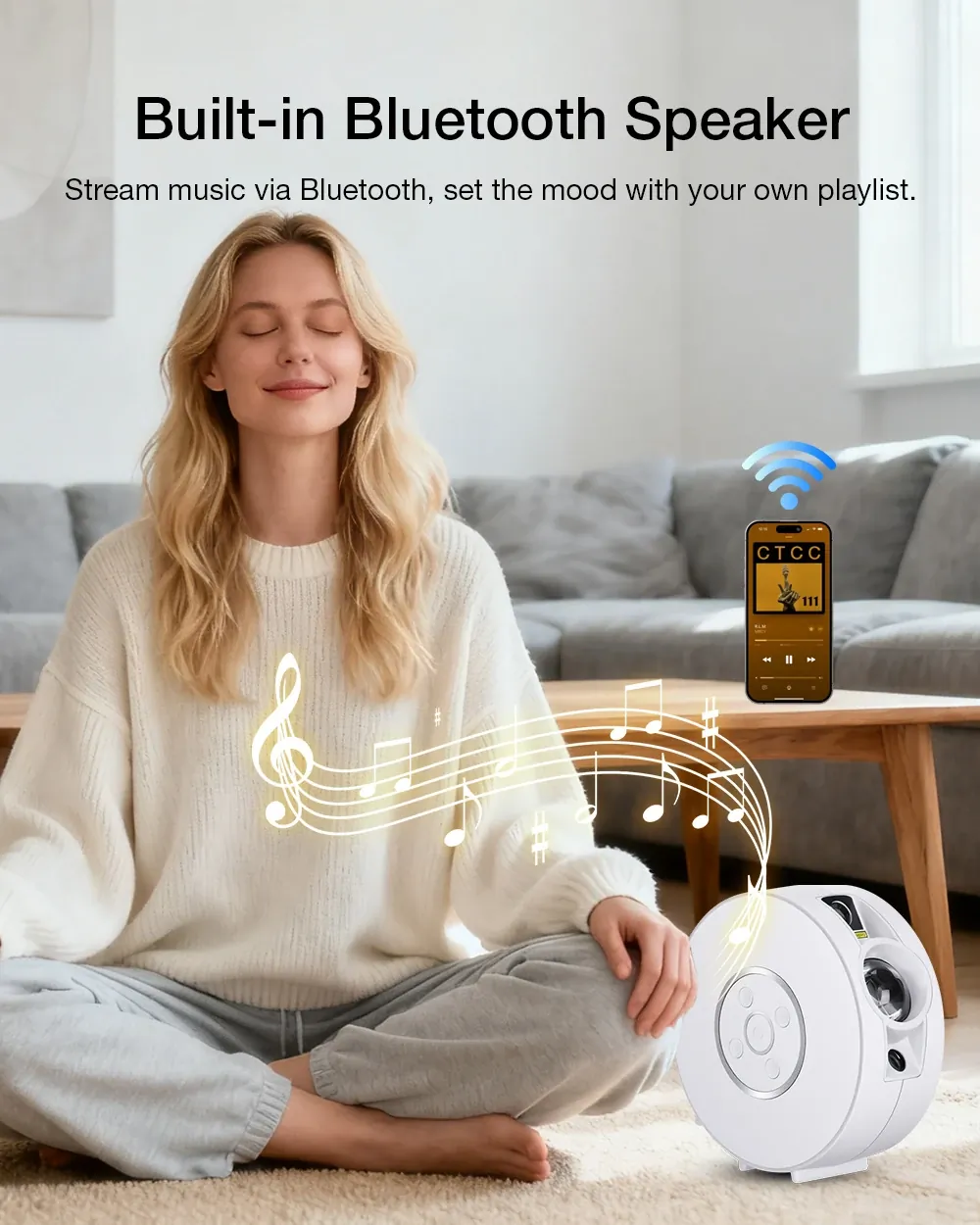 A vetítésen túl sokféle fehérzajt- és természetes hangot tud lejátszani, köztük esőt, tengerzúgást és madárcsicsergést, de van altató zene is. A beépített hangszóró hangminősége elfogadható, általános, hétköznapi használathoz bőven elég, de audiofil füleknek kevés lehet a 3 watt teljesítmény. Halkan hallgatva alapzajnak vagy alváshoz azonban egyáltalán nem rossz. A Bluetooth-kapcsolat stabil, így a telefonról is könnyedén tudsz zenét küldeni rá.
