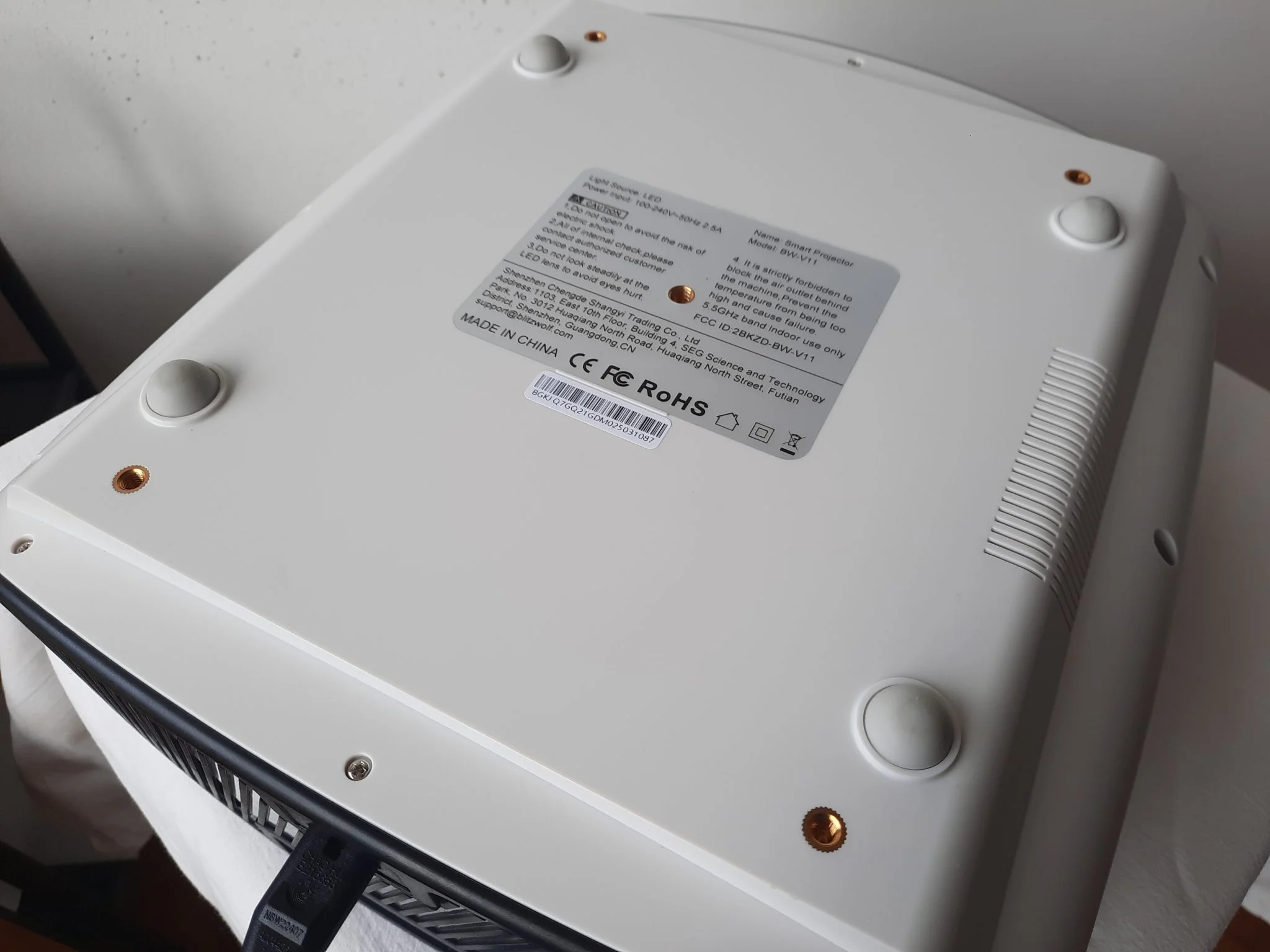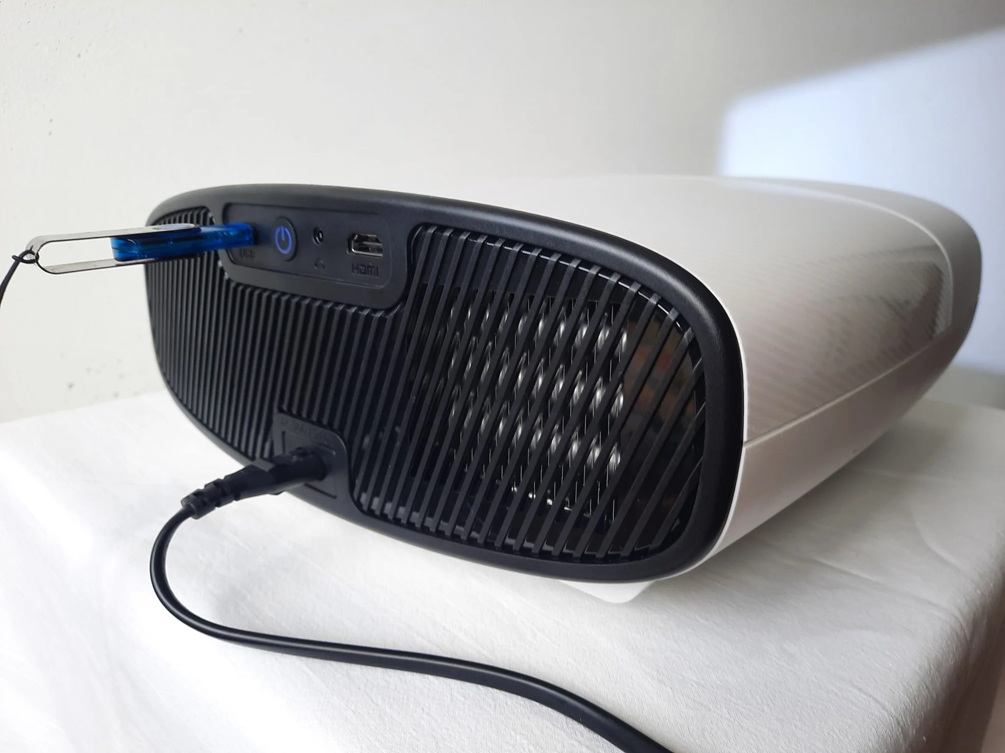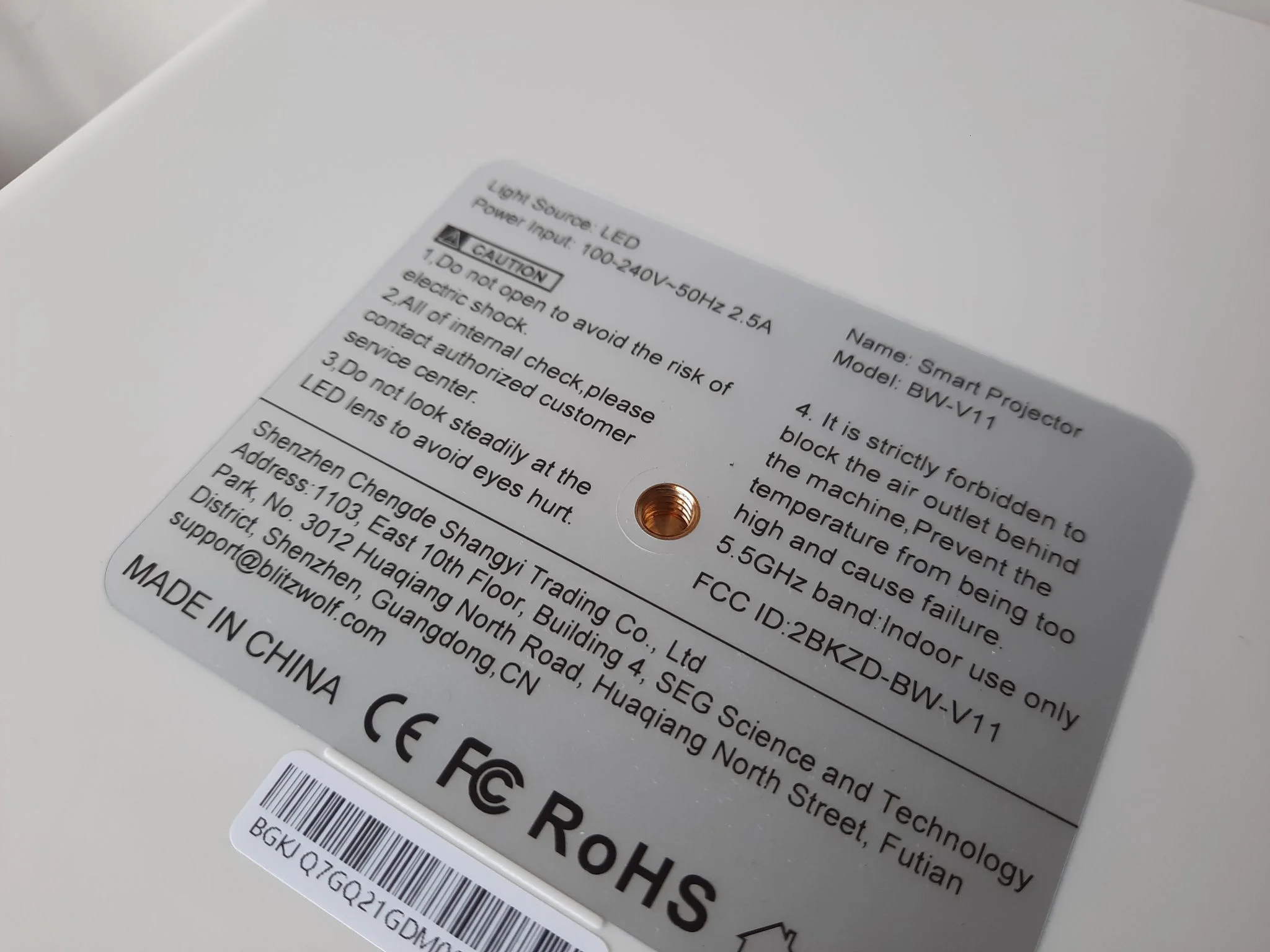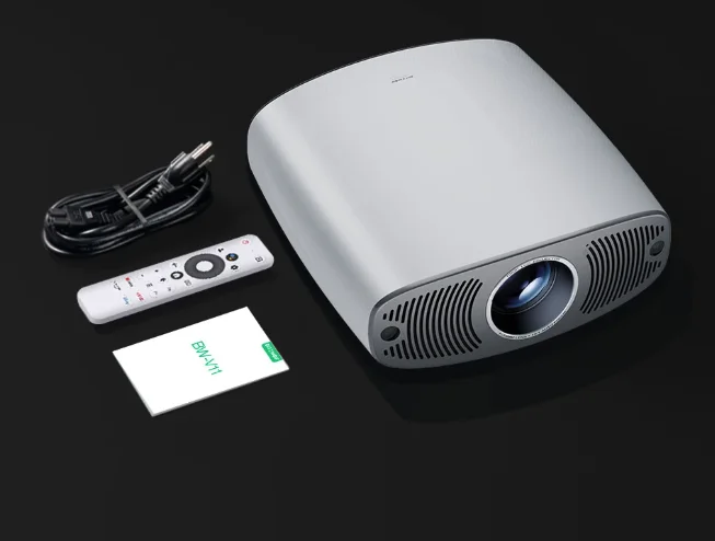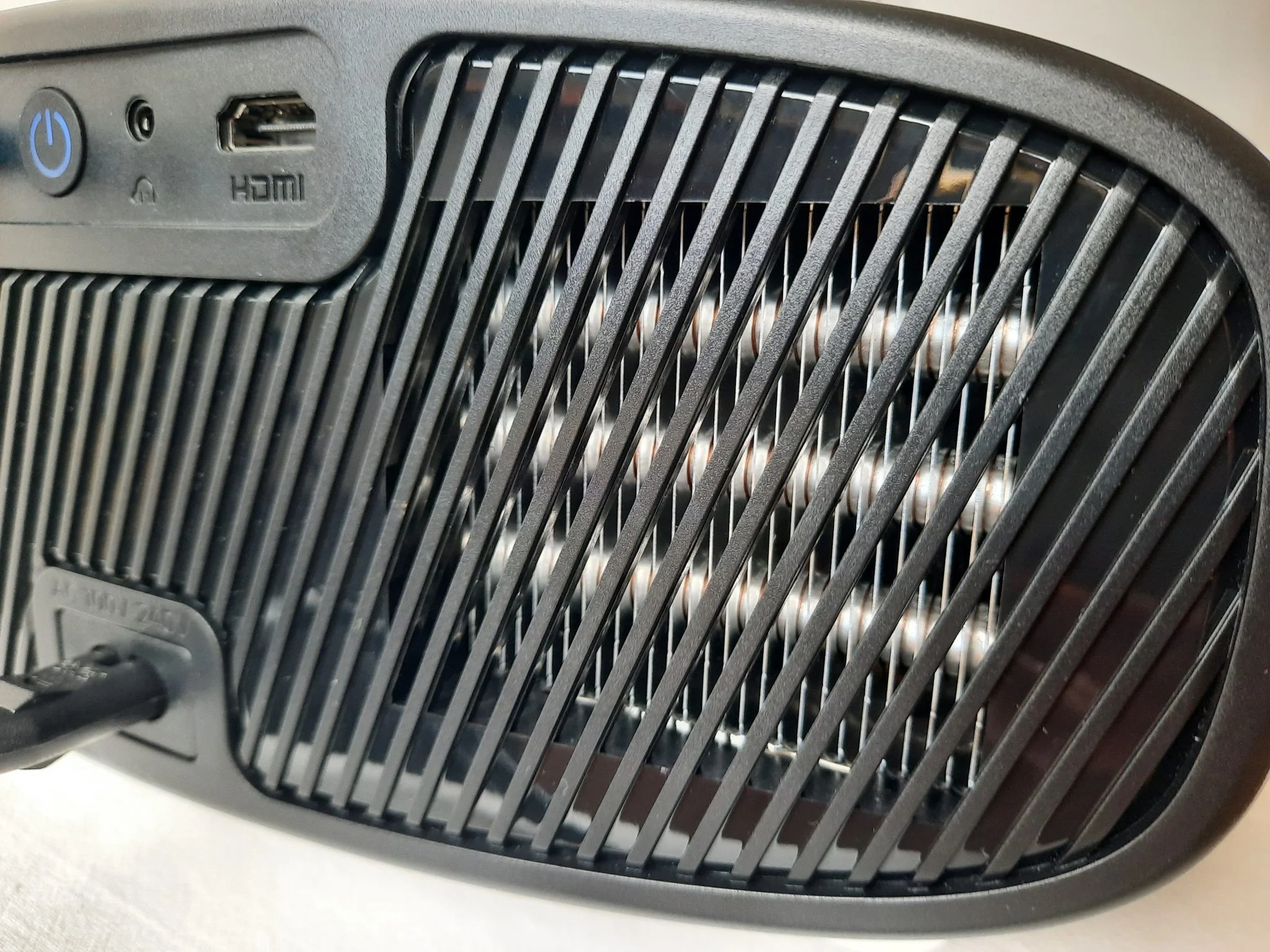 A tömege meggyőző és minimális a gombozat a házon, valamint a portok száma is. Összesen egy gombot találni rajta (on/off), tehát minden beállítás a távirányítóval érhető el vagy automatikusan csinálja a projektor. A tápcsatlakozón kívül van egy USB-A port (például pendrive-nak vagy billentyűzetnek), egy HDMI csatlakozó és egy 3,5 milliméteres jack port a hátoldalán – fejhallgatónak dedikálva -, de természetesen ez kábeles csatlakozás is lehet egy hangrendszerhez. Összegezve a fizikai külsőt a ház jellege, a hűtést rejtő, rácsos panel, az elöl található hangszórók és a talprészen található kis gumidudorok (lábak), illetve a négy sarki, plusz egy középső menetes hüvely, amik segítségével felszerelhető fixre vagy állványra rakható a BW-V11,