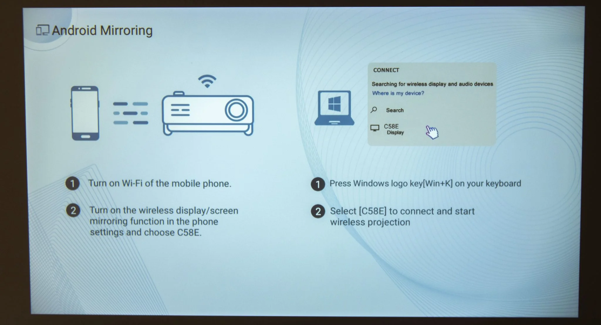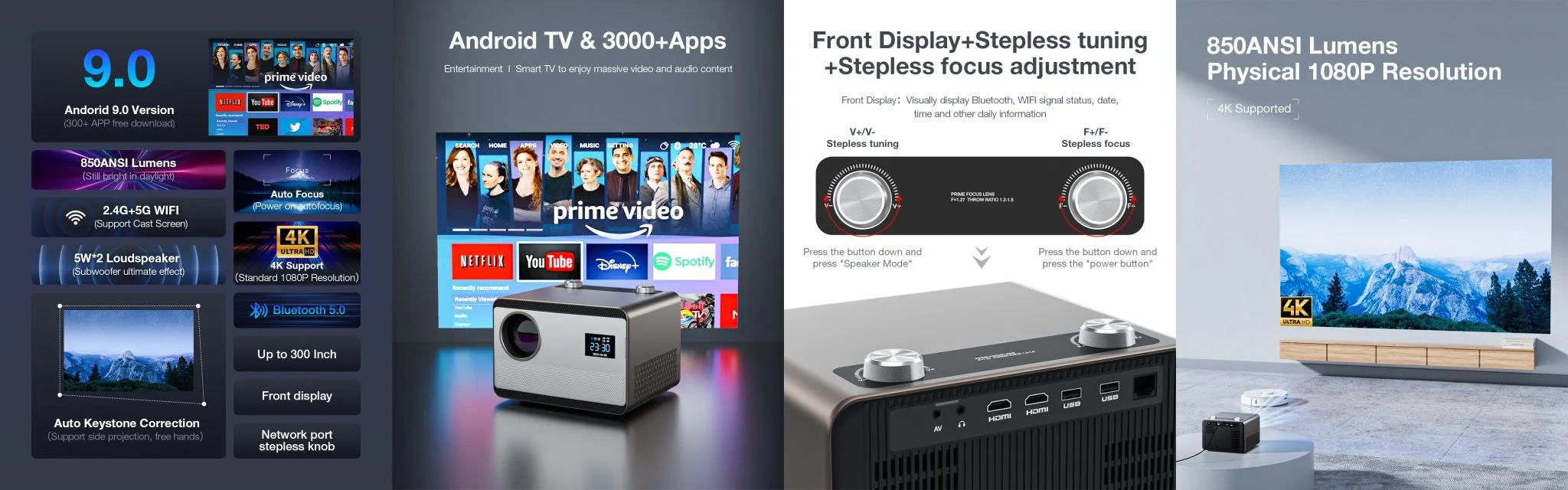 ami 101-356 centiméteres átlót jelent, legalábbis a leírás szerint. Ehhez képest a sajtóanyag 300 inch-et állít, ami 762 centiméter, de ez teljesen irreálisnak tűnő méret. A fényerő elvileg 1,4-4,8 méteres vetítési távolságra elég, én nagyjából 1,5-2 méterről használtam. Minél nagyobb a vetítési táv, annál több fényerőre van szükségetek, szóval nem erőltettem a szélsőérték próbálgatását. A felbontás Full HD, vagyis natív 1920×1080 pixel, viszont támogatja a 4K-t, míg a képarány 16:9-es, szóval filmnézésre pont jó.