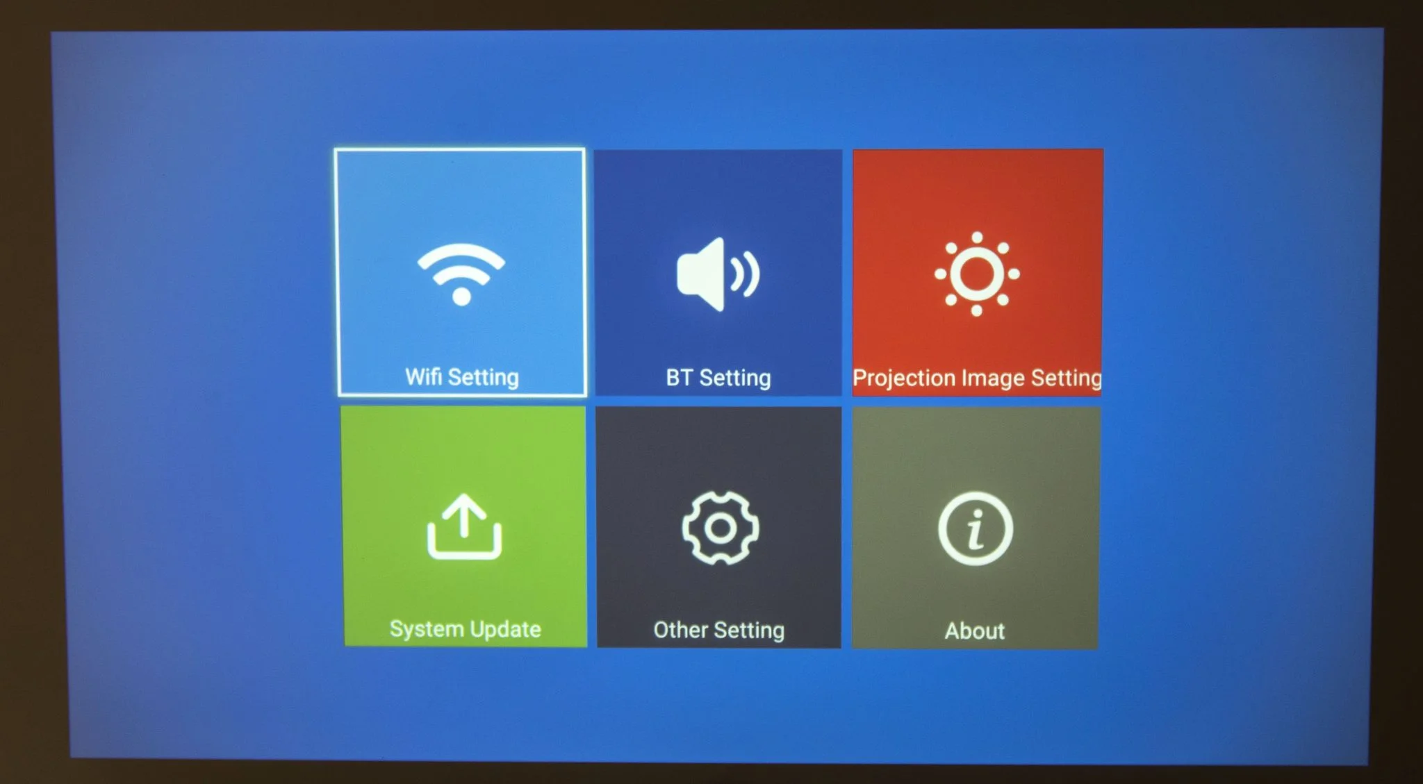 Bár a magasságállító lábak becsavarhatók a termék aljába, nem használtam őket, mivel nálam volt a Wanbo projektor állványa – amihez ez a tömeg már egy picit sok -, és sokkal egyszerűbb volt erre feltenni a testet, mint bohóckodni az 5 centis lábakkal, meg az alá pakolt könyvekkel. A kezdőképernyőről elzarándokoltam a beállító menübe, de mivel minden automata, igazából nem kell semmit állítgatni, egyből használható a BW-V7. Ránéztem az Androidra is, sajnos stock, tehát nem a projektorra szabott spéci rendszer. Cserébe viszont bármi telepíthető rá, nincsenek megkötések, mint a linuxos vagy az egyéb, viszonylag zárt rendszereknél.