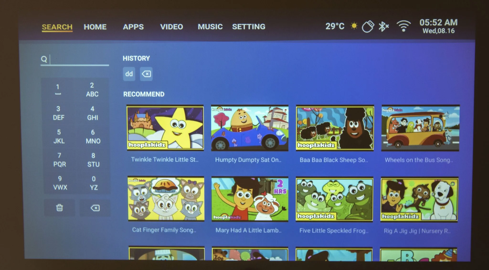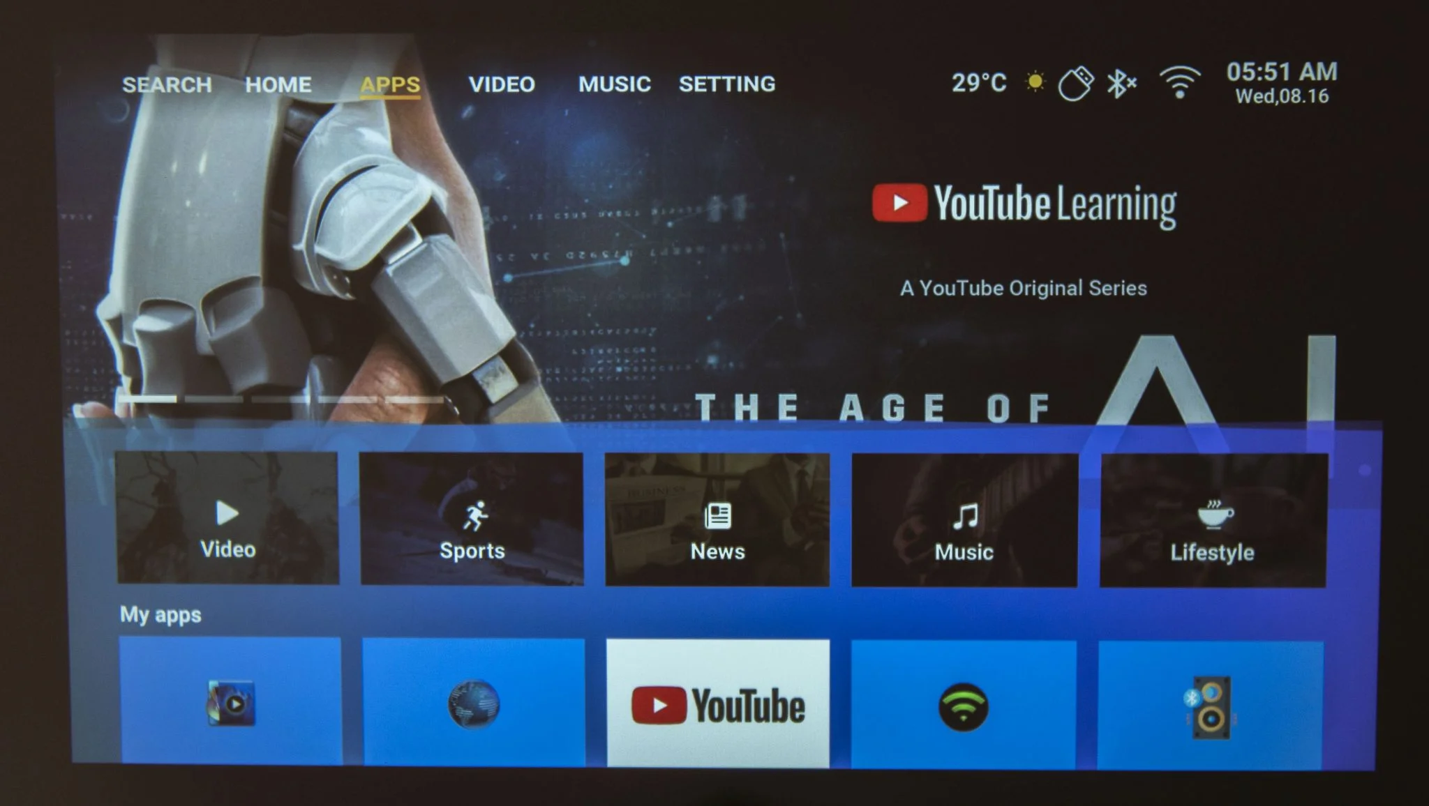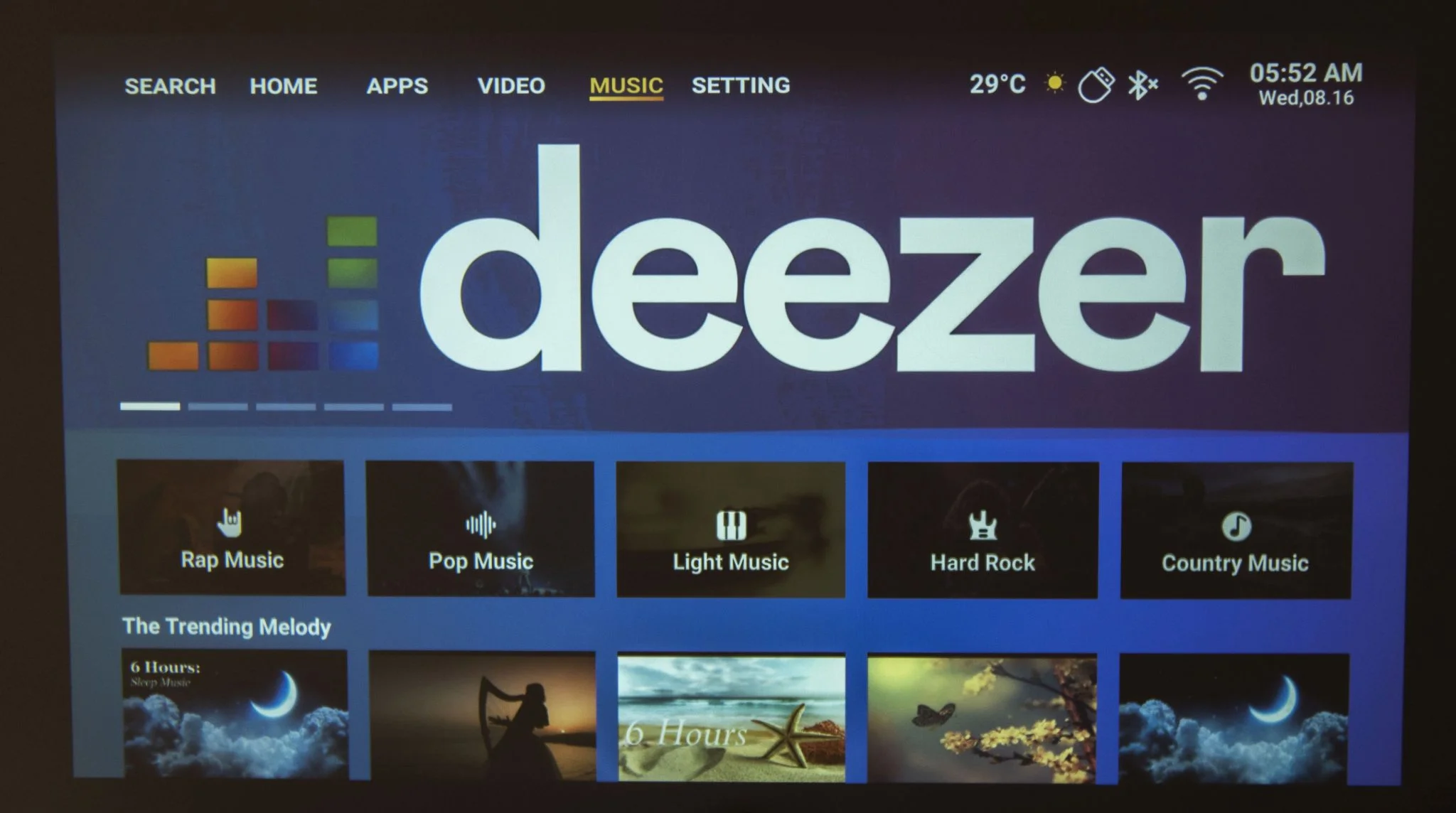 kár hogy nincsen rajta repülőegér, vagy ha van, nem jöttem rá, hogy lehet bekapcsolni. A tartalmakat viszonylag jól szétszeparálták, van a filmes-videós szekció a streaming szolgáltatókkal és a YouTube-bal, a zene a Deezerrel/Spotify-jal és hasonló szolgáltatásokkal. És itt jegyezném meg, hogy végre értelmet nyer a zenehallgatás a projektoron, aminek két oka van: csendes a venti, és jó a két hangszóró hangja is. Tovább lapozva a menüben az Apps alatt az alkalmazásbolt van, állítólag 3000 appal, míg a Settings a beállításokért felel.