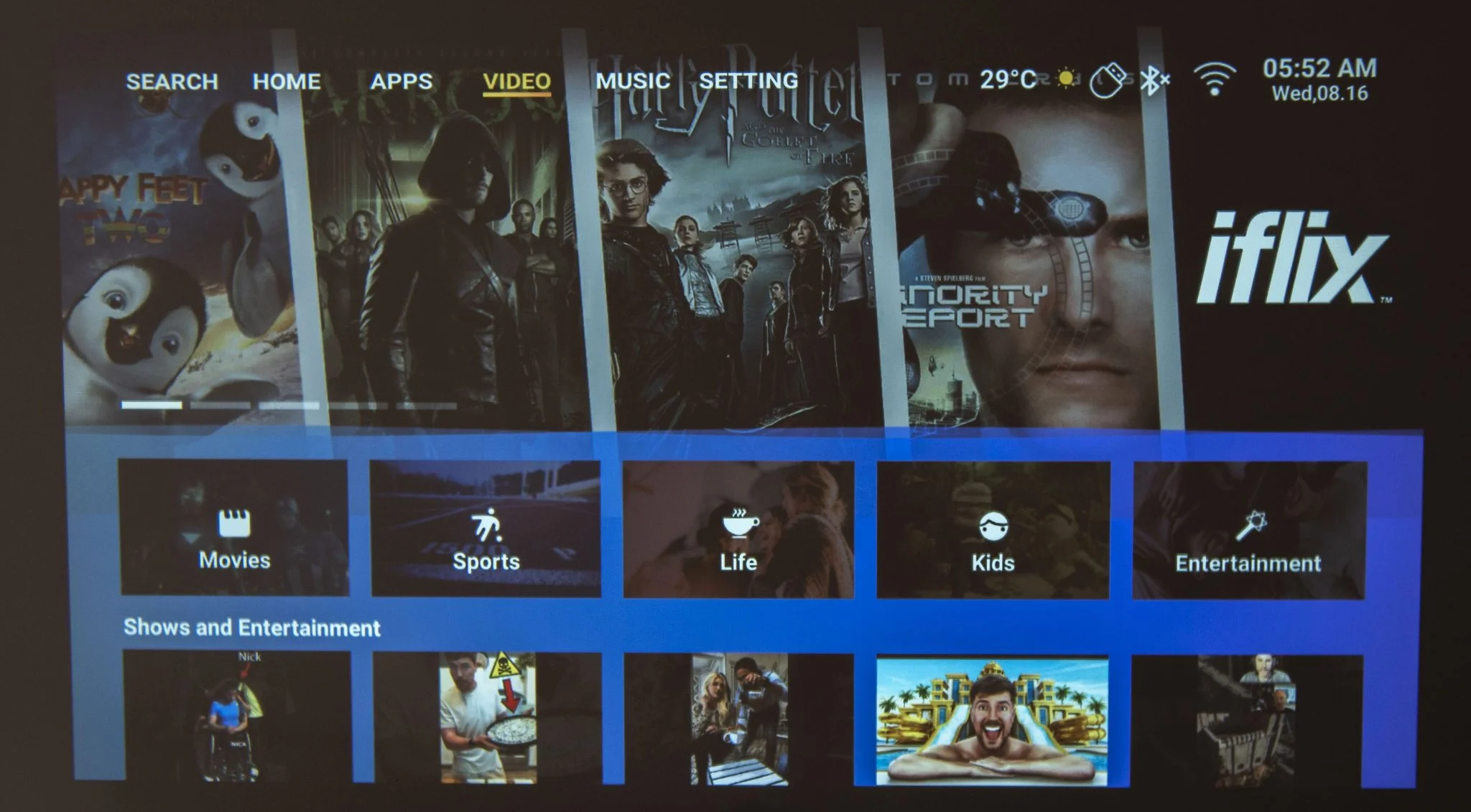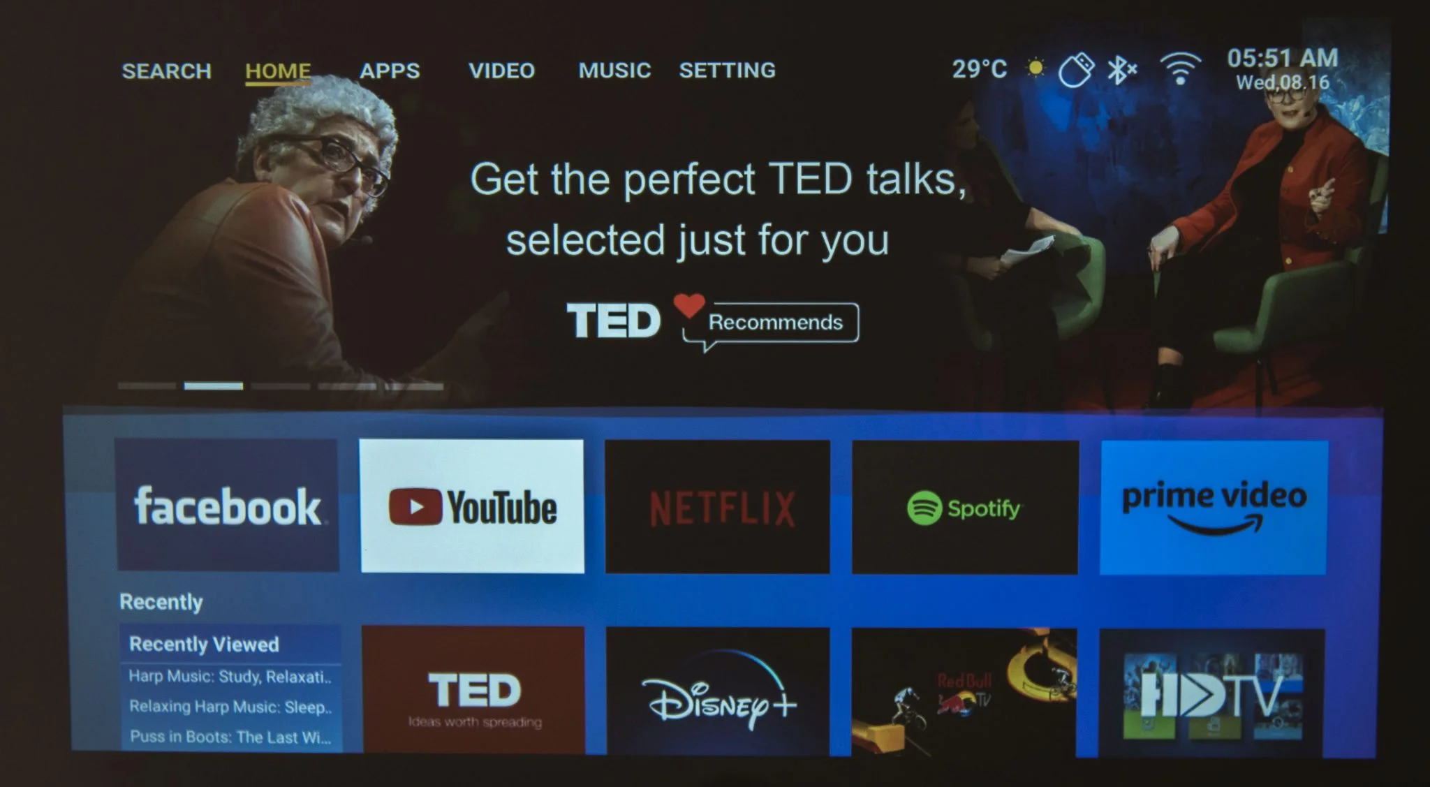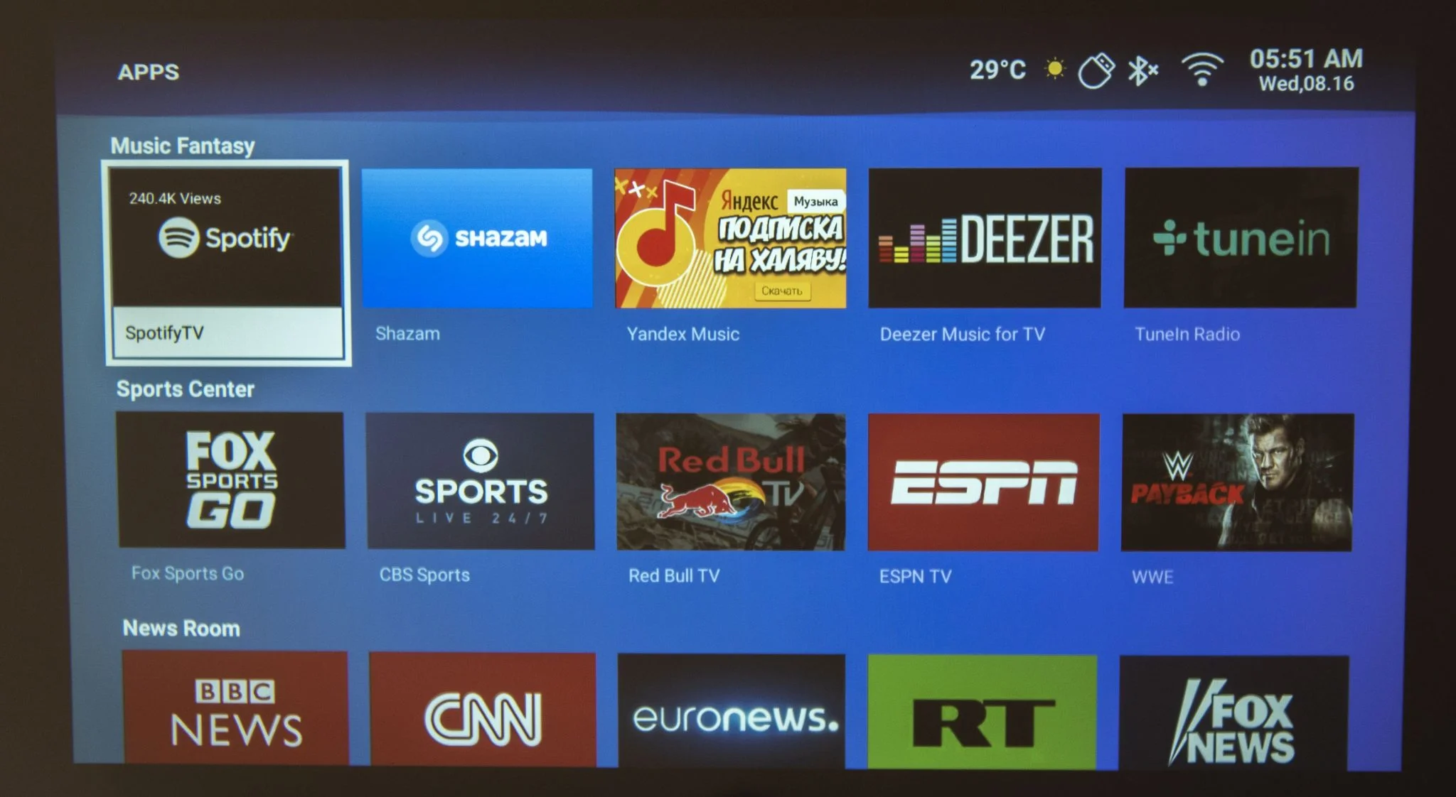 kár hogy nincsen rajta repülőegér, vagy ha van, nem jöttem rá, hogy lehet bekapcsolni. A tartalmakat viszonylag jól szétszeparálták, van a filmes-videós szekció a streaming szolgáltatókkal és a YouTube-bal, a zene a Deezerrel/Spotify-jal és hasonló szolgáltatásokkal. És itt jegyezném meg, hogy végre értelmet nyer a zenehallgatás a projektoron, aminek két oka van: csendes a venti, és jó a két hangszóró hangja is. Tovább lapozva a menüben az Apps alatt az alkalmazásbolt van, állítólag 3000 appal, míg a Settings a beállításokért felel.