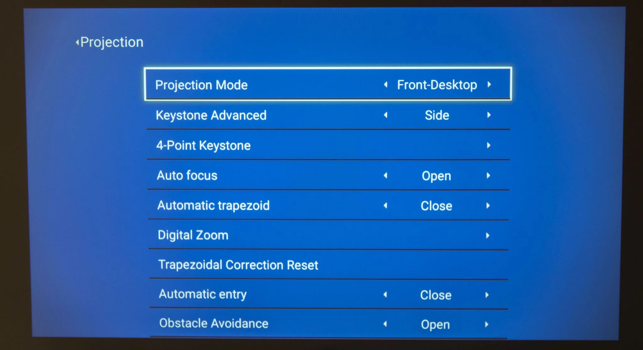 Van még néhány fontos funkciója, az egyik az automatikus trapézkorrekció, ami nem jelent mást, mint hogy a ferdén álló projektortest miatt kialakuló torz képet „egyenesbe” húzza a projektor. Nagyon fontos funkció, nem is vennék olyan vetítőt, ami ezt nem tudja. A másik az autófókusz, ami az élességállításért felel, amibe bele lehet nyúlni kézzel is, de jobb az automata. A harmadik pedig az „akadályfelismerés”, ami hasonlít a drónokéhoz, azzal az eltéréssel, hogy itt ha valami belelóg a képbe, akkor a BW-V7 automatikusan úgy korrigálja – gyakorlatilag összehúzza – a képet, hogy az oldalról belógó tárgyak ne takarjanak bele a vetített képbe.