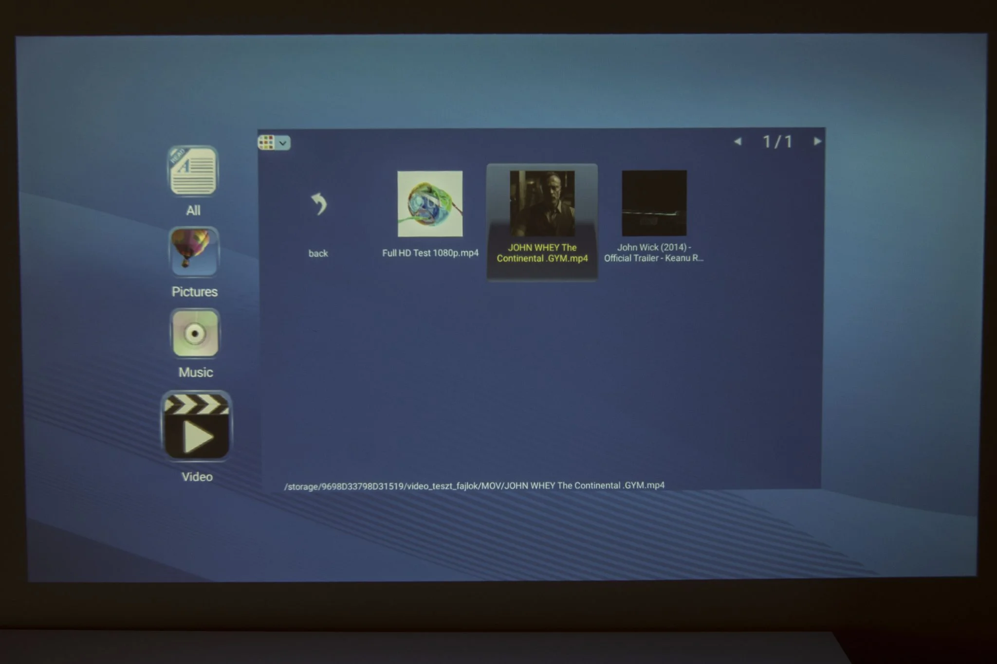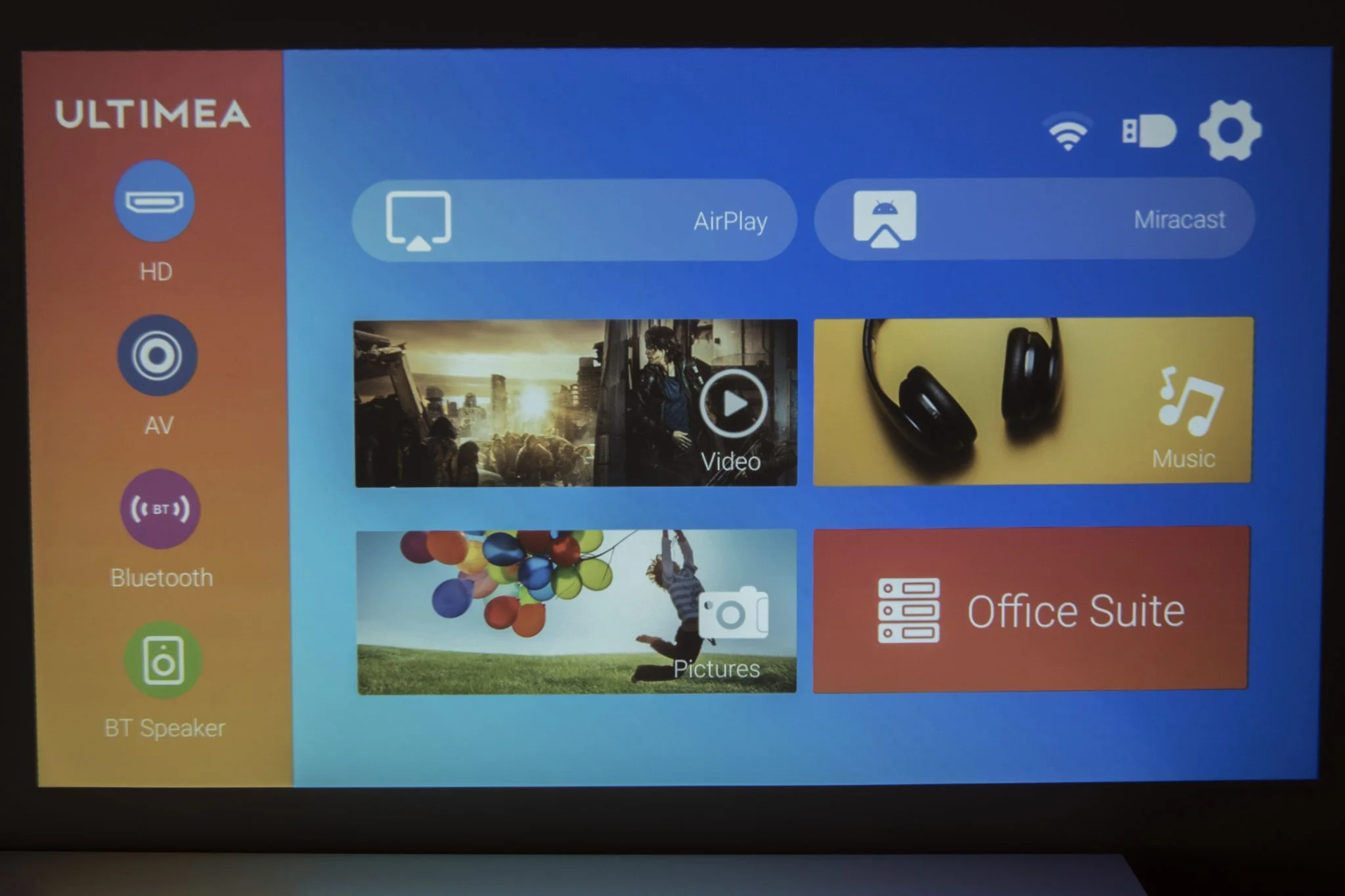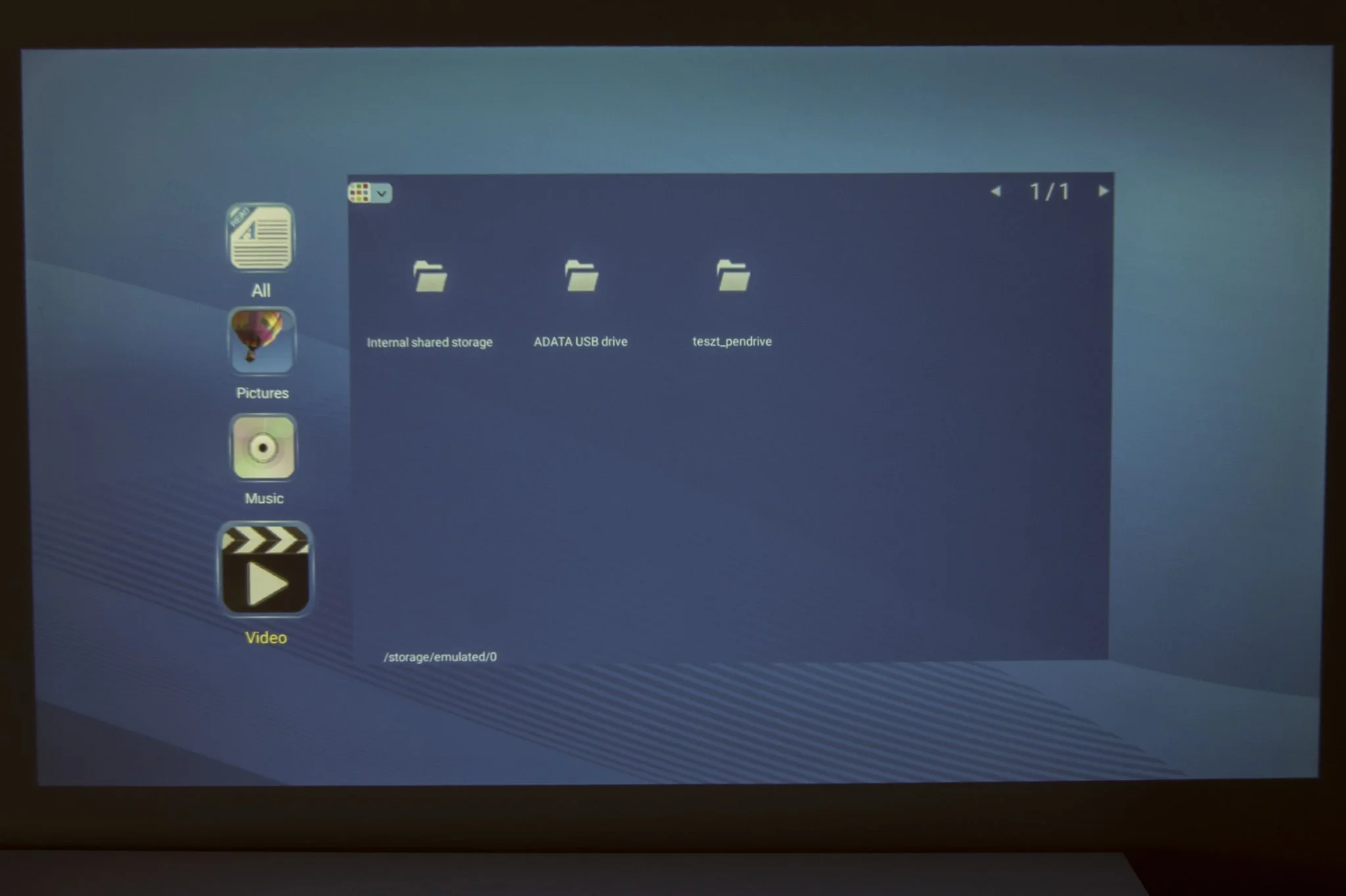 a főbb lehetőségeket sorolja fel, mint videónézés, zenehallgatás, képek közötti lapozgatás, de ezek tulajdonképpen ugyanoda vezetnek: a fájlkezelőbe. Van továbbá „Office Suite”, ha prezentálni szeretnétek az Ultimea Apollo P40-nel, illetve a felső sávon megtaláljátok a hangzatos AirPlay és Miracast szavakat. A képtükrözés gyakorlatilag hibamentesen működött Android segítségével, nem is volt nagy ingerenciám mást használni, mert így a legkönnyebb átvinni a videós tartalmakat – pl. YT -, illetve játszani is.