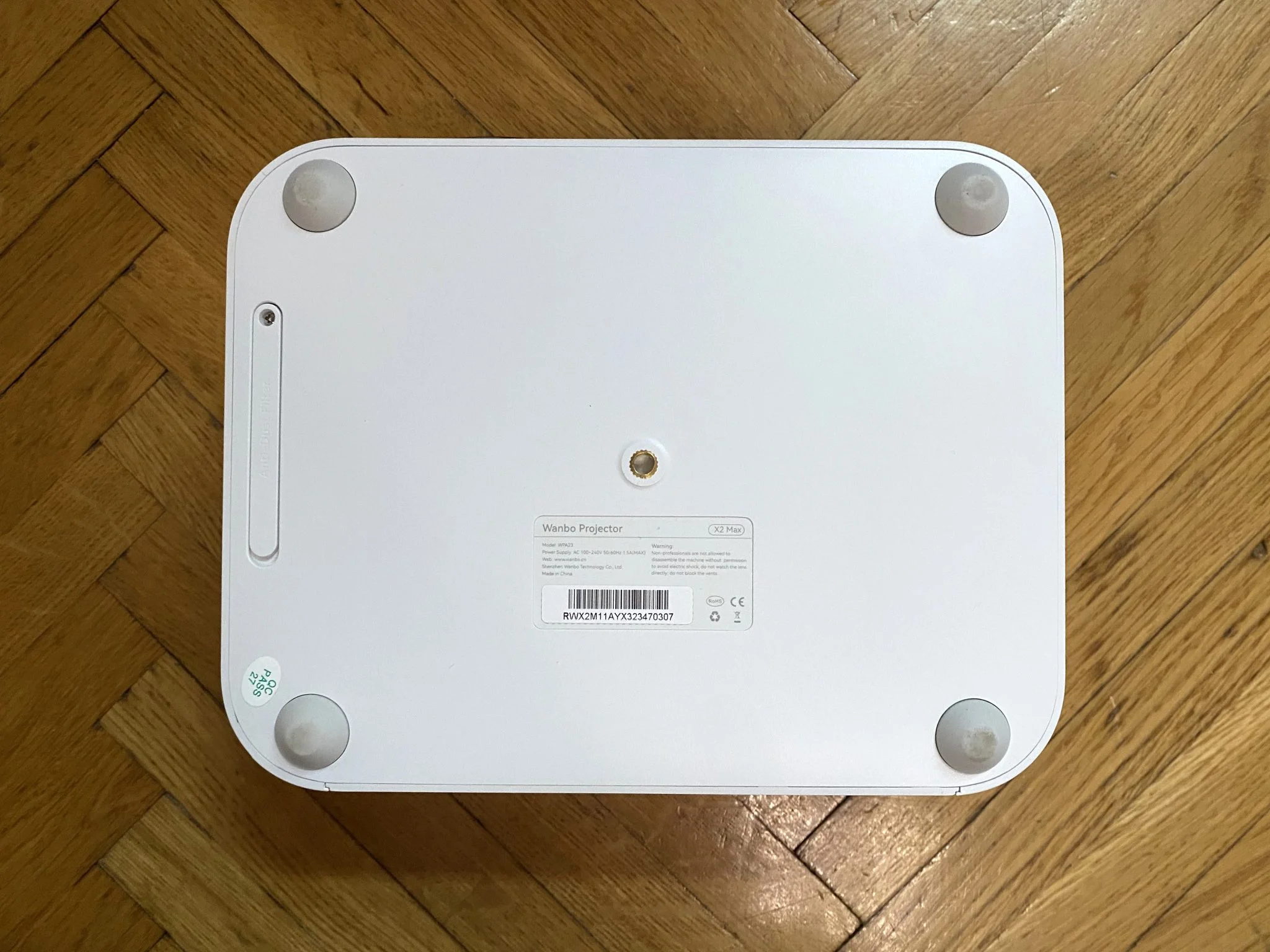 Túl sok periféria csatlakoztatására nem lesz lehetőséged, de nincs is rá feltétlenül szükséged, mert ez egy projektor, Androiddal. A készülék alján a szabványos rögzítőmenetet is megtalálod, tehát állványra vagy fali konzolra is szerelheted. Én egyikkel sem rendelkezem, ezért egy kis kihajtható lábat eléggé hiányoltam, amivel a dőlésszöget állítani lehetne legalább 1-2 fok erejéig. Így hát maradt a négy kis szilikon tappancsa és a jól bevált könyvekkel és egyebekkel való alátámasztás. Még egy fókuszállító tekerentyű sincs rajta, bár minek is, hiszen ez automatán működik benne.