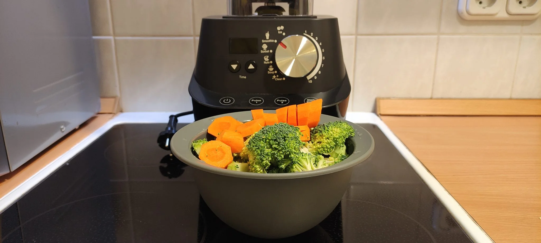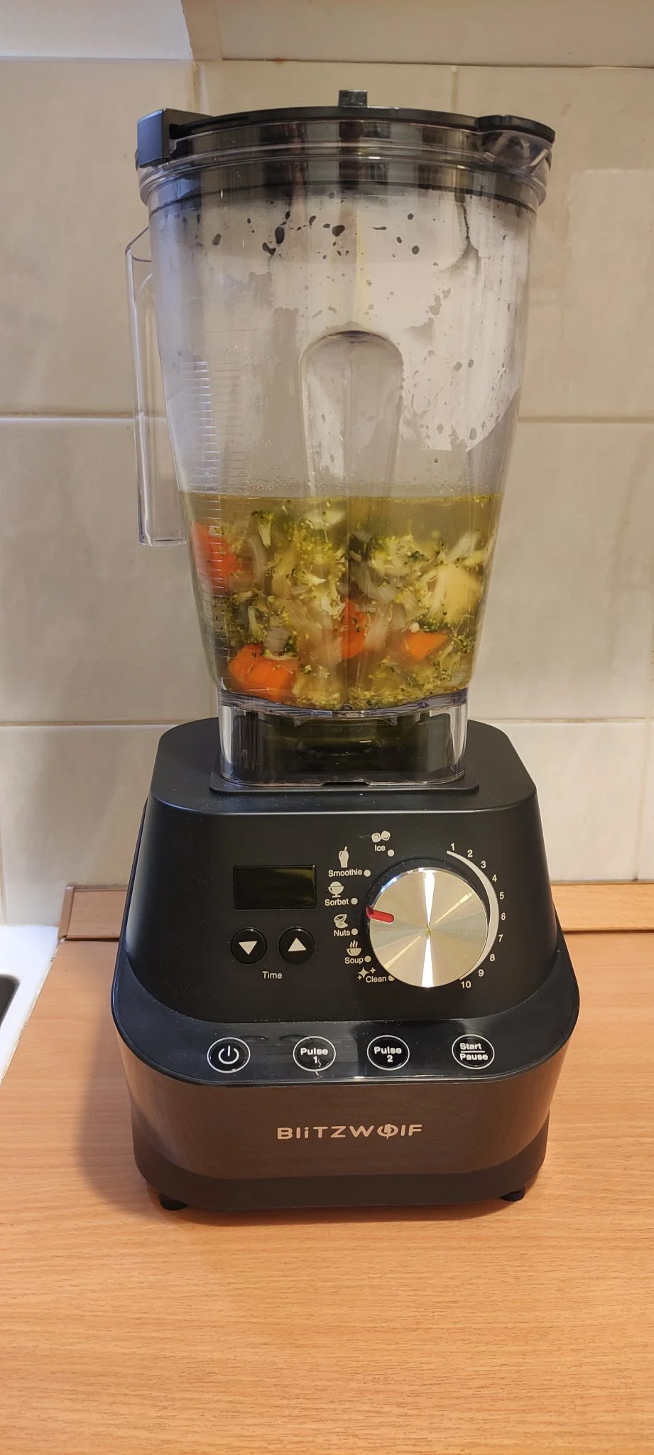 A jobb oldalon ugyanezeket beállíthatjuk egy 1-től 10-ig tartó skálán, illetve a fel le nyilakkal, az előbbi az erőt, utóbbi az időtartamot szabályozza. Azt például nem értem, hogy a krémleveshez valót miért kell 3 percig aprítani, a főtt zellert és a répát nagyjából 15 másodperc alatt péppé darálta, de biztosan vannak olyan ellenállóbb növények, amelyeknek több idő kell. A smoothie-val és a jéggel is végzett ugyanennyi idő alatt, szóval a teljesítményre nem lehet panasz. Alul van 4 további gomb, amik a ki- és bekapcsolásért, illetve az elindításért és a megállításért felelnek, illetve további 2 db, „pulse” néven. Ez a két mód lassabban és gyorsabban forgatja a pengét, és nem kell hozzá az időzítőt sem használnotok, tulajdonképpen ezek szolgálnak az „ételek helyreigazítására”.