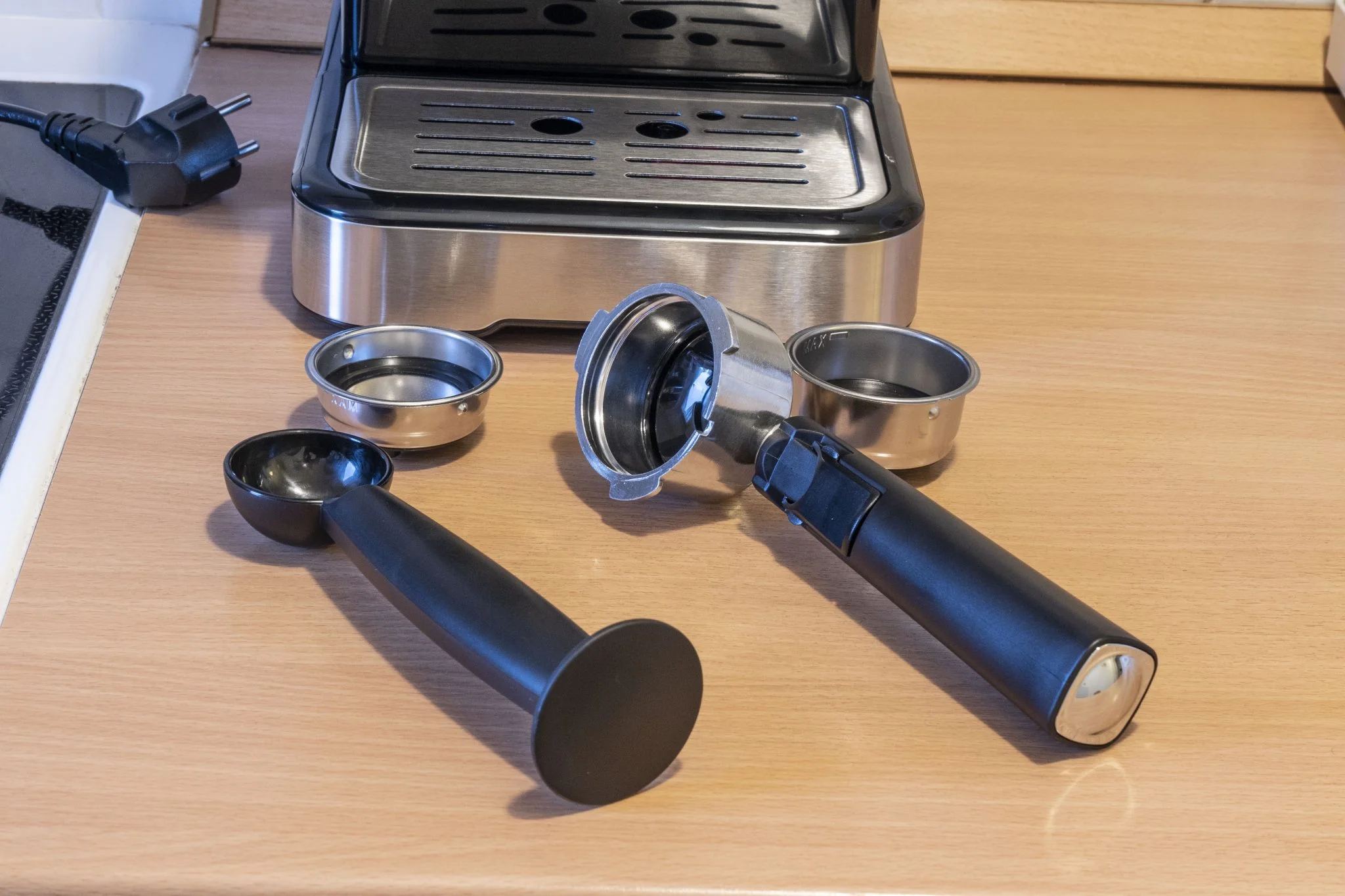A dobozolás a szokásos zöld-fehér sémát követi, a kávéfőző mellé adják a leírást, az adagolókanalat – aminek az alja azért domború, hogy a kávétöltet le tudjátok tömöríteni vele -, egy csepptálcát, illetve a kar végébe helyezhető 1, illetve 2 adagos szűrőt. Érdemes a kávéfőzőt körbeforgatni és minden nylont és ragasztóanyagot eltávolítani róla, mert van egy rahedli. A hátoldalon a víztartályt találjátok, ezt érdemes maximumra feltölteni, és készíteni néhány adag kávét, de akár „üresen” is átforgathatjátok a vizet a gépen, hogy tisztuljon az első használat előtt. Aki meg akarja növelni az élettartamot – vagyis csökkenteni a vízkőképződést – az vásárolhat csökkentett ásványianyag tartalommal rendelkező ásványvizet, pl. a Norda ilyen, a Groby boltjaiban lehet kapni. Természetesen minden kiegészítőt alaposan elmostam, mielőtt használatba vettem volna őket.