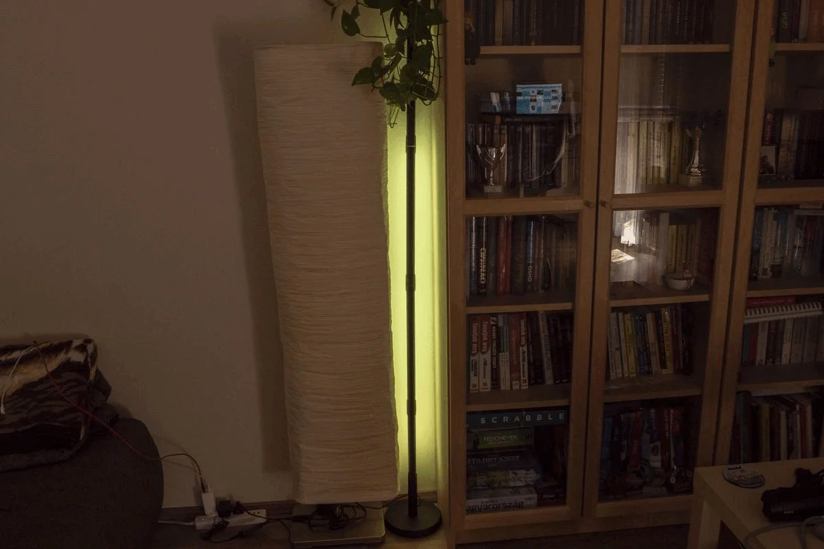 Ezzel nem lenne önmagában baj, ha a részegységeken nem látszanának körkörös foltok, emiatt nem teljesen homogén módon világít a LED oszlop, és ez nem annyira szép. Mikor pulzál rajta a fény, akkor ez egyáltalán nem zavaró, de amikor egy színben ég, akkor egy kicsit igen. Ez viszont a gyakorlatban nem lesz mérvadó, ugyanis ez egy sarokba való hangulatvilágítás, tehát alapvetően a falat világítja meg, felétek a feketére fújt rész fordul, elmaszkolva ezt az esztétikai hibát.