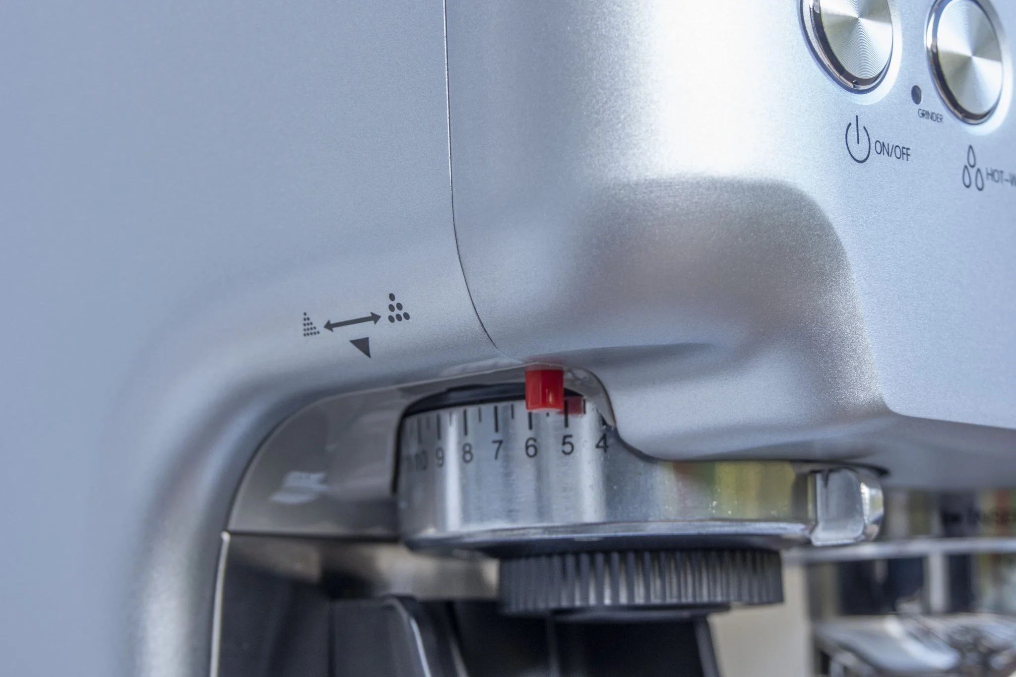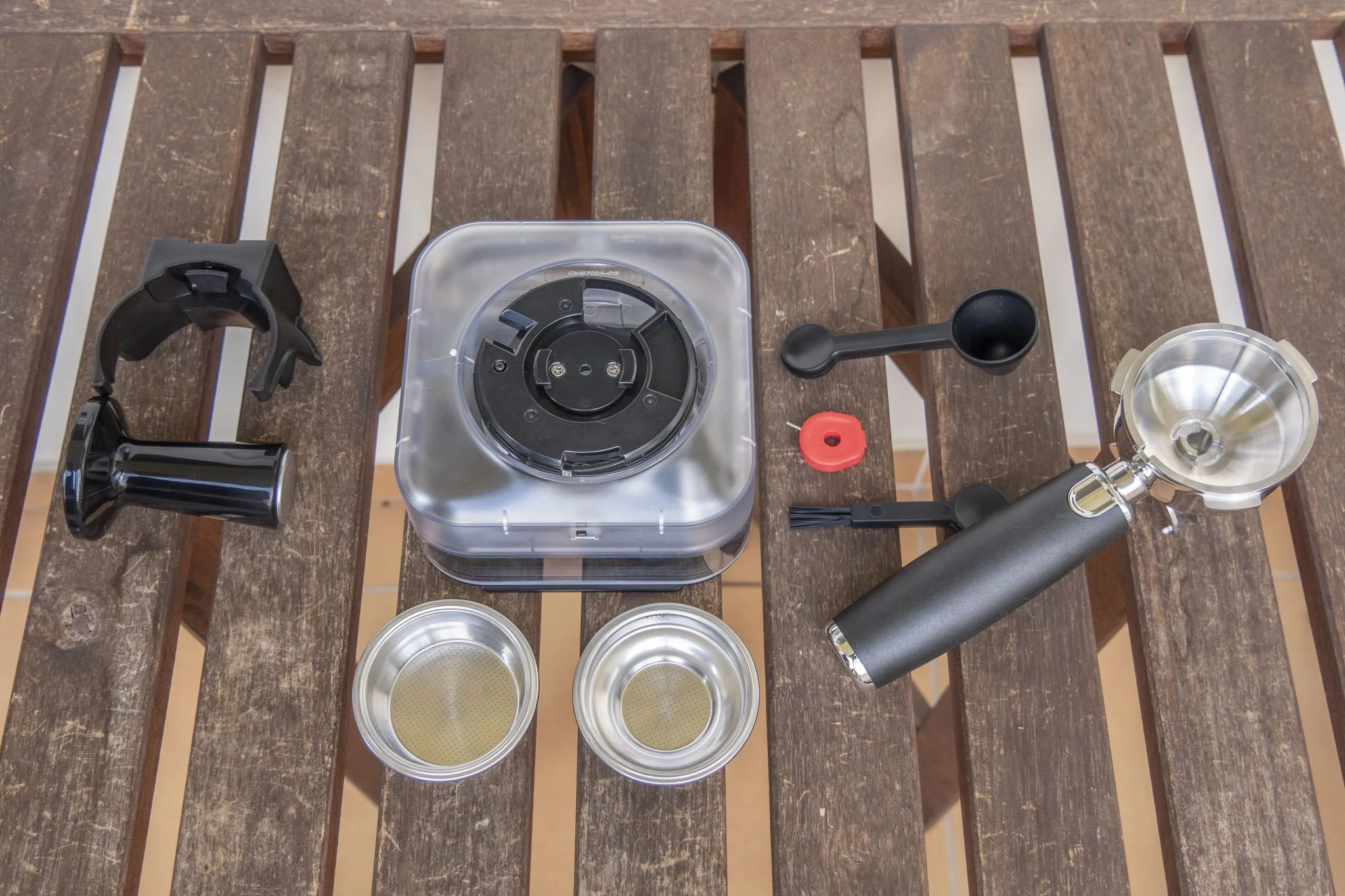 a kávépogácsa tömörítésére használható eszköz – a tamper -, 2 db, különböző méretű kávétöltet fogadására alkalmas fém filter, a takarításra használható eszközök és persze a leírások, ugyanis kettőt is adnak. Ezt érdemes végiglapozni, hiszen enged némi betekintést a kávékészítés rejtelmeibe. Maga a gép anyaghasználata parádés, leszámítva a víztartályt, ami az elmegy kategóriája. Mindenhol máshol hűvös alumíniumot, prémium érzetet nyújtó tekerőkapcsolókat, és diszkréten világító, LED-es fizikai gombokat találhattok. Számomra nem teljesen egyértelmű, hogy az érintőpaneles – mint a CMM2 – vagy a nyomógombos megoldás-e a jobb, de ez utóbbiak nyomkodása sokkal inkább képes minőségi érzetet sugározni, vagyis megértem, hogy miért e mellett döntöttek az alkotók.