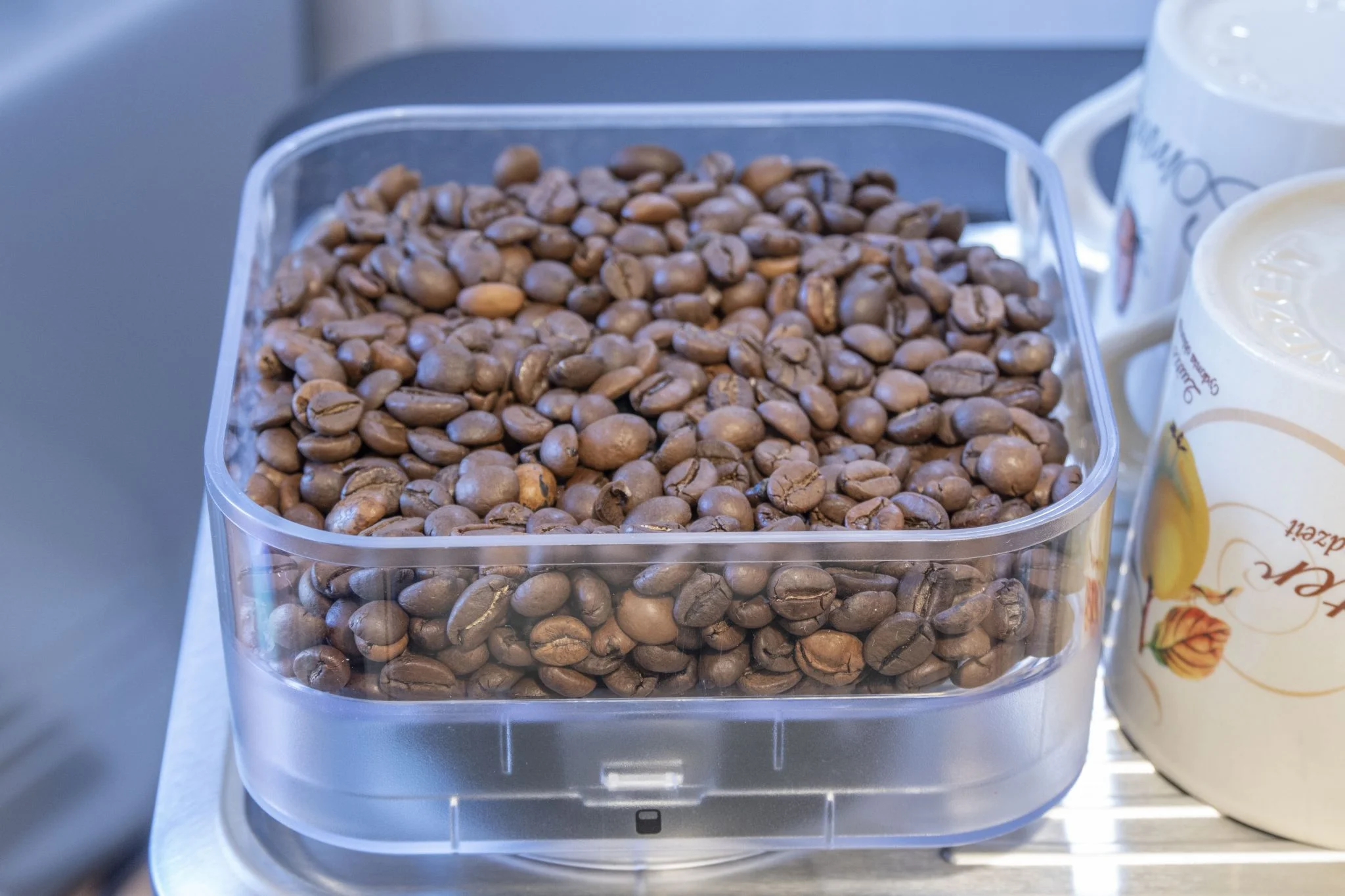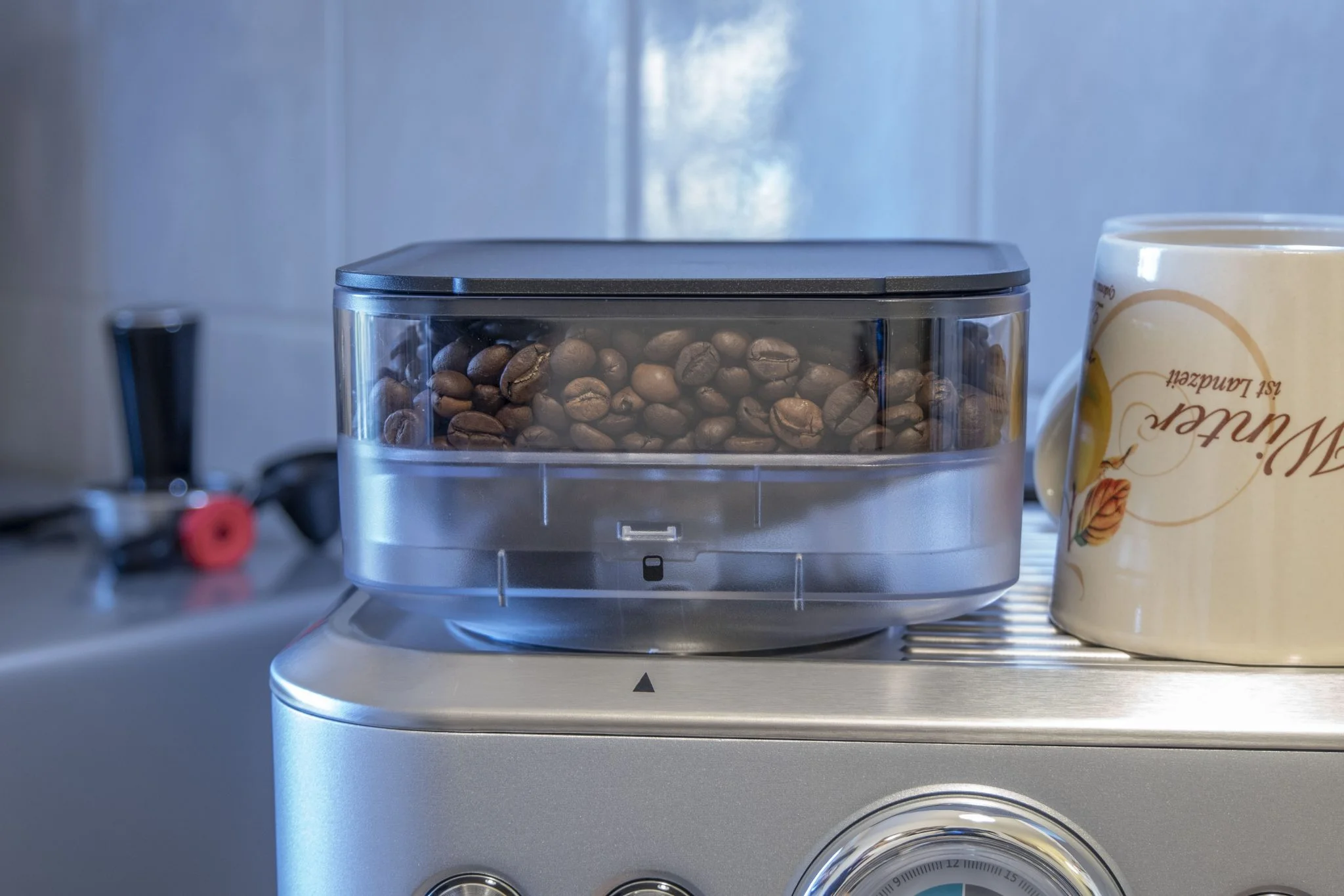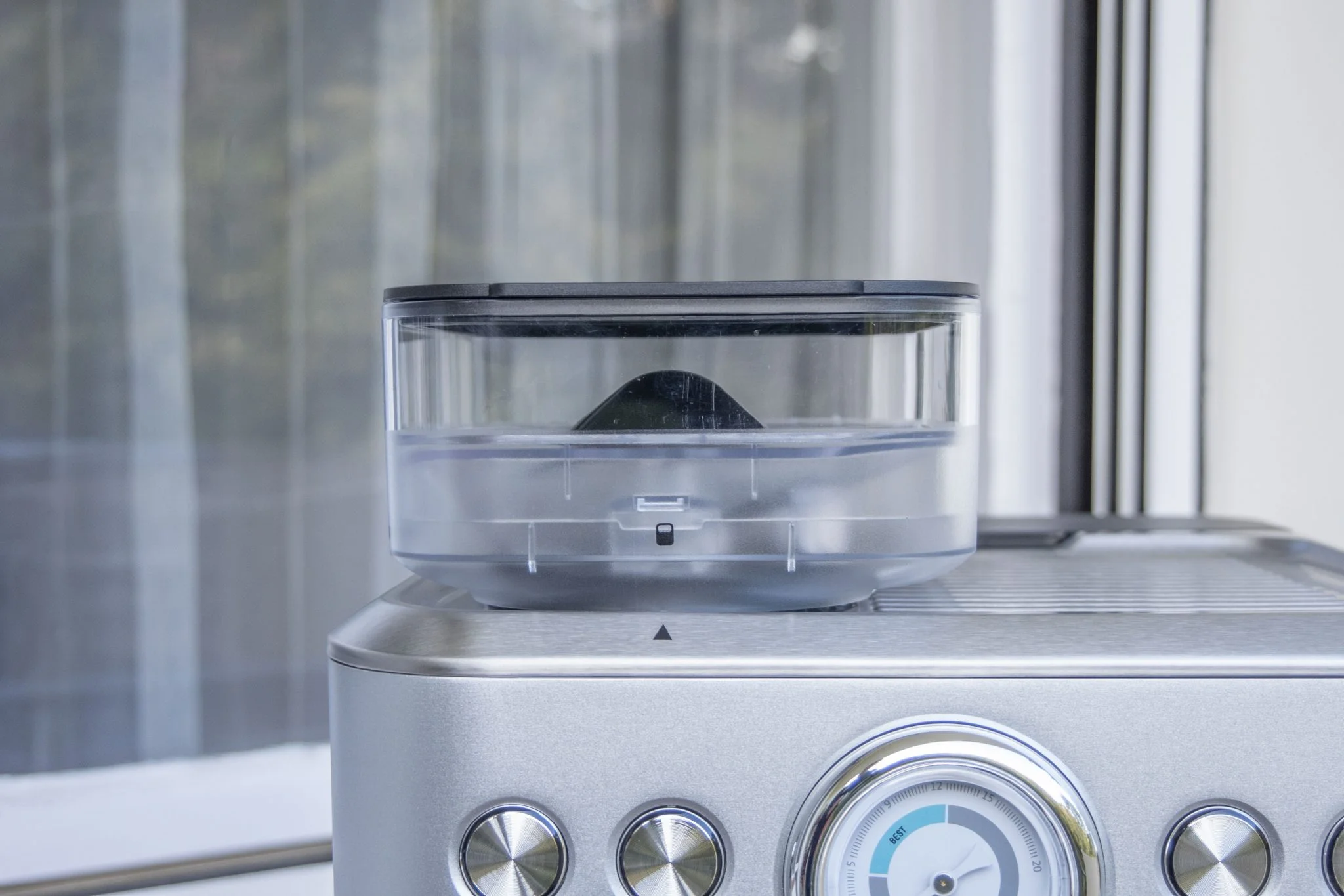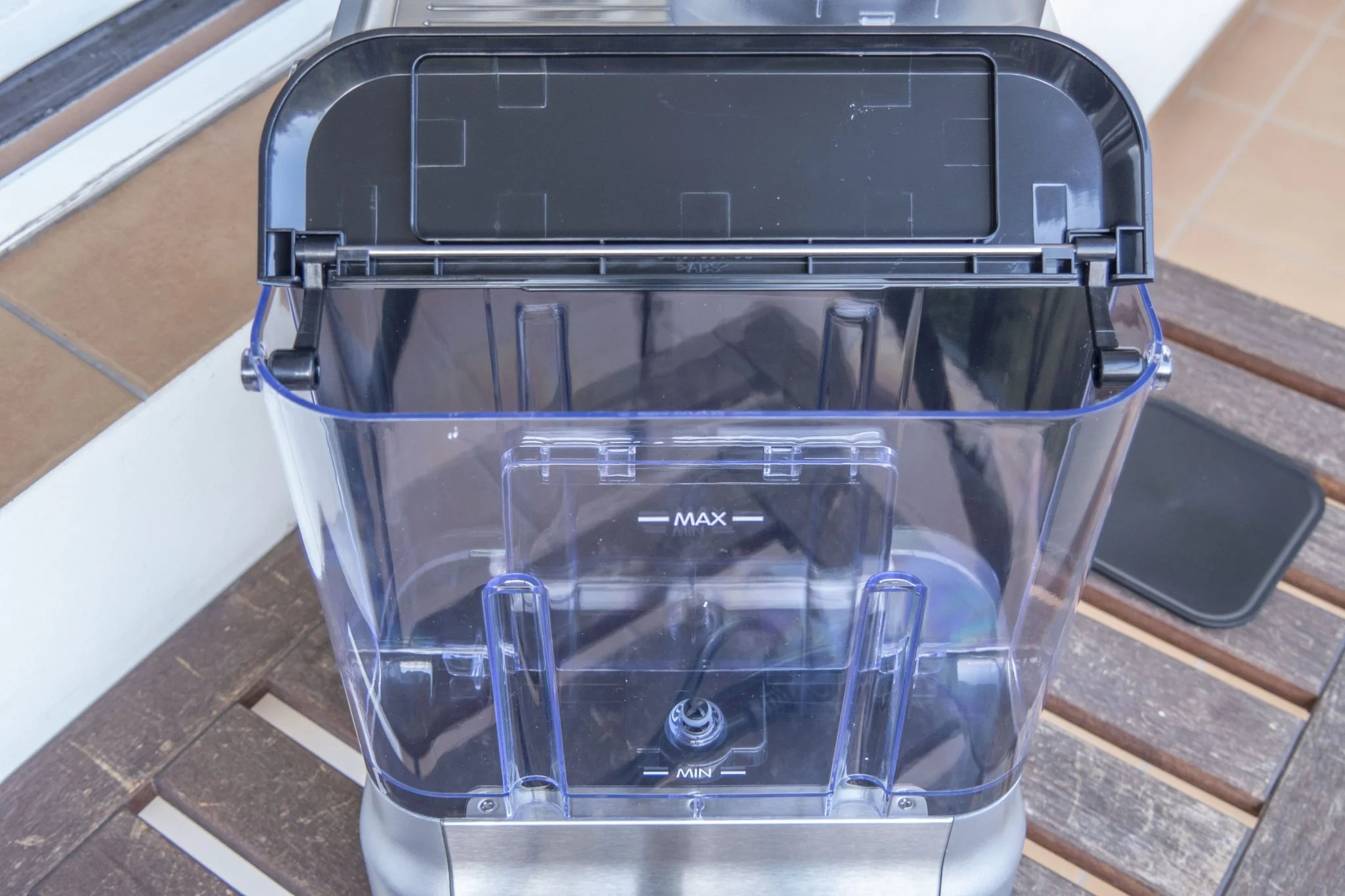 A beüzemeléshez el kell távolítanotok a kiegészítőket rögzítő ragacsokat, helyére illeszteni a csöpögtető tálcát, amiben van egy „úszóbólya”, ami felfordít egy kis feliratot tartalmazó nyelvet, hogy megtelt. A hátoldalon fel kell töltenetek a víztartályt, felül pedig a darálót, ami 250 grammnak megfelelő kávét képes fogadni, és viszonylag passzentosan is zár, ennek az aromamegőrzésben van szerepe. Maga a daráló úgy működik, hogy az aljára illeszthető fekete műanyag tartó egy kapcsolót nyom meg, ha belehelyezitek a szűrőtartót. Ilyenkor a finomságnak megfelelő szemcsemérettel beledarál kávét a szűrőbe a gép, amit a nyomás hosszával tudtok szabályozni. Ezt kell tömöríteni a már korábban említett szerszámmal, és már kezdődhet is a kávéfőzés.