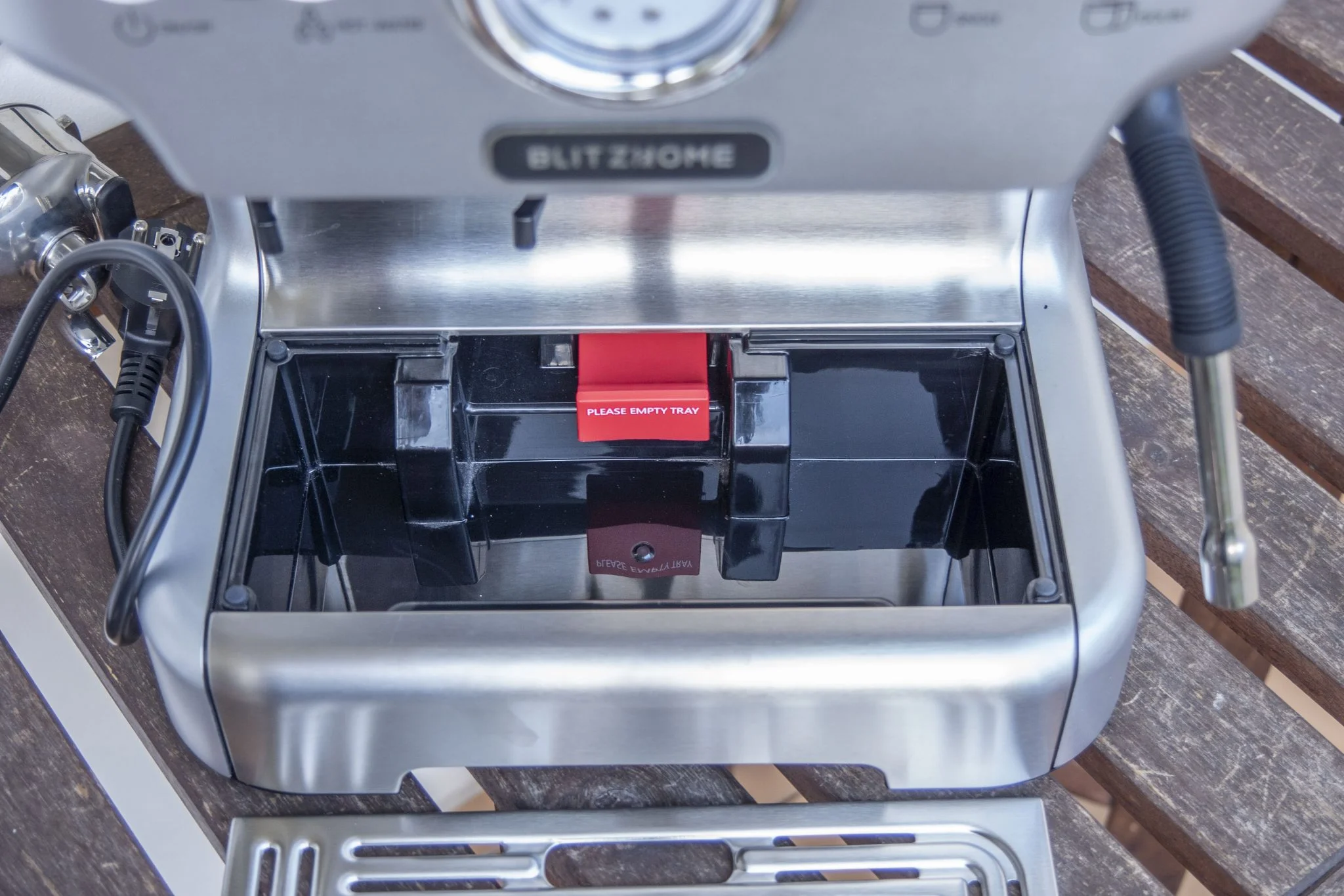 amit több módon is elő lehet állítani. Van a kotyogós rendszer, ami gyakorlatilag egy vízforraló, ha megemelkedik a nyomás a melegítés hatására – kb. 1,5 bar és 120 fok -, akkor egyszerűen lefő kávé, de hát itt az ideálisnak mondott 92 Celsius fokos hőmérséklettől eléggé messze zajlik le a folyamat. A következő szint az integrált termo blokkos rendszerek, ahol egy szivattyúval felszívják a vizet, és megpróbálják nagyjából 92 fok körül tartani a hőmérsékletét, ahol már az aromák kioldódnak – ízesebb lesz a kávé -, de még nem ég meg az anyag. Általában a kávégép súlya választ ad arra, hogy egy kompakt termoblokkot vagy komolyabb, rézbojleres megoldást alkalmazott a gyártó. A BlitzHome esetében az előbbi került a lemezek alá, a hőmérsékletét viszont egy automata szabályozza és tartja az ideális 92 fokon.