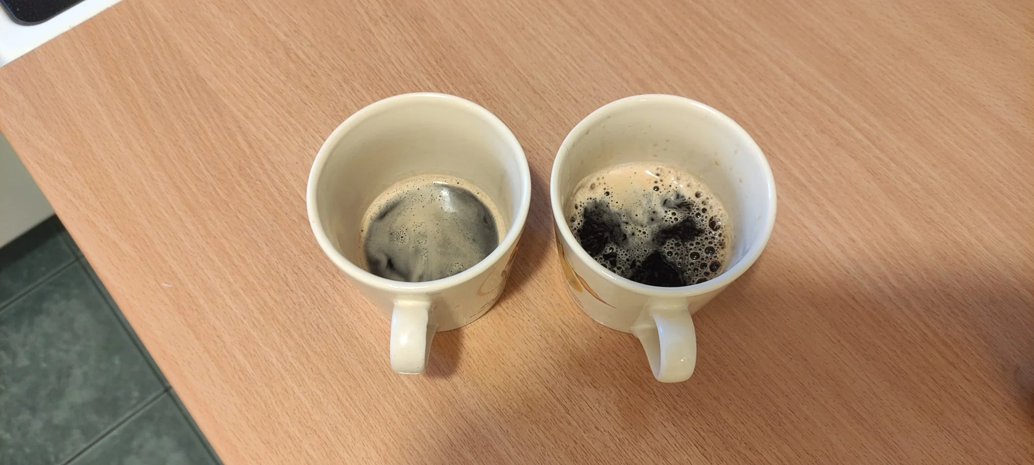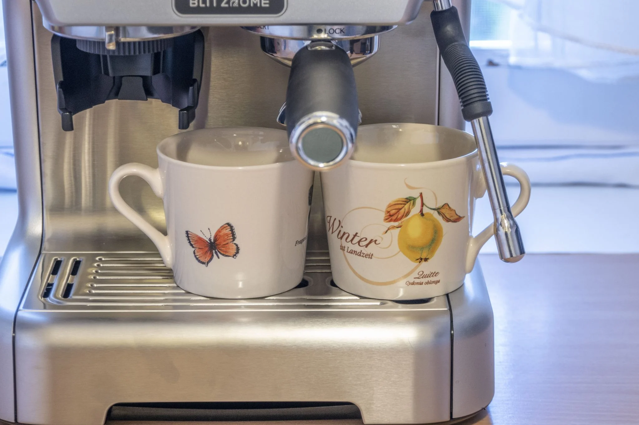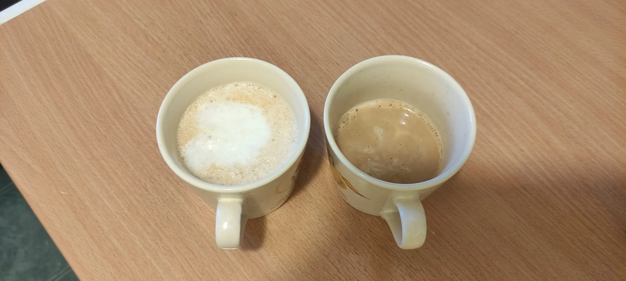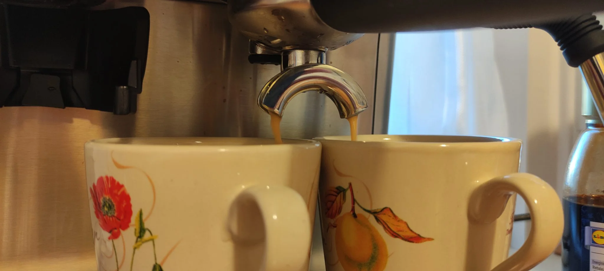 Feltettem a poharakat a kávégép tetejére, ahol van egy melegítő felület, megpróbáltam közepesre darálni a kávét – ez a 6-os 8-as skála a darálón – , feltöltöttem a „max” fokozatig a víztartályt, szépen egyenletesen, két adag darálékot is tömörítettem, felraktam a szűrőtarót a helyére, aztán hadd szóljon. A nyomást ekkor éppen eltaláltam, de úgy voltam vele, hogyha már két adagot főztem le, akkor az egyikből legyen cappucino, a másikból pedig hosszú kávé. Előbbihez tejet kell gőzölni, amit a jobb oldali tekerőkapcsolóval lehet megtenni, és némi előmelegítés után ömleni kezd a gőz. A gőzölés után a felesleget a gép magától kiengedi a csöpögtető tálcára, vagyis mégiscsak van benne valamilyen nyomáskiegyenlítő szelep.