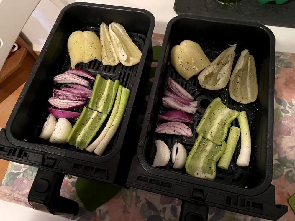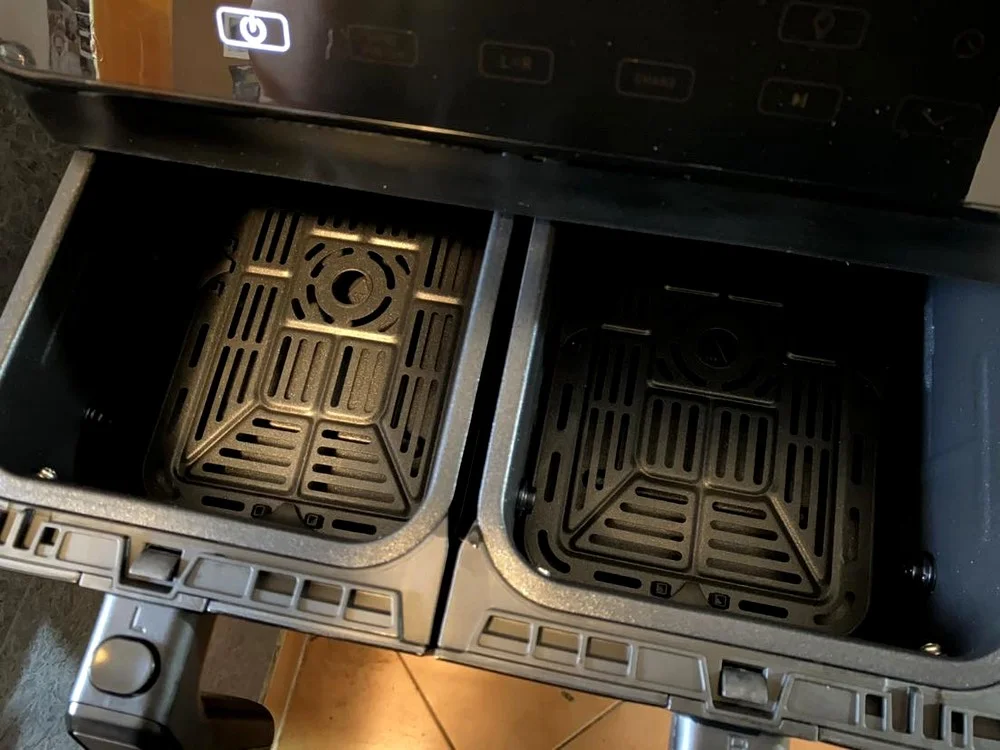 Imádtam az emlékeztető funkcióját, amit, ha bekapcsolsz, akkor minden félidőnél addig csipog, amíg meg nem rázod a kosarakat. Ebben az esetben így is, úgy is elveszik egy kis hő, amit pont azzal akart csökkenteni a gyártó, hogy mindkét kosár kapott egy-egy betekintő ablakot. Ezek alapvetően nagyon hasznosak… lennének, ha a fogók nem takarnák ki a közepüket, mert így nem sokat látni az ételből és muszáj többször kihúzni a kosarakat. Ebből kifolyólag minőségi lesifotókat sem nagyon tudtam lőni a kajapornóról, sorry.