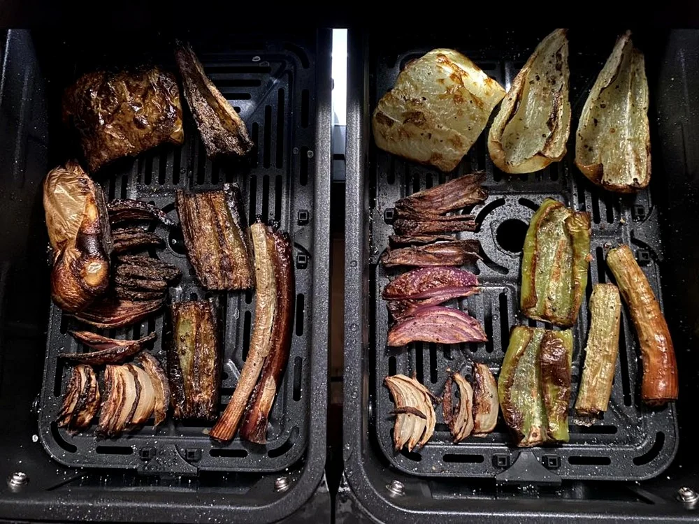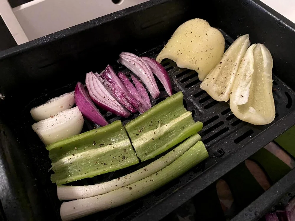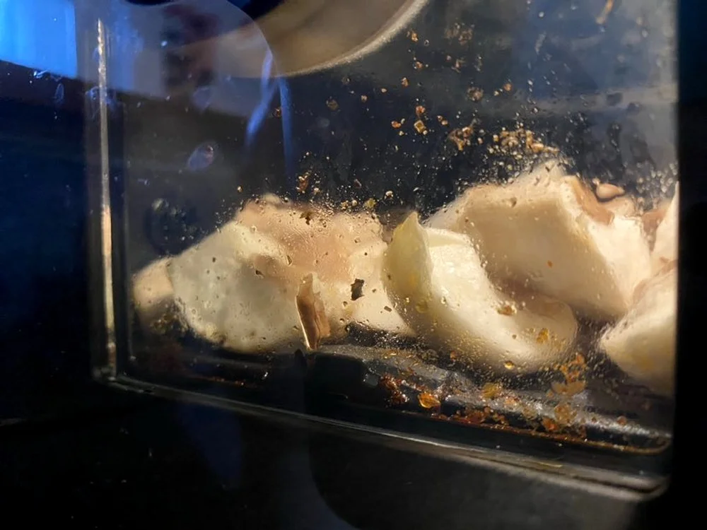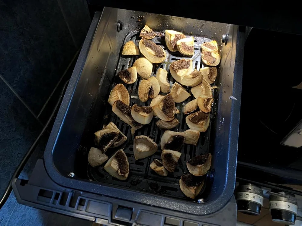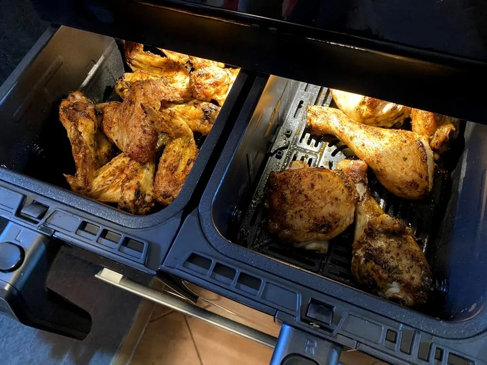 Az „air fry” alapprogram sült krumplihoz, karfiol falatokhoz, szárnyakhoz, nuggetsekhez és hasonlókhoz ajánlott, 195 °C-on, 15 percig végzi a dolgát. Már borítottam is bele az 1 kilogramm csirkeszárnyat, de szerencsére belepillantottam a részletes kis táblázatba, amit jól tettem, mert aszerint a csirkeszárnyaknak 200 °C-ra és 33 percre van szüksége. Ettől függetlenül elindítottam az alapprogramot, de a végeredmény számomra nagyon a határon táncolt, főleg, hogy az alaposabban átsült ételeket preferálom, így még visszatettem az ételt 18 percre a tökéletes végeredményért. Ez az egész folyamat még mindig egyszerűbb és gyorsabb volt, mint a sütőt bemelegíteni, előkészíteni egy tálcát sütőpapírral és 40-50 percig sütni a csirke alkatrészeket, félidőnél természetesen kiszedni és megforgatni mindet.