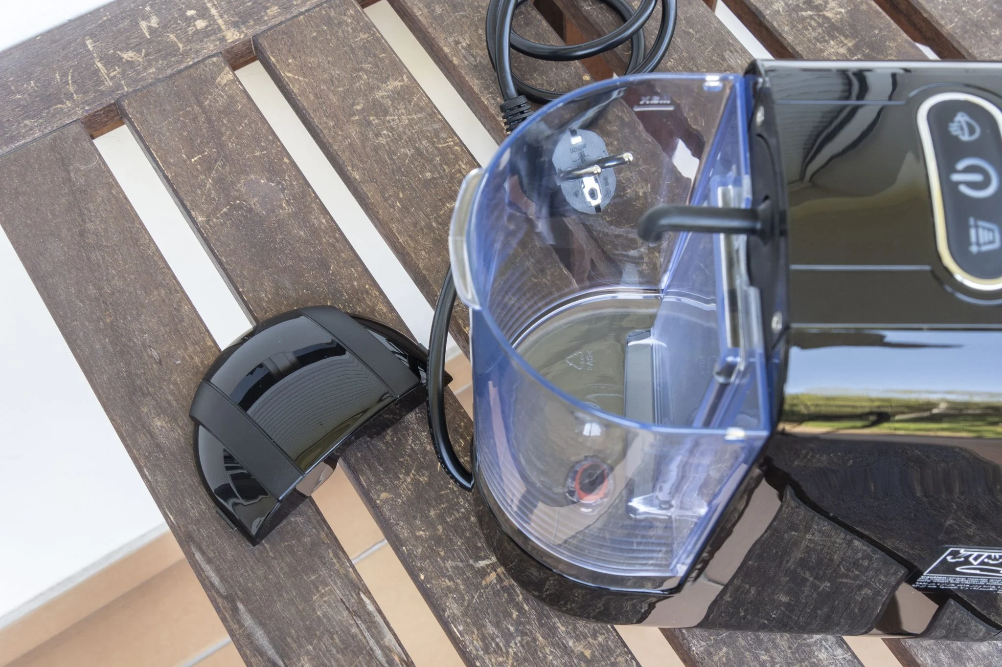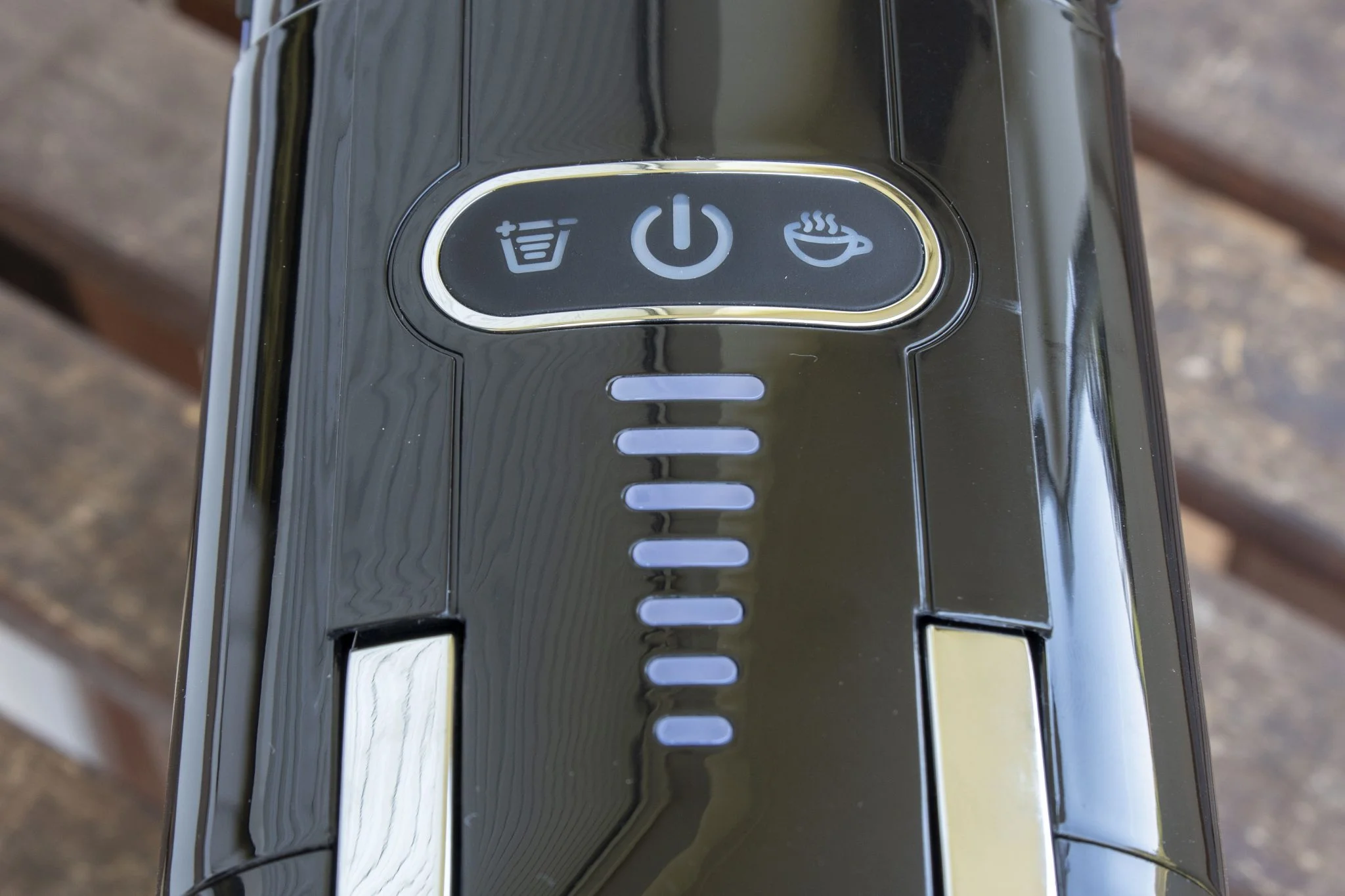 A szilikon felület alatt színes LED-ek helyezkednek el, amik az állapotokat mutatják, a zöld a kávé mennyiségét mutatja, a piros azt, hogy a folyadék forró lesz, a kék pedig a hideget jelenti, ez a jegeskávé készítését segíti, értelemszerűen hideg vízzel. A gombok alatti ezüstszínű karral lehet kilyukasztani a kávékapszulákat, a hátsó tartályba pedig a lefőzéshez használt víz kerül, szerencsés esetben valamilyen ásványianyag csökkentett folyadék, min a Norda ásványvize. Egyetlen trükk van, amit meg kell szoknotok, a kávé hosszának beállítása. A legalacsonyabb egyes fokozat az eszpresszó mennyisége, a kettes a lungo vagyis a hosszúkávé, de az ötödik már egy americano, a maximális 7. meg egy fél liternyi hosszú kávé. Nem tudom, ezt ki fogja használni, de aki szeretne nagyon lágy kávét főzni rettenetes mennyiségben, annak adott a lehetőség.