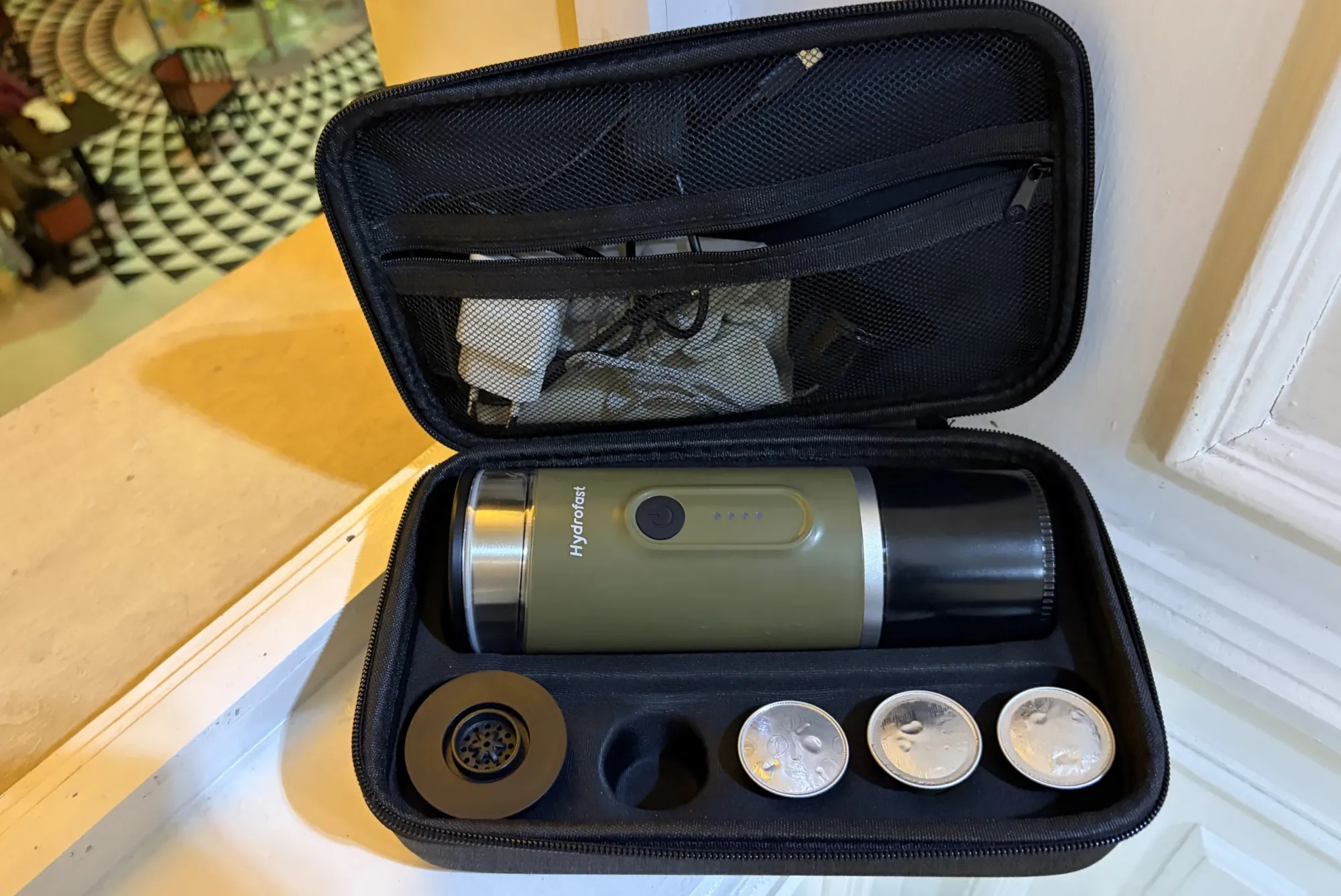Ki ne gondolta volna a helyemben erről a katonazöld színű, műanyag és rozsdamentes acél összetételéből készült masszív hengerről, amelynek puszta méret (70x70x210 mm) és tömeg (0,75 kg) aránya is tartósságérzést kelt, hogy nem állja ki a mindennapok megpróbáltatásait. És nemcsak a kávéfőző, az utazótáska, amiben érkezett, a tartozékok és kiegészítők – a kapszulatasak, az USB-C töltőkábel, a kávé adagolókanál, az őröltkávé tartály, a felhasználói kézikönyv – mind-mind azt sugallták, hogy minőségi és praktikus készülék, amelyre nyugodtan rábízhatom a napi kávészükségletemet.