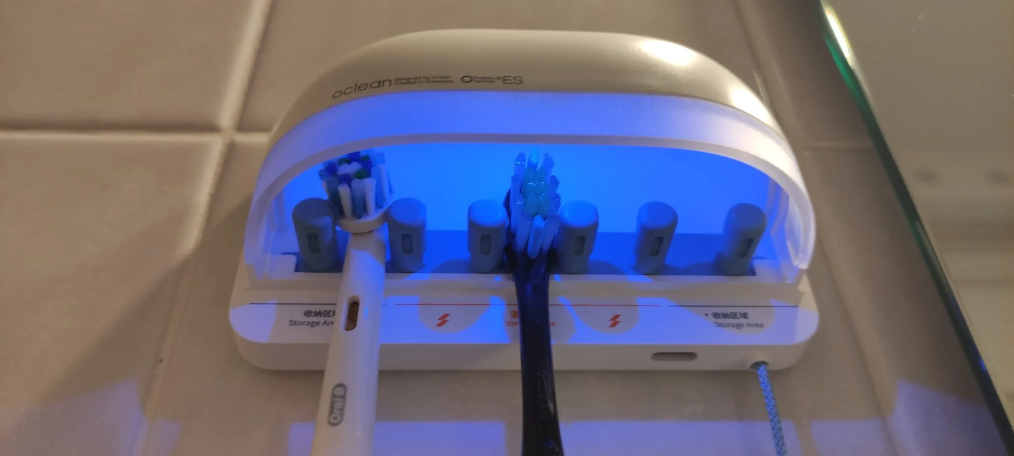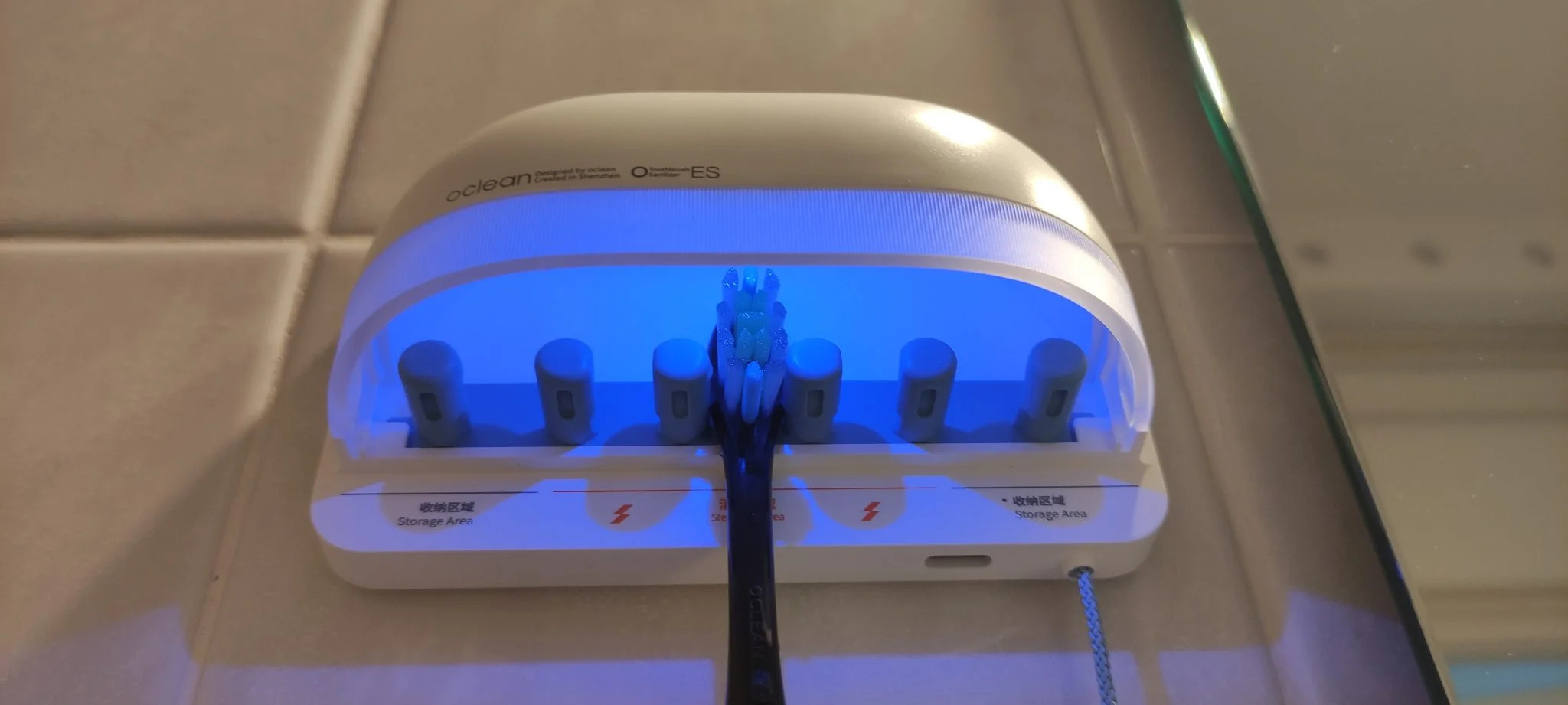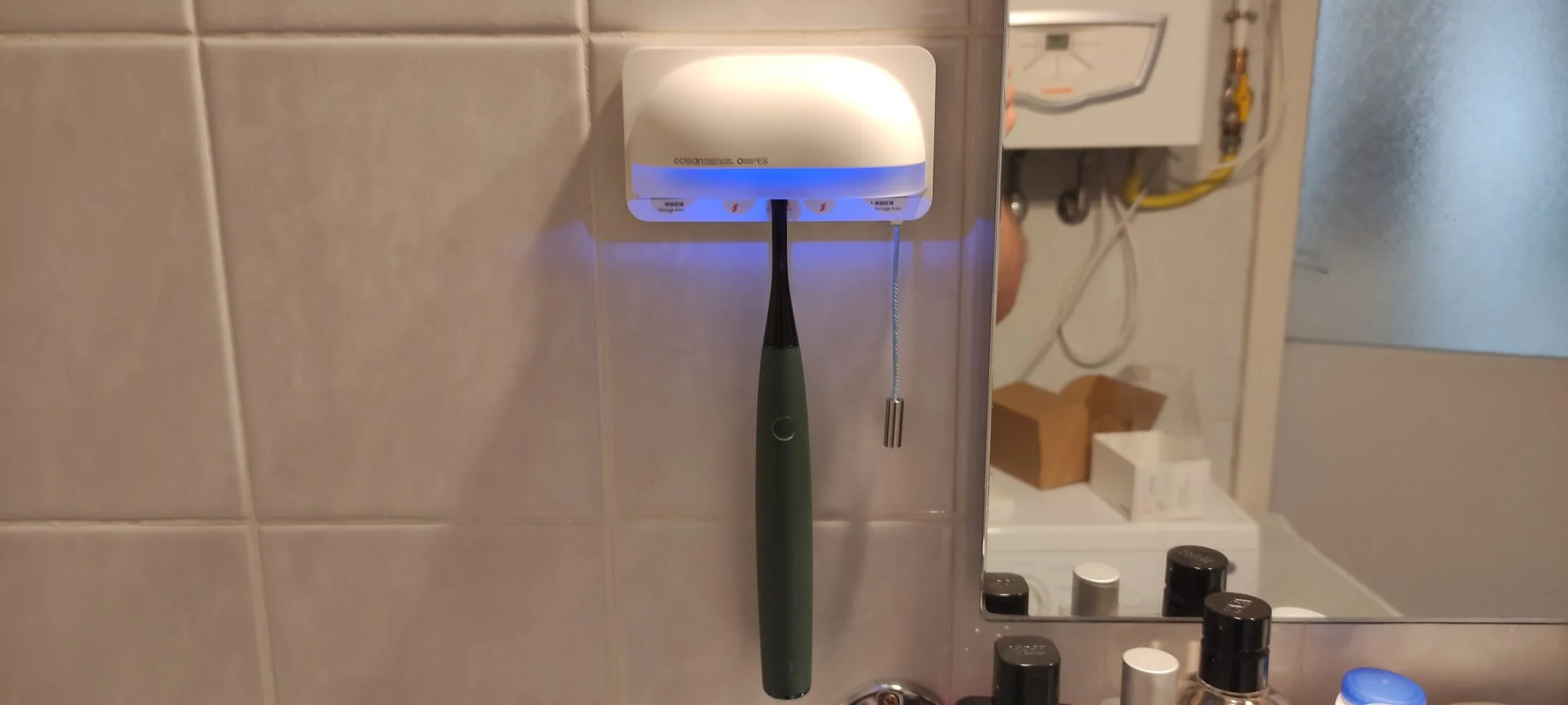 ilyenkor értelemszerűen le kell venni a falról, ezért is van hozzá egy külön platni, ami felragasztható, így a S1 erről lepattintható. A sterilizálás a kilógó zsinóros kapcsolóval indítható két lépésben. Aktív állapotban az eszköz 6 óránként automatikusan sterilizál, illetve újabb meghúzásra egyből el is indítja a folyamatot. Van rajta egy kicsi indikátor LED, ami mutatja a töltöttséget, ha piros, akkor kell Type-C portos áramforrásra rádugni. Próbaképpen beletettem régebbi elektromos fogkeféket, és azok is tökéletesen elférnek benne, akkor is, ha forgókefések.