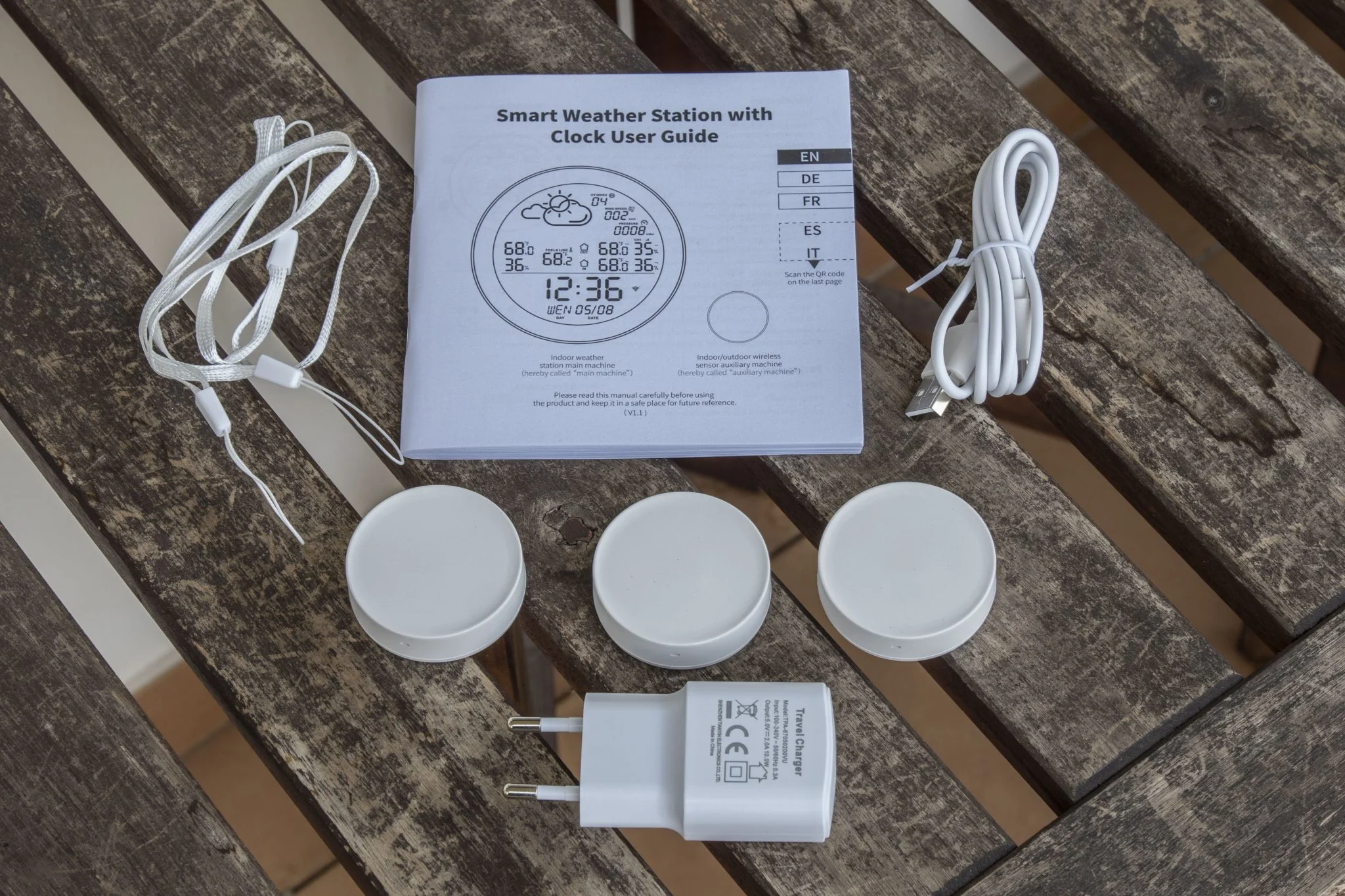 A nyomozásom végére szépen össze is állt a fejemben a dolog, hogy itt bizony egy komolyan vehető termékről van szó, nem pedig unalmas múltidézésbe fogunk fulladni. Első dolog, hogy kétféle csomagban árulják, az egyszenzoros kerül annyiba, amennyit a bevezetőben írtam, de van egy háromszenzoros pakk is, ezért némileg többet kell fizetni. A dobozban a központi egységen túl nálam 3 szenzor kapott helyet, ami mellé jár 3 kis „csuklópánt”, amivel fel lehet akasztani őket szinte bárhová. Sajnos minden micro USB-vel operál, így bekerült egy ilyen végződésű kábel és egy töltő is. A leírást érdemes forgatni, mert elég brutális, mi mindent tud a termék, plusz a párosítási logikát is innen nézhetitek ki.