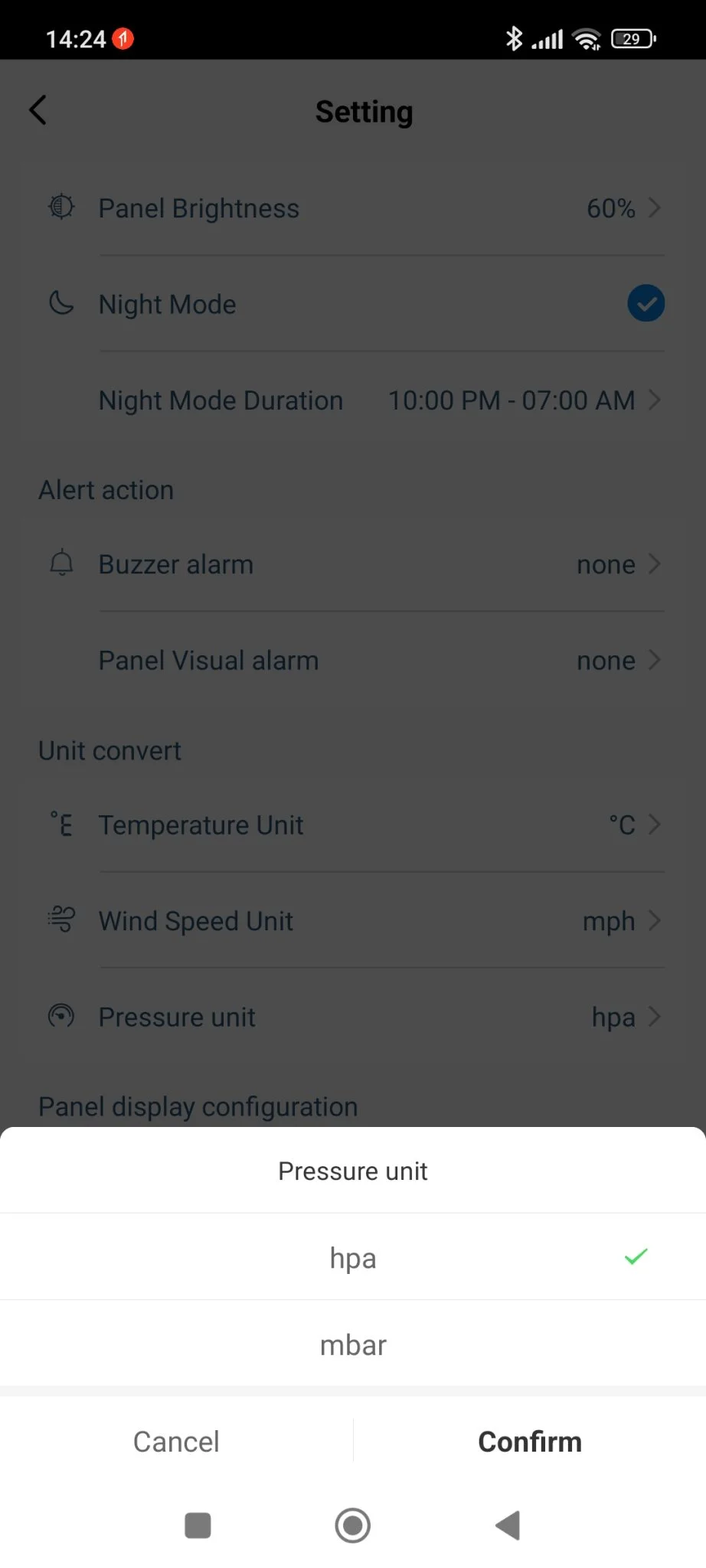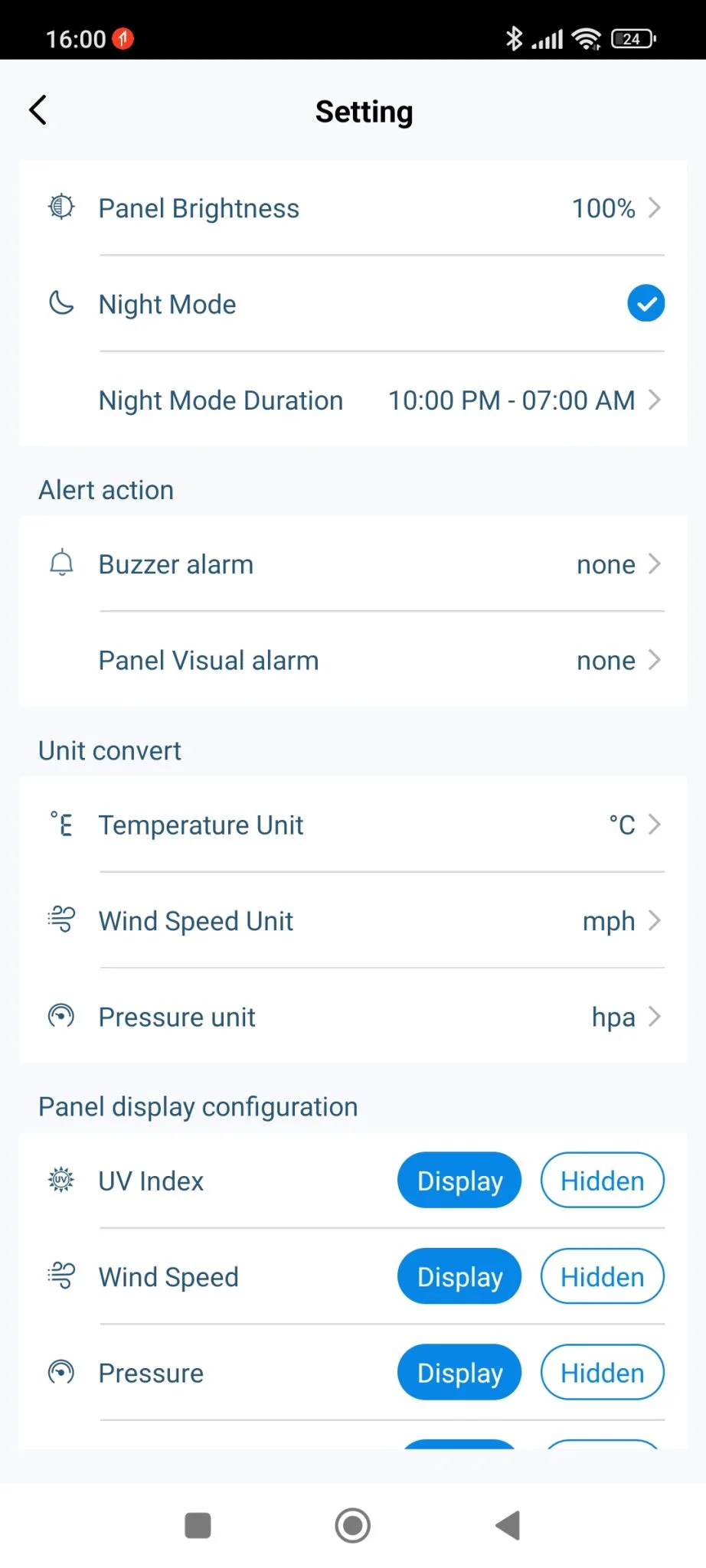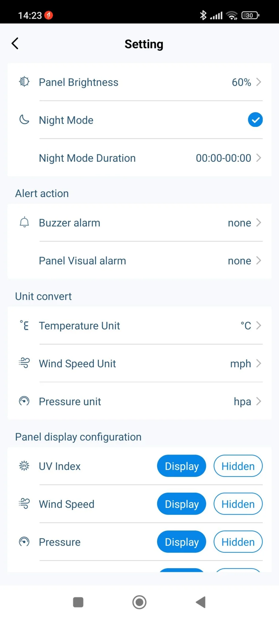 Ezek nemcsak passzív számkijelzések, hanem meg is lehet nyomni a „fejlécet”, itt gyakorlatilag ugyanazt végre tudjátok hajtani, amit a manuális gombokkal is lehet a központi állomáson, plusz még néhány dolgot. Például levehetitek a nektek nem tetsző információkat a képről, ennek ugyan semmi értelme, mert ott fix helyük vannak, és így furán néz ki az üres kijelző, de a lehetőségetek megvan rá. Lehet időzíteni az alábbiakat: éjszakai mód csökkentett fényerővel, ébresztő hang és vizuális alapon – villog a képernyő -, illetve variálhatjátok a mértékegységeket is az adott értékek mellett.