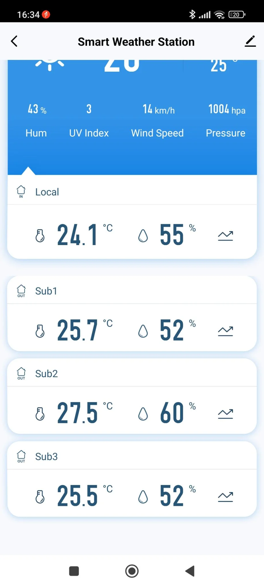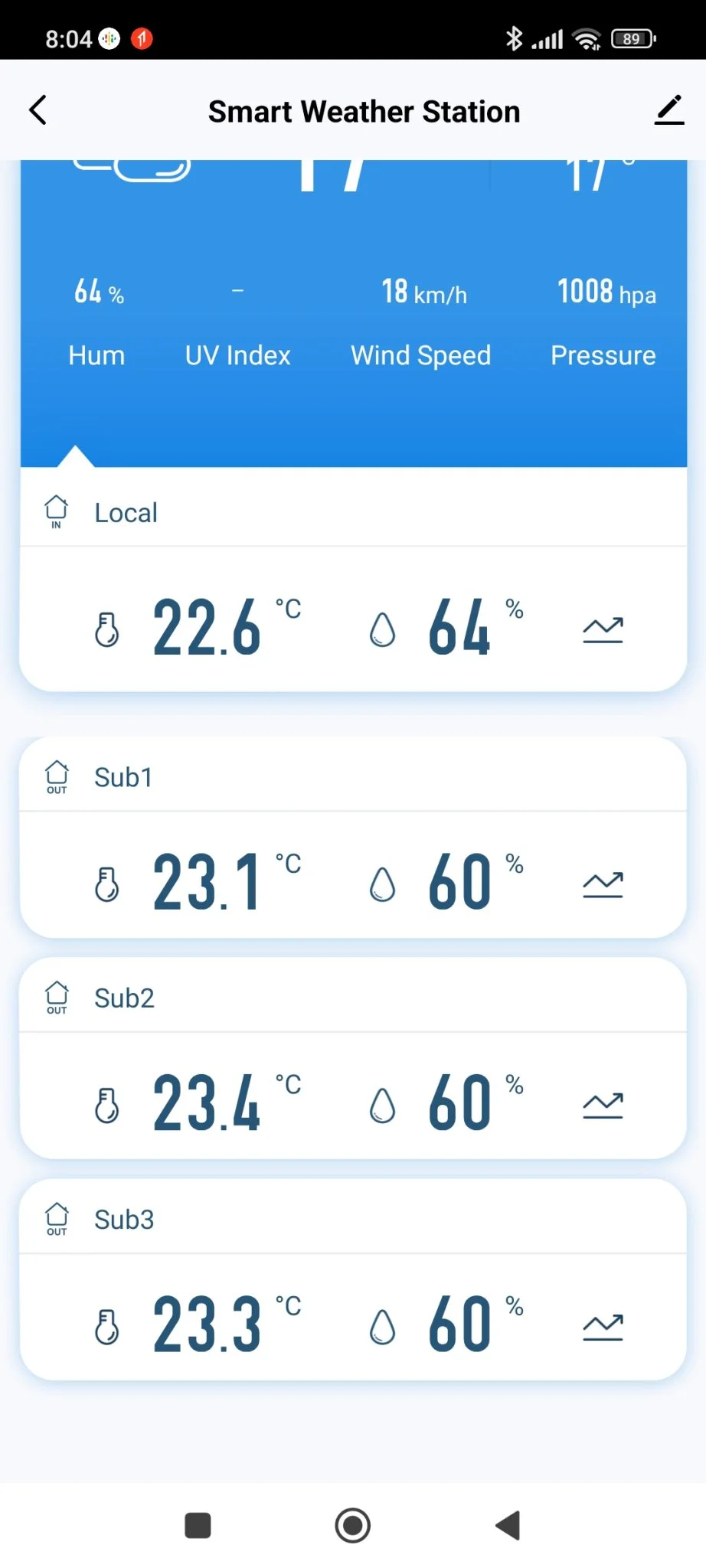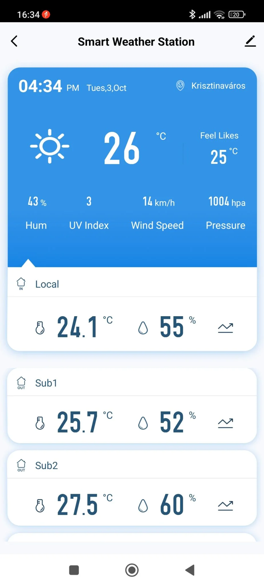 Sajnos nem tudom, mennyi időt bírnak ki egy feltöltéssel, de mivel szükségem volt az adataikra, egy órányi töltögetés után párosítottam őket a központi egységhez, így az appban a nyitóképernyőn egyszerre láthattam 4 különböző hőmérséklet és páratartalom értéket.