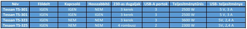 Az első kettő között csak annyi a különbség, hogy az egyik ténylegesen egy hosszabbító, van rajta egy 1,5 méteres kábel, ami pont arra jó, hogy feltegyétek egy alacsonyabb szekrényre, de akinek erre nincs igénye, az veheti az átalakítót is. A Tessan termékeket relatíve hasonló logika mentén alkották meg. Mégis vannak apró különbségek köztük, és mivel ebből egyik a teljesítménytűrés, ezért csináltam egy táblázatot rá, hogy könnyebben átláthatók legyen az adatok.