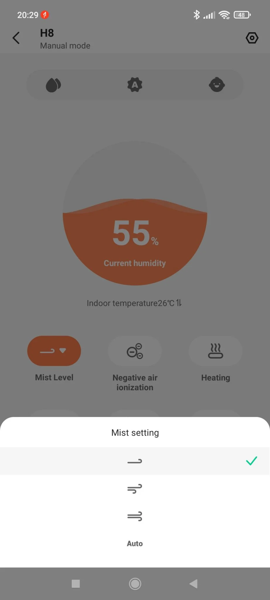 amikor egyszerre megy a plazma és a meleg pára kifújása, a kisdedek nagyobb komfortérzetéért. Léteznek még más, nem állítható paraméterei is a „baby” módnak, pl. az 55%-os páratartalom, ahol a H8 kikapcsol, hiszen elvileg a 40-60% közötti érték az ideális a legfiatalabb korosztálynak. Valamilyen megmagyarázhatatlan oknál fogva a kisbaba ikon 2 másodperces nyomásával lehet ki- és bekapcsolni az alsó atmoszférikusnak nevezett világítást is. Logikát ne keressetek benne, élőben jól néz ki, használtam, viszont az éjszakai mód ezt is lekapcsolja. A BlitzWolf BW-SH5 párásító tudott UV fényt is kibocsájtani, de mivel a H8-nak az appból állítható a színe, ez biztosan nem ultraviola.