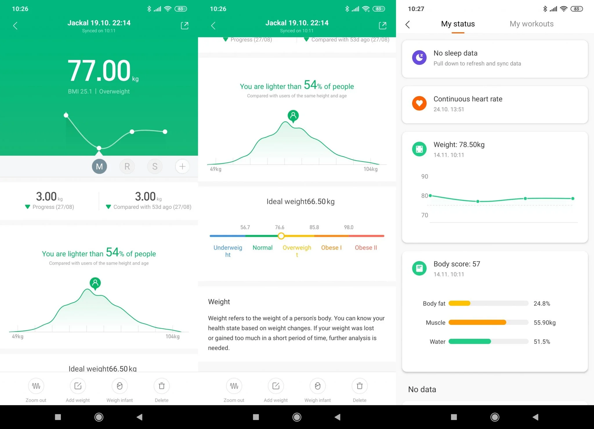 Na de mit is mér – vagy inkább helyenként tippel – a mérleg pontosan? Kijelzi a súlyt, a BMI indexet, a testzsírszázalékot, az izomtömeget, a víz- és a proteintartalmat, a zsigeri zsír mértékét, az alap metabolizmushoz tartozó pontszámot, csonttömeget, fizikai állapotokat korra vetítve, az IBW értéket – mennyi kalóriára van szükségetek -, a testtípust és az egészségetek skálázott értékét. Mint látható, van néhány nehezen értelmezhető, illetve származtatott adat, mint a BMI, amit akár ti is ki tudtok számolni, ha nagyon akartok. Minden ilyet helyén kell kezelni, ráadásul a visszaadott számok is nehezen ellenőrizhetőek.