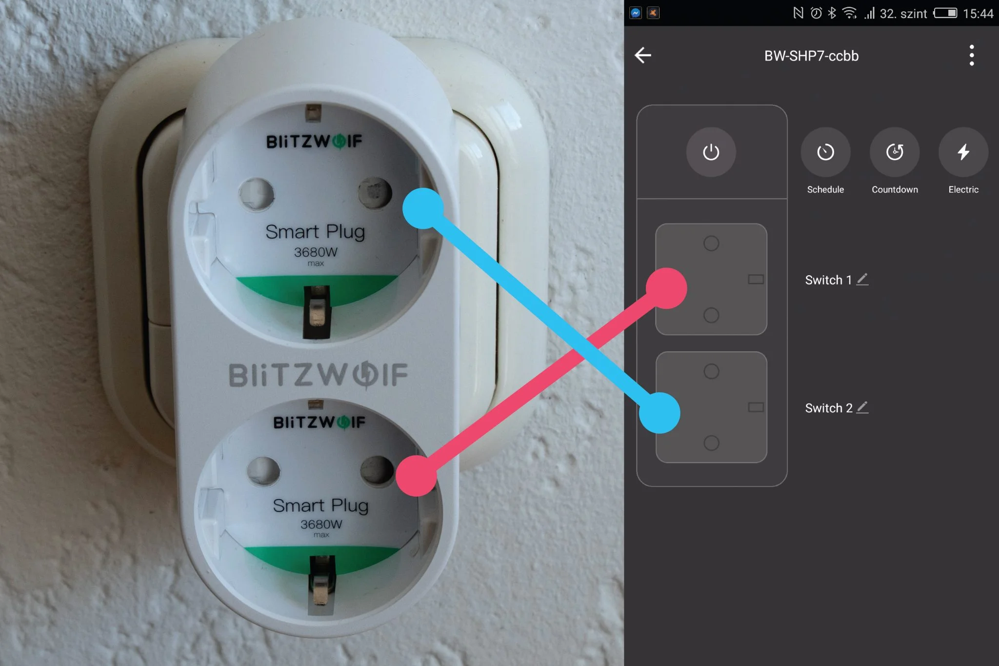 A két dugalj külön-külön működtethető manuálisan az oldalsó gombokkal, így az okosfunkciókat ejtve is kapcsolható, ami nagy pozitívum, mivel gyorsan és hatékonyan járhatunk el probléma esetén, konnektorrángatás nélkül. Ha azonban ki szeretnénk maxolni a kütyü adta lehetőségeket – és miért ne akarnánk? -, akkor le kell szedni a Blitzwolf applikációt, amibe integrálható a gyártó összes okosotthon eszköze. A szoftver nagyon jól működik, a kapcsolódás zökkenőmentesen megtörtént, csak aktiválni kellett hozzá a WiFit és a Bluetooth kapcsolatot is. Miután megtörtént az összelövés, máris minden funkció működött. Az SHP7 főképernyőjén látjuk a két foglalatot, amiknek saját nevet adhatunk (pl.: hősugárzó, dekor világítás, stb.), és egyszerre vagy egyenként kapcsolhatjuk is őket. Itt egy minimális esztétikai hiba azért belerondít az összképbe, mivel ha úgy dugjuk be a fali csatlakozóba, hogy a márkajelzés a megfelelő irányba áll, akkor az appban pont fordítva látjuk az eszközt. Ez a csatolt képen jól látszik, de ez tényleg csak egy apróság, ami nem befolyásolja a működést.