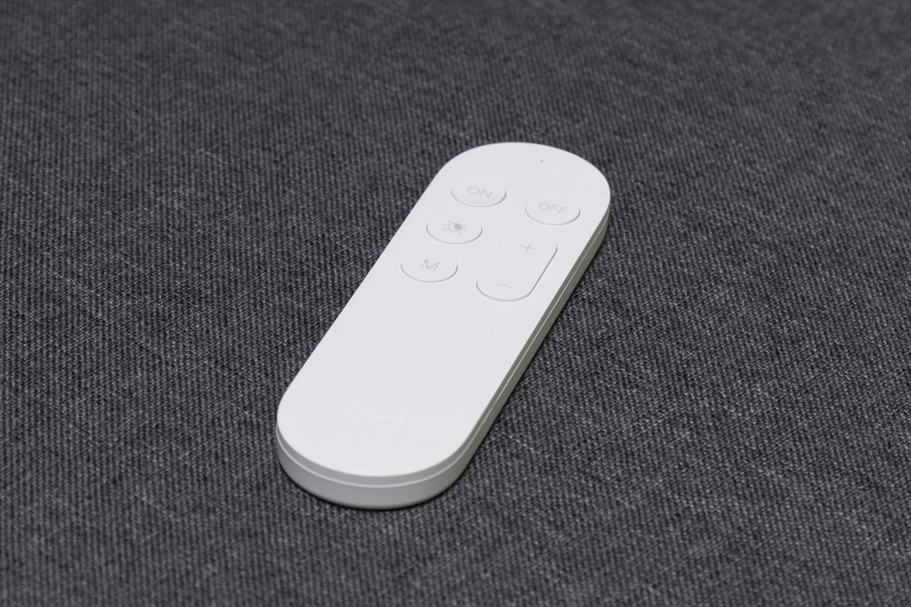 A távirányító szintén műanyagból készült, kellemes a fogása és a formája is. Gombelemmel működik, amit mellékeltek is a dobozban, a lámpához Bluetooth-on keresztül csatlakozik. Ennek előnye, hogy nem szükséges a világítótestre irányítani, hogy az vegye a jelet. Elég nagy szabadságot kapunk a gyártótól ilyen téren: egy lámpához több távirányítót is kapcsolhatunk, és egy távirányítóval akár több lámpát is irányíthatunk.