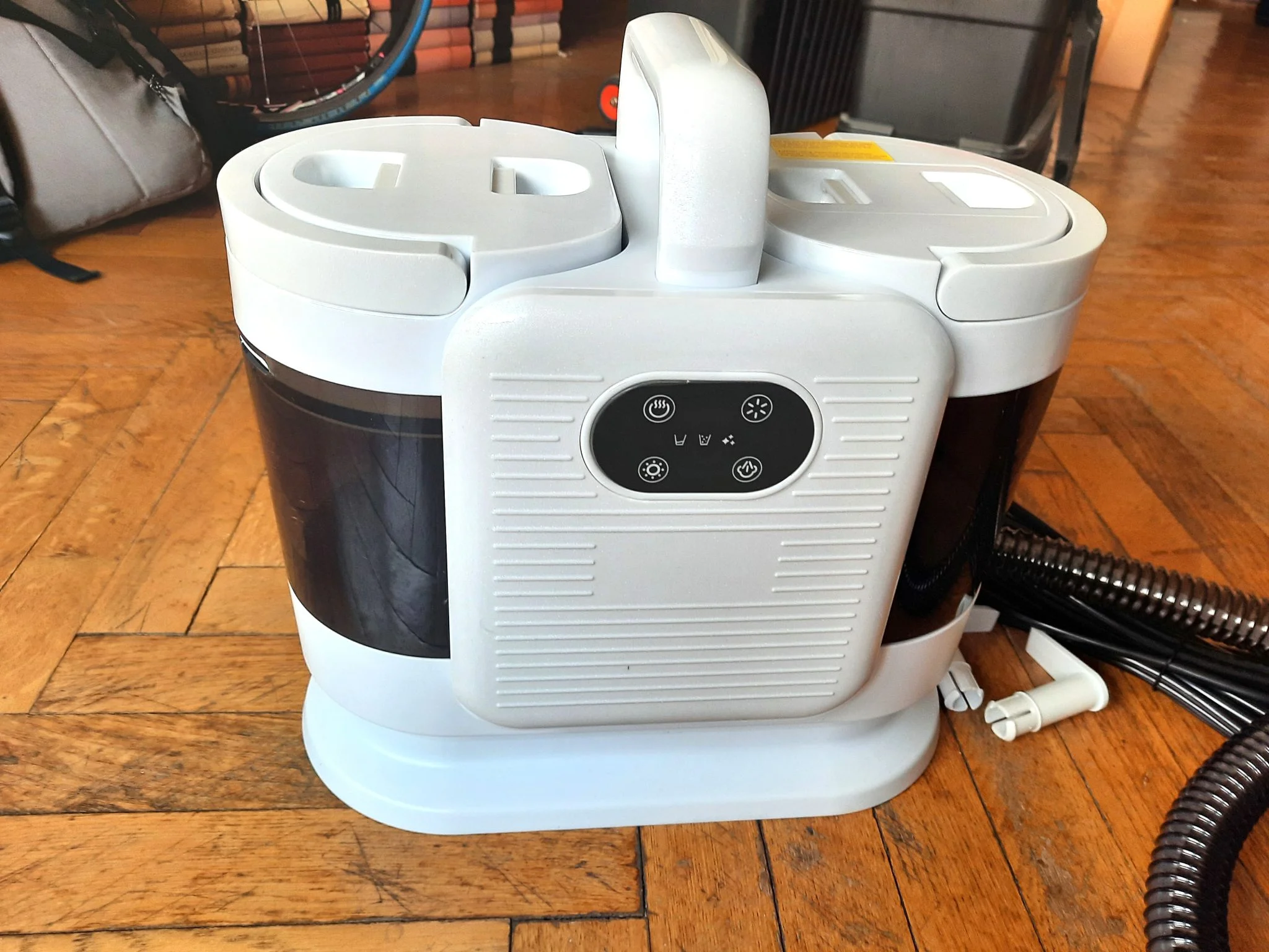 Első körben egy vízmentes porszívózás ajánlott, aminél máris kijön, hogy a manuálban szereplő 15 kPa (ami elméletileg 20) azért nem fogja berántani a szövetet, ráadásul a fej kiképzése miatt csak a stabilan és kitartóan megfelelő szögben tartott fej esetén alakul ki vákuum, ami a hathatós takarításhoz kell. Természetesen a fejen lévő kefe segítségedre lesz a nagyobb szennyeződések ellen és abban, hogy fellazítsa a szövet felső rétegét. Ezután jöhet a hidegvizes kísérlet. A módozatokat a készülékházon lévő panelen tudod váltani és megnyugtatásul, nemcsak az aktuális mód piktogramja vált megvilágítottra, de a szenvtelen női hang közli is az eredményt, minden alkalommal.