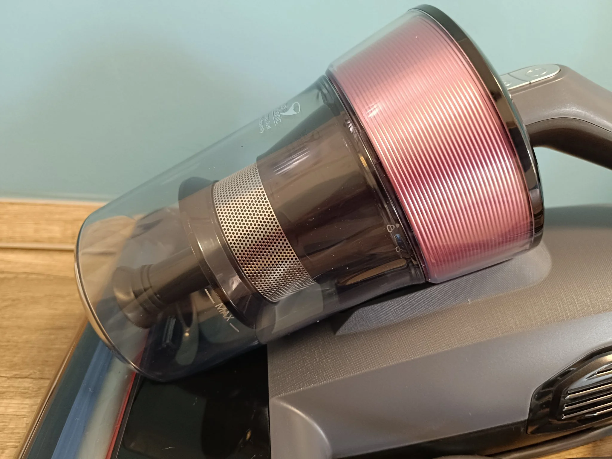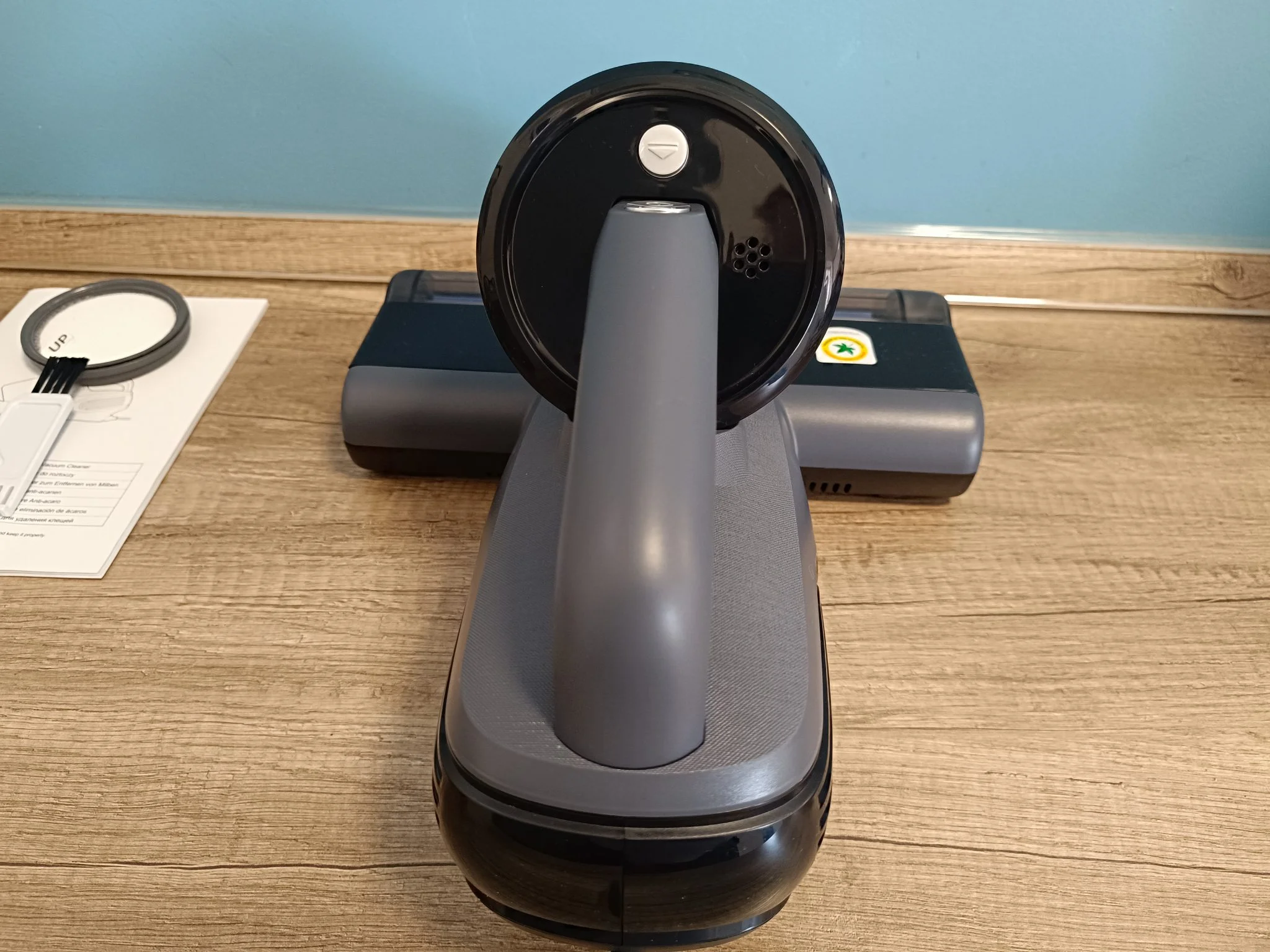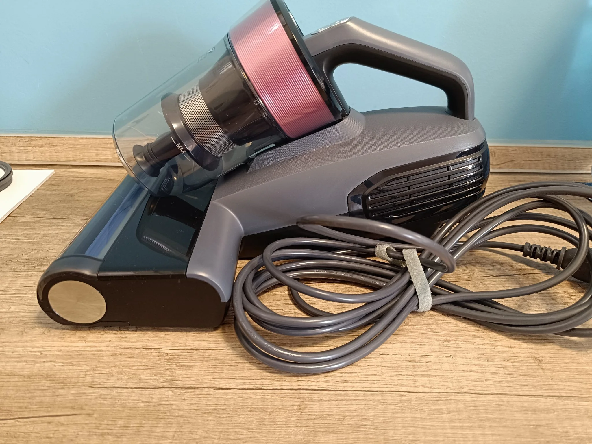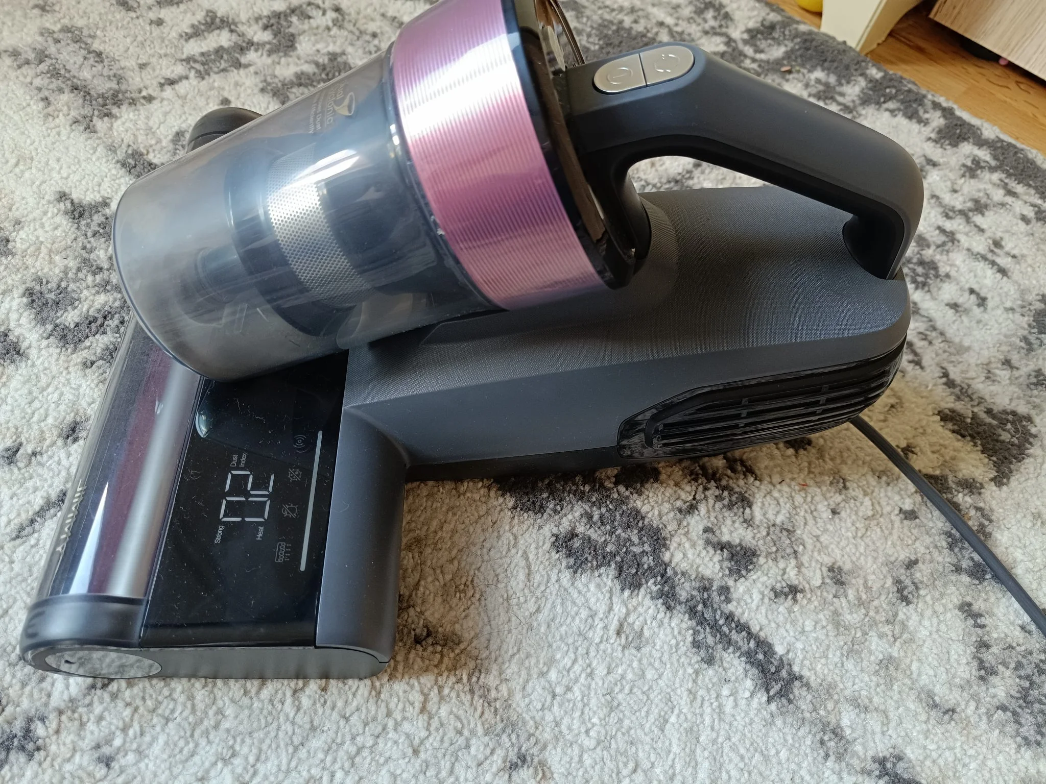 Az atkaporszívót hungarocellel kibélelt dobozban küldték és amikor abból kiszabadítottam, egy igazán letisztult dizájnnal készült cucc került a kezeim közé. Matt szürke, fényes fekete és mályva színek kombinációjából áll össze – nagyon bejön! Pont olyan darab, amit nem sajnálok, ha véletlenül nincs elpakolva, amikor váratlanul betoppan valaki. Ráadásul kisebb és könnyebb, mint a korábban nálam járt tesztalanyok.