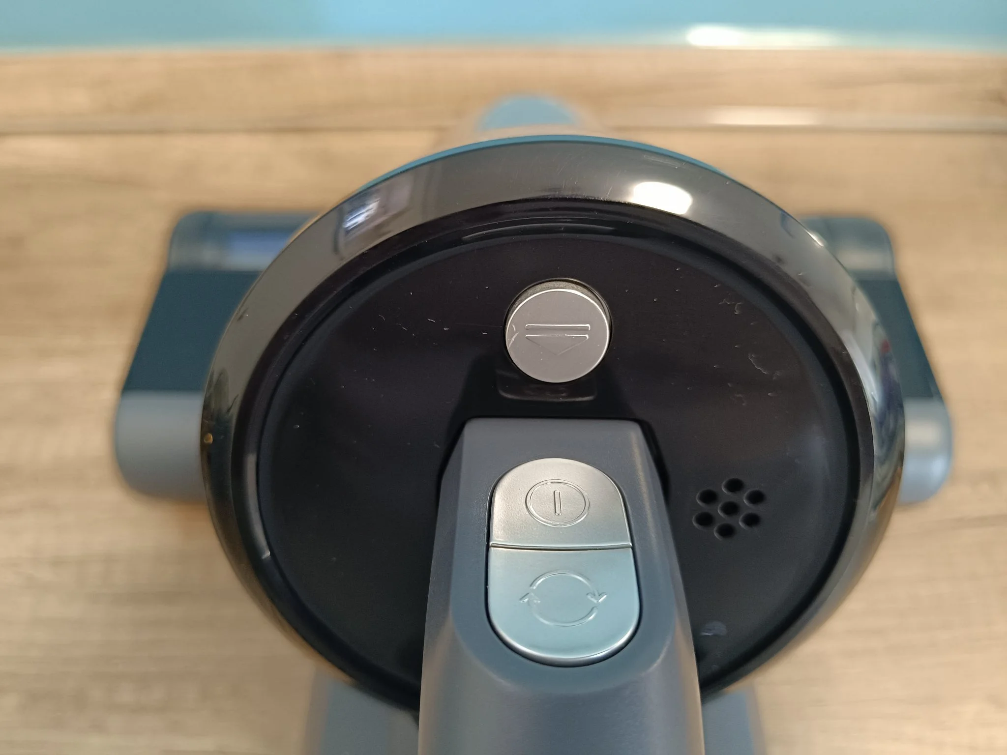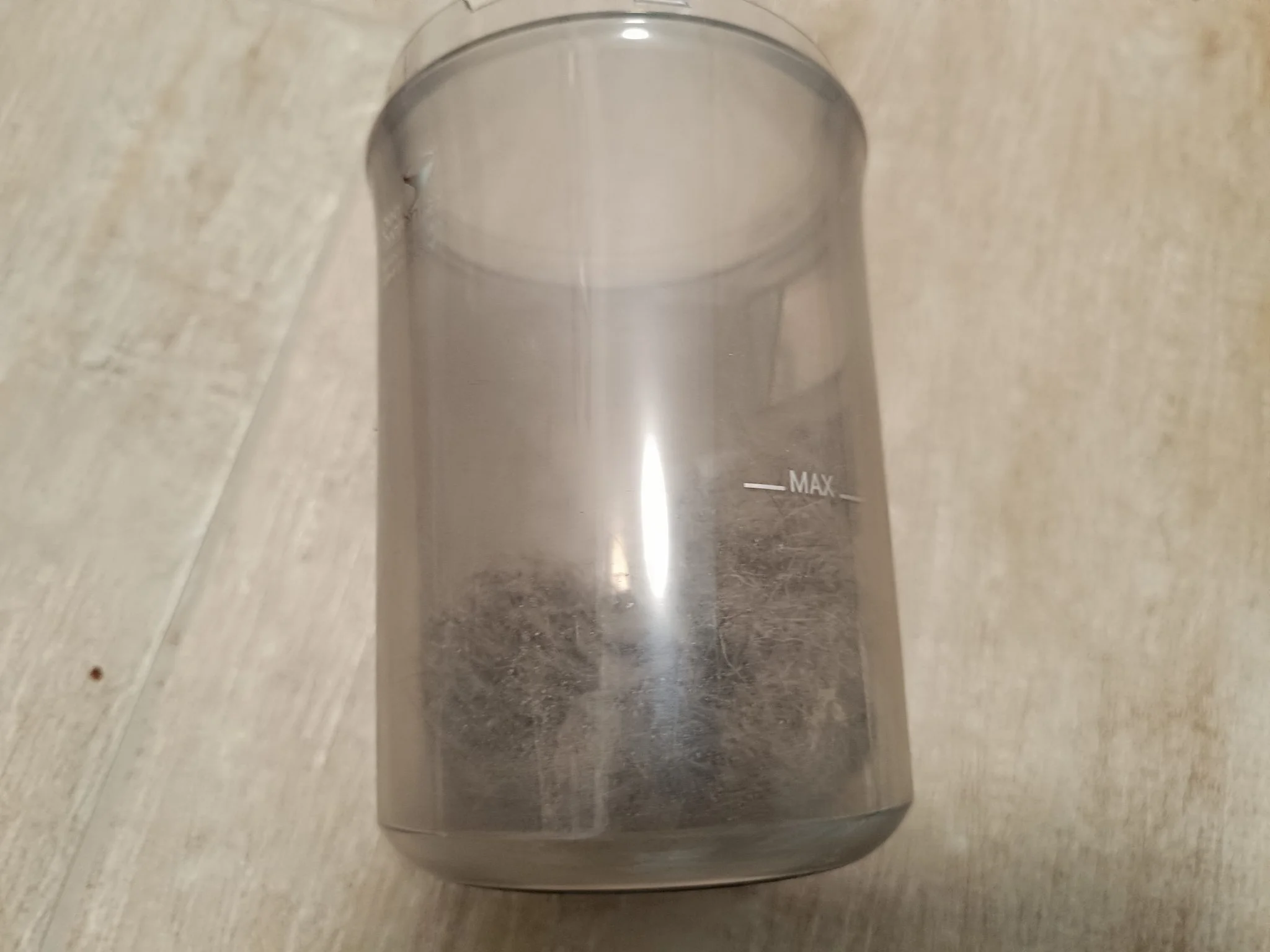 A motoros fej és a kijelző között helyezkedik el a fél literes portartály, ami egy (nehezebb) gombnyomásra kipattan a helyéről, és ha szétszedtük, csap alatt könnyen el is lehet mosni a szűrővel együtt. A készülék karbantartásában segítségünkre van még a tisztítóeszköz is, amellyel sikerült levágni a motoros keféről a rátekeredett hajamat.