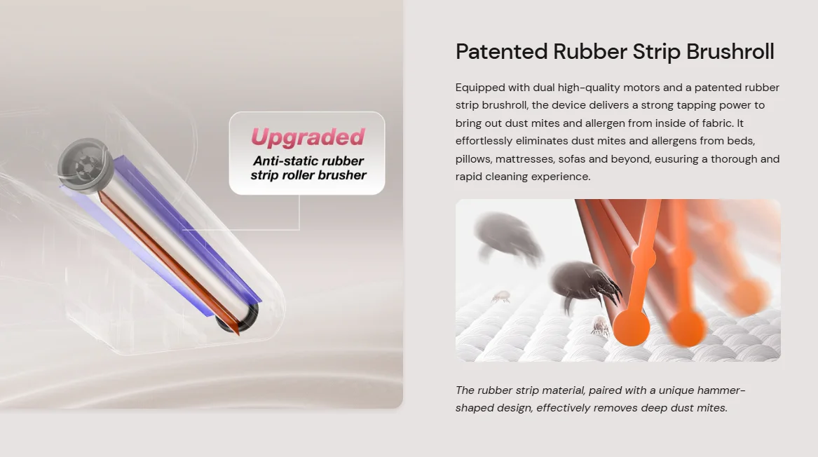 intenzíven ütögető mozgással, mechanikusan választja le az atkákat és más mikroszennyeződéseket a textilfelületekről.