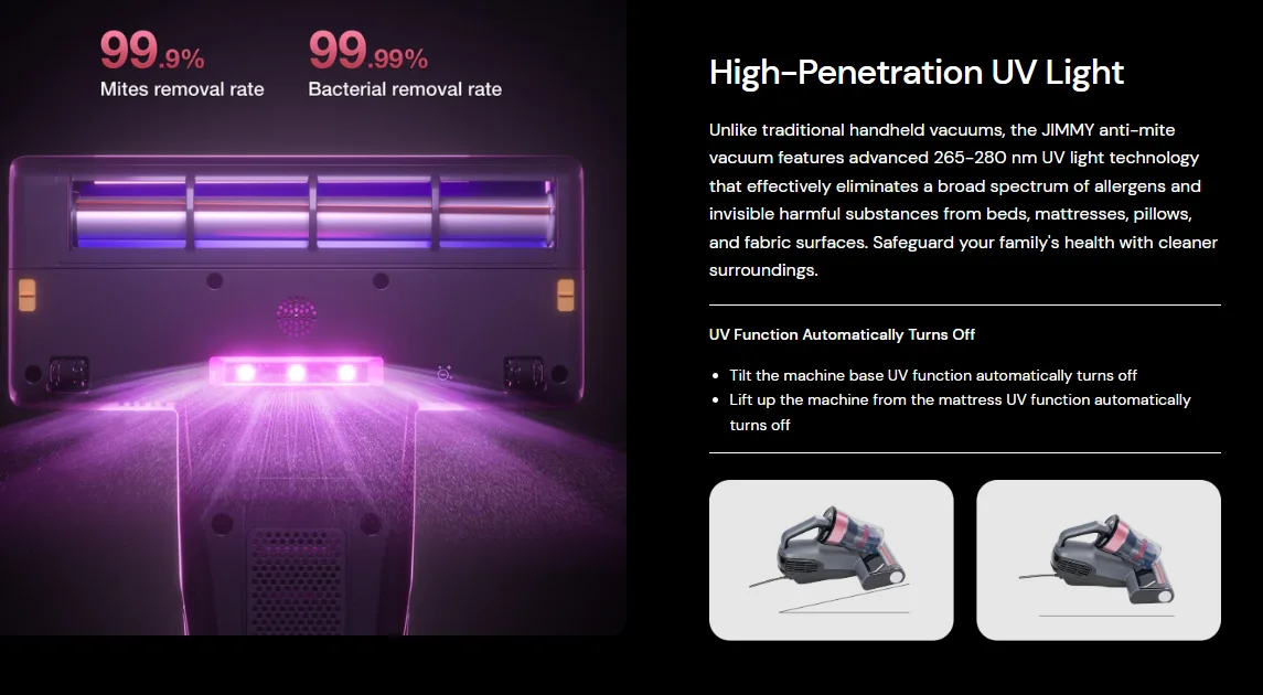 Ezt a hatást egészíti ki az UV-fény fertőtlenítő ereje, valamint a légáramlat, amely az eltávolított szennyeződéseket a tartályba juttatja. Az atkaporszívóba beépített biztonsági rendszer érzékeli a dőlésszöget: ha a készüléket a működés során enyhén megdöntjük, az automatikusan kikapcsolja az UV-fényt a felhasználó védelme érdekében – így külön gombot nem tartalmaz ennek manuális vezérlésére. A hőkezelés szintén része a tisztítási folyamatnak: a készülék akár 65 °C-ra is felmelegíti a tisztított felületet, ezzel tovább gyengítve az atkák túlélési esélyeit.