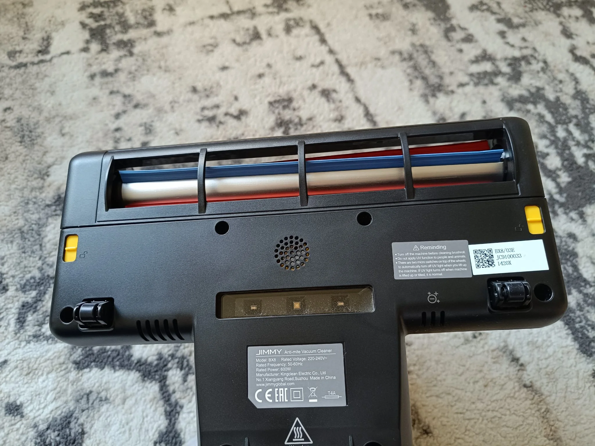 A felhasznált anyagokkal kapcsolatban itt is felfedni véltem némi gyengeséget a konstrukcióban, mint a JV35-nél: a gombok határozottan gyengécske műanyagnak tűnnek. Három gomb található a gépen: egy a bekapcsoláshoz, egy a fokozat megválasztásához és egy a portartály kipattintásához. A BX8 jó hosszú, 5 méter vezetékkel érkezik, így a doboz magán a készüléken kívül csupán egy plusz szűrőbetétet, egy használati útmutatót és egy tisztítóeszközt tartalmaz. A porszívó takarítására szolgáló kis eszköz két részből áll: az ecsettel a portartályt és a szűrőt tudjuk kitakarítani, valamint van egy vágó része is, amellyel a hengerkefére rátekeredett hajszálakat lehet egyszerűen levágni. A Jimmy honlapjáról szűrőbetétet is lehet rendelni a készülékhez, mégpedig innen.