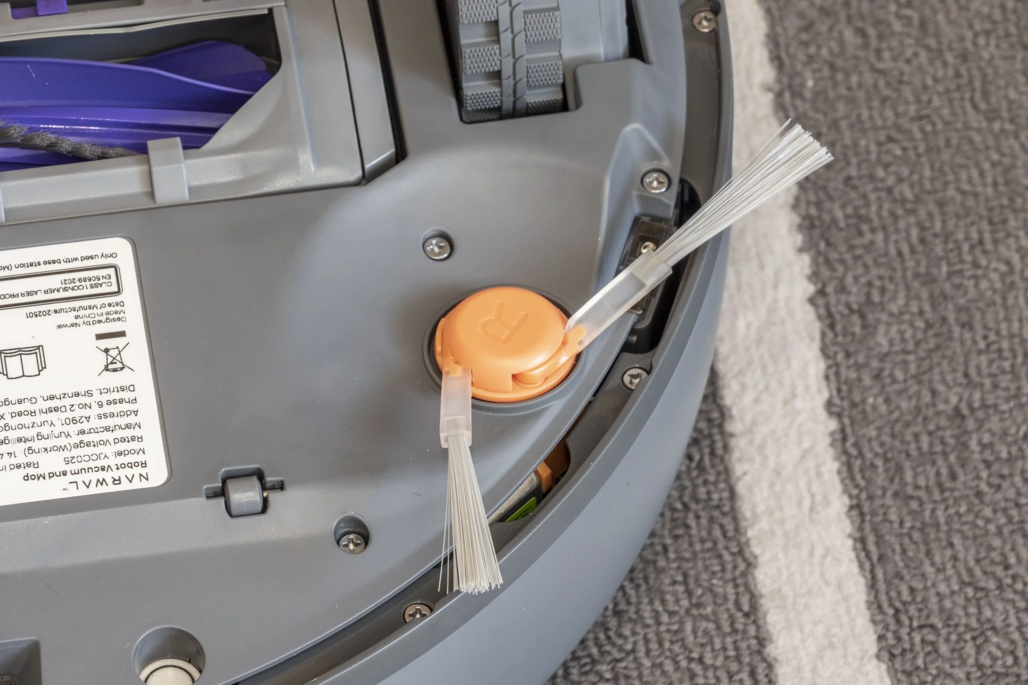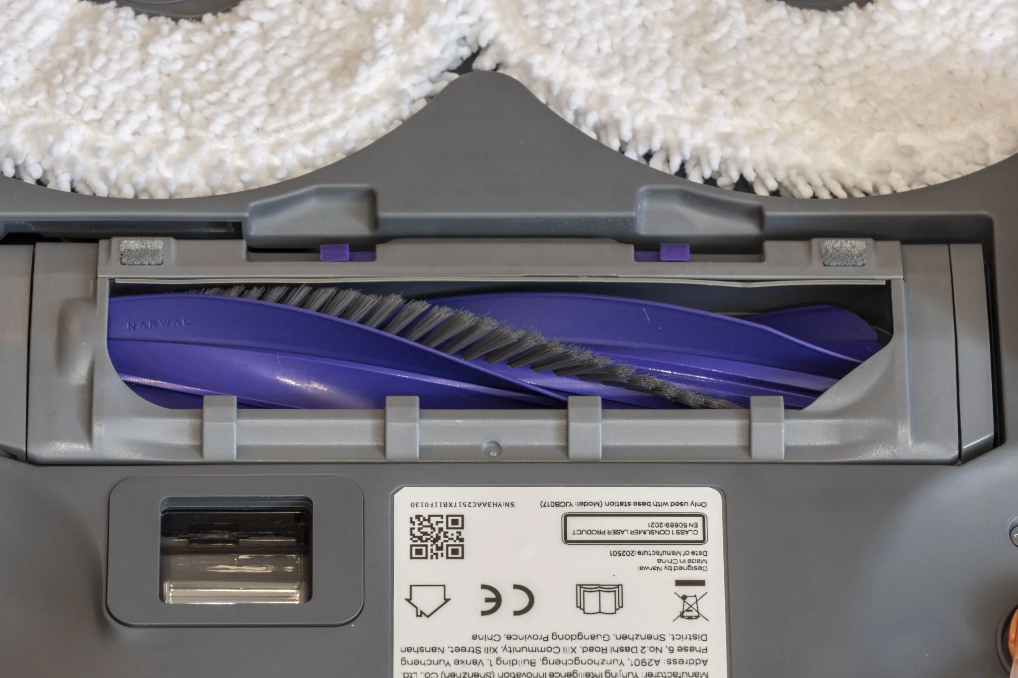 Kedvencem az oldalkefe kialakítása, ami egy befőttesgumit is le tud magáról dobni azzal, hogy középen összecsuklik, majd belöki a koszt a szívónyílás és az úszókefe elé. Ez utóbbit úgy tervezték, hogy az egyoldalt felfogatott, csavart kefe kitolja oldalra a haj és szőrszálakat, így nem tekeri fel azokat. Sajnos kisállattal nem rendelkezem, de a párom haját tényleg nem csavarta fel a kefe a tengelyére, ami nagy szerencse, mert kevés undorítóbb dolgot tudok magamnak kitalálni programként, mint ezt kisollóval levagdalni a keféről. Van továbbá egy extrája is, amit már a Narwal Freo Z Ultra is tudott: az összeszedett koszt tömöríti egy műanyag profil segítségével. Így már tényleg hihető a 120 napos automata porszívózás. Slusszpoén, amit eddig más eszközöknél még nem láttam: