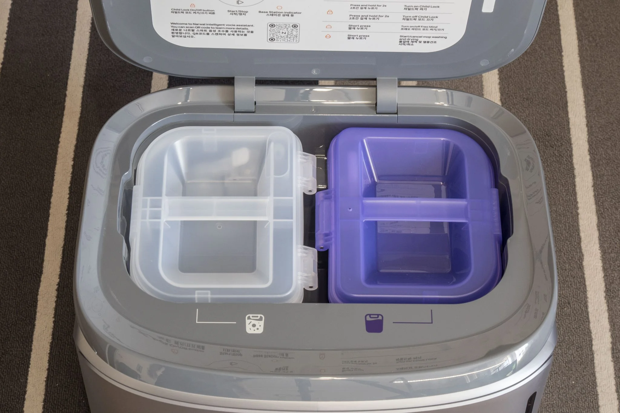 A vehemenseknek mondanám, hogy a tartályokat is nyissák ki, ugyanis egyes kellékanyagokat ide csomagolt el a gyártó, szóval mielőtt megküldenétek vízzel a rendszert, érdemes ezeket kiszedni. Ahogyan a felmosó folyadék tárolójáról is le kell szedni a lezáró matricákat, majd ezt követi a bekapcsolás, az app leszedése és a WiFi-re csatlakozás, szóval ez nem egy kétperces művelet.