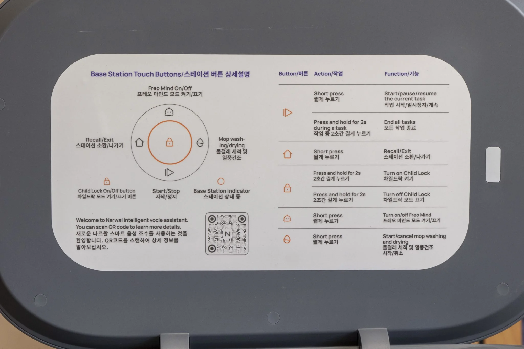 Az önürítő állomás tetejét kinyitva van egy elég jó magyarázó szöveg, ami arról tájékoztat, mit, mivel és hogyan lehet csinálni. Ha lecsukjátok a fedelét, jobboldalt egy OLED érintőpanelt láthattok, ezzel lehet elindítani a takarítást vagy az öntisztítást.