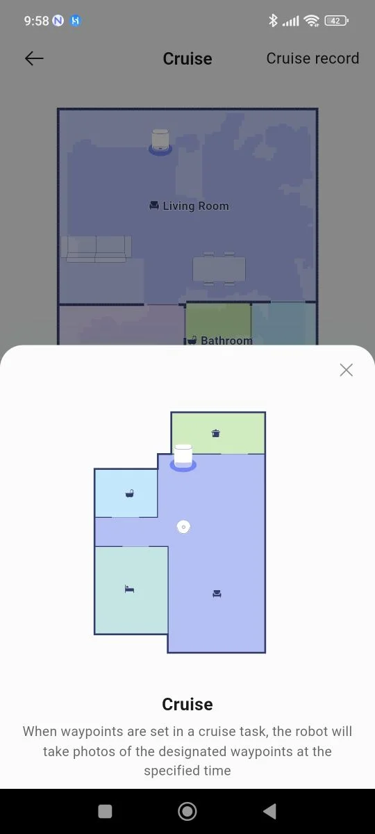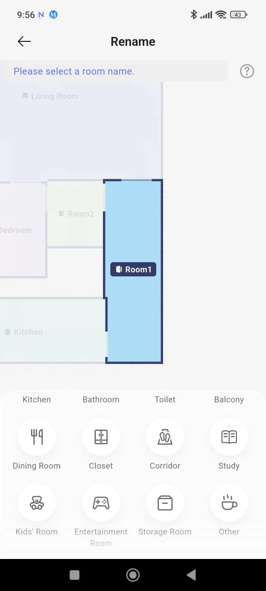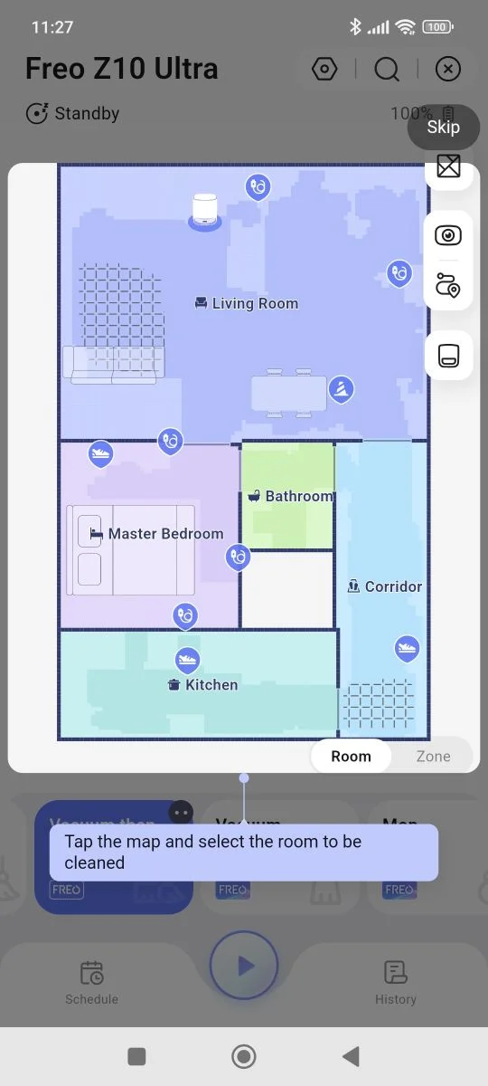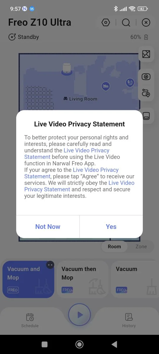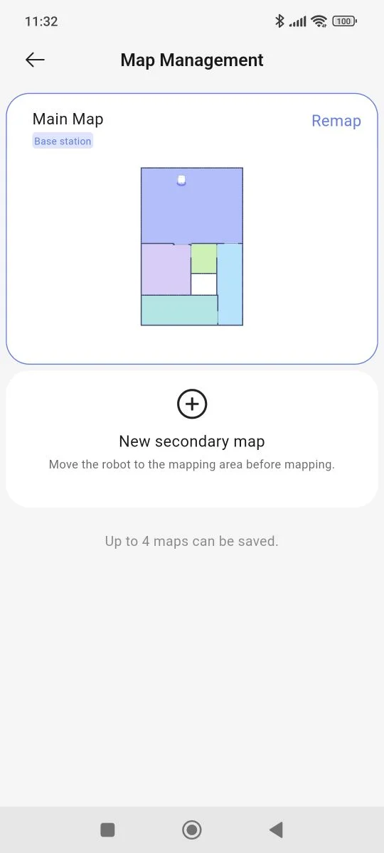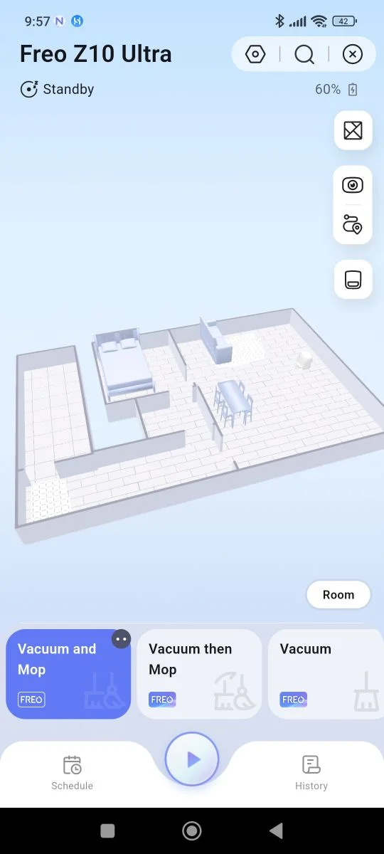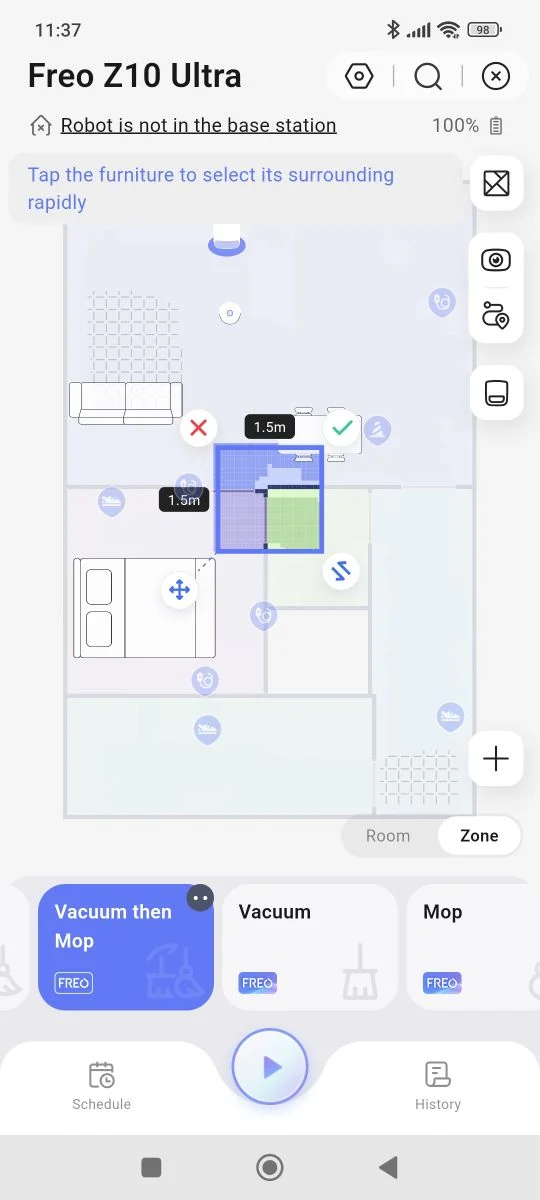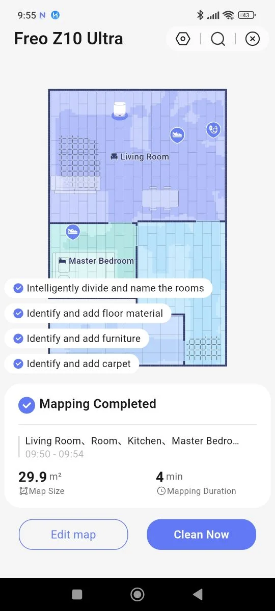A kezdőlapon a leendő vagy a már kész térképet láthatjátok. Van gyorstérképezés, amikor a robot csak körbeszalad, és megnézi, mi hol van. Ezt szó szerint kell érteni, mert a lézertorony mellett 2 darab Full HD kamerával is dolgozik, szerencsére az élőképhez való hozzáférést jelszóval lehet védeni. Teljesen ledöbbentem, hogy még a helyiségek funkcióit is nagyrészt eltalálta – kivéve a fürdőszobát és a folyósót -, berajzolta a szőnyegeket és a padlófelületeket teljesen magától, amihez a már említett tárgyfelismerést használta. Például tudja, hogy melyik a kanapé, a konyhabútor, a szőnyeg, még az ágyunkat is felismerte, ijesztően hatékony.
