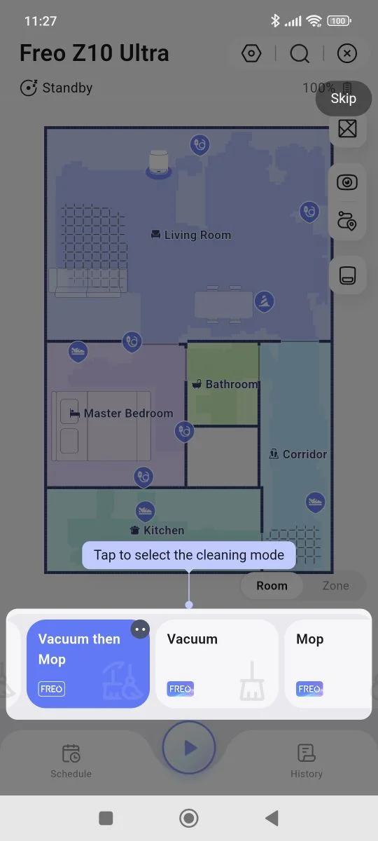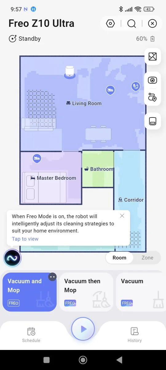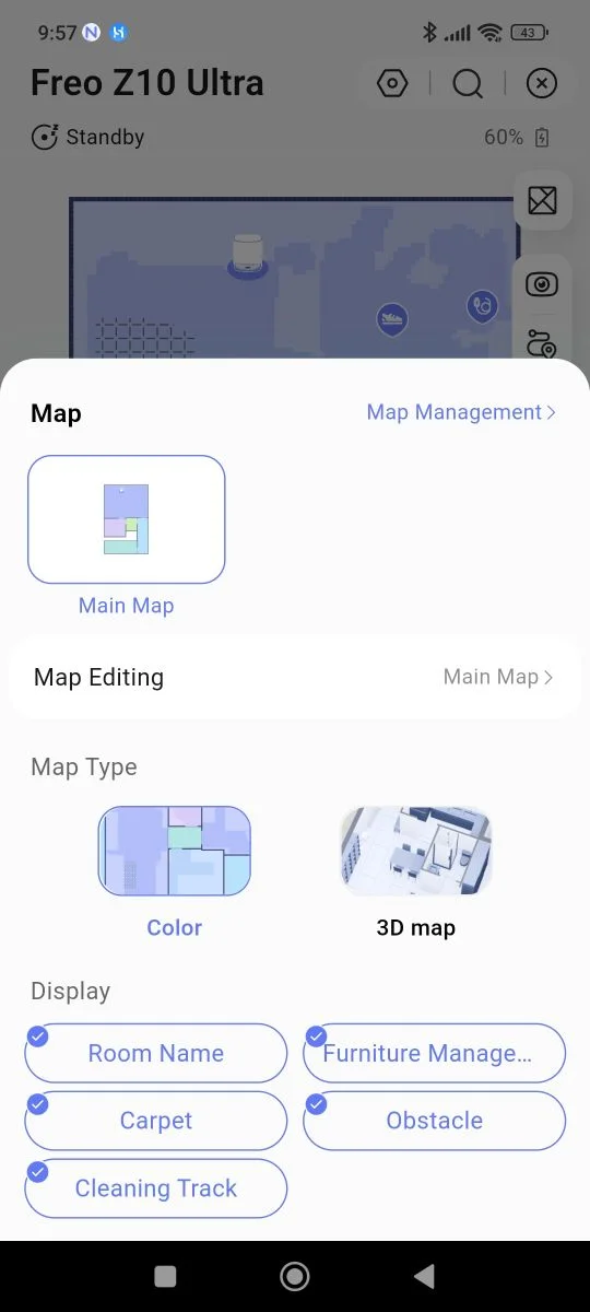 A Narwal Freo Z10 Ultra appjának a felülete letisztult, xiaomis elrendezéssel operál,