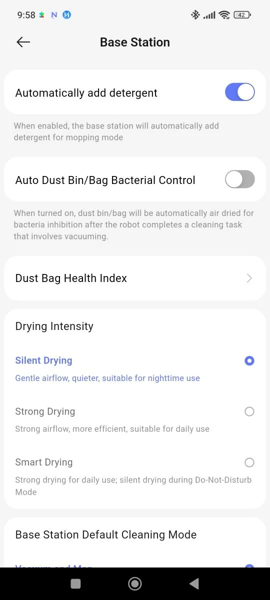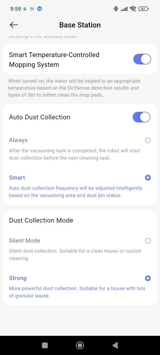 nagy szerencse, hogy magától szabályozza a szívóerejét, így nem ordítja végig a lakást. Természetesen az alkalmazásból ti is belenyúlhattok a folyamatba, de ez nem szükséges. Mindenhonnan összeszedte a port, nagyon alapos, csak azok a területek képeztek ez alól kivételt, ahová nem fér be vagy nem képes felmászni. A tárgyakat finoman érinti, nem ad elő nagy vergődéseket, mint például a Dreame D9 Max robotporszívóm a széklábakon vagy a küszöbökön.