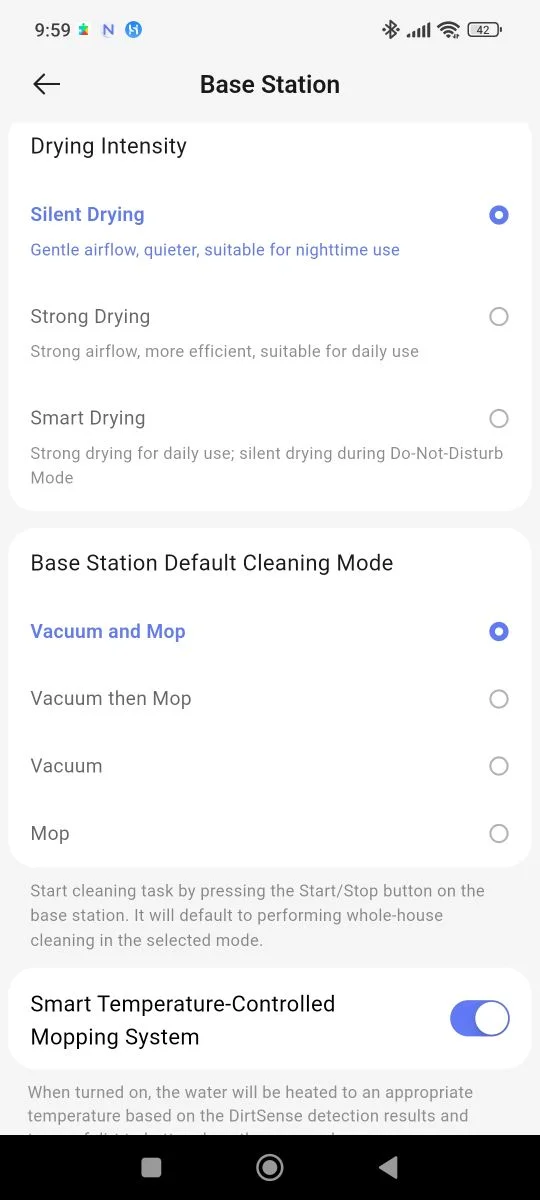 A fenti tevékenységekről ráadásul ékes angolsággal tájékoztatja a Narwal Freo Z10 Ultra a nagyérdeműt, nincsenek már csinglisül érthetetlenül hadováló megoldások vagy recsegő hangszórók. Természetesen a moptisztítás melegvízzel történik, a végén egy szárítási procedúrával, ami már sokkal halkabb és gyorsabb, mint korábban. Ezt is tudja a „dög”, tényleg nem lehet belekötni.