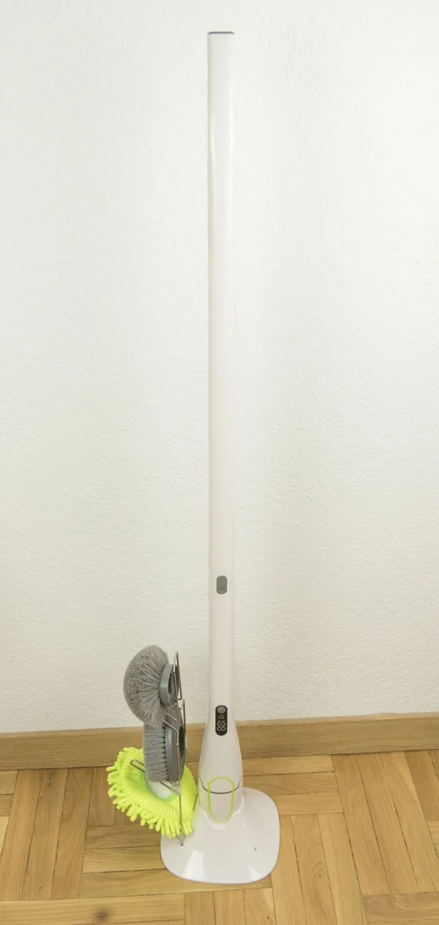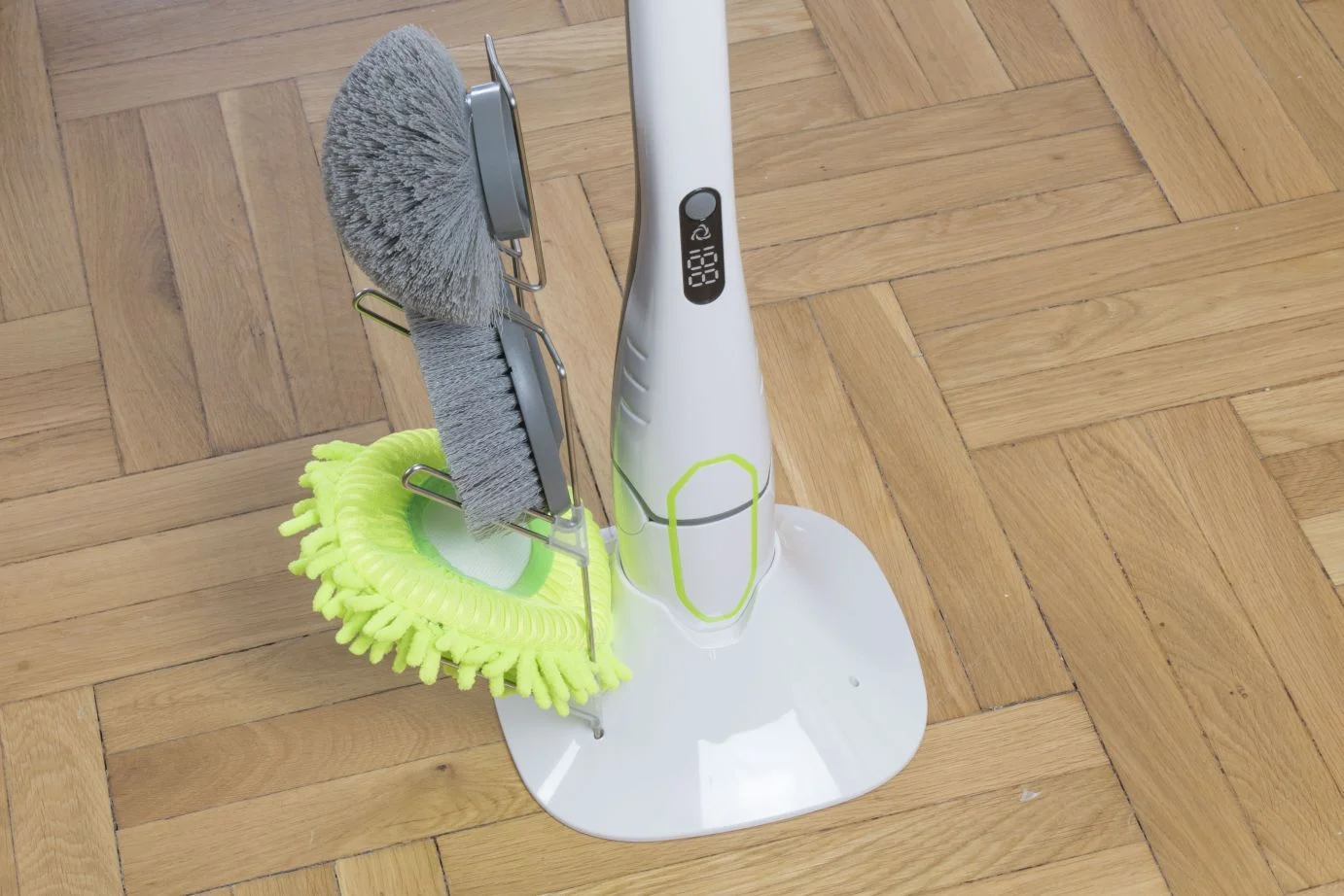 Autót sem mostam vele, viszont a fürdőszobát alaposan kitakarítottam. Ehhez mind a négy fejet használtam. A kádat, a mosdót, a kádparavánt, a csempét és a metlakit is megtisztítottam, és az eredmény szép lett. Nagyobb felületekre kifejezetten hasznos a gép, mert sokat spórolunk időben és energiában is, viszont például csaptelepet és bonyolultabb formákat nem gyorsabb és nem is alaposabb vele tisztítani, mint kézzel. Bizonyos munkafázisokat felvettem videóra is, így egy kézzel használtam, és azt kell mondjam, így nem az igazi, ez kétkezes gép. Ha bele van téve a hosszabbítószár, erősen fejnehéz lesz a gép, tehát alá kell támasztani a fejhez közel is, nem tudjuk a 120 centis rúd végét fogni csak. A fejeket használat után az állvány fém tartóira helyezhetjük megszáradni.