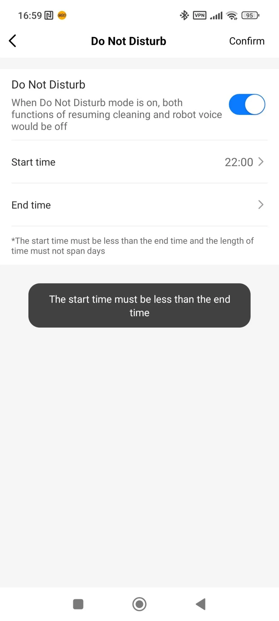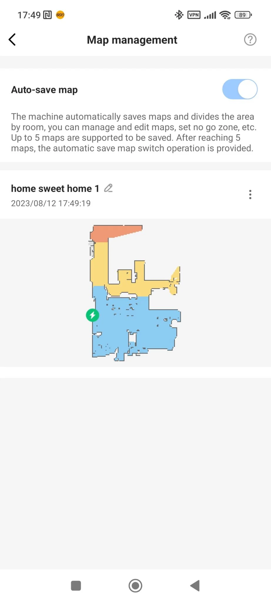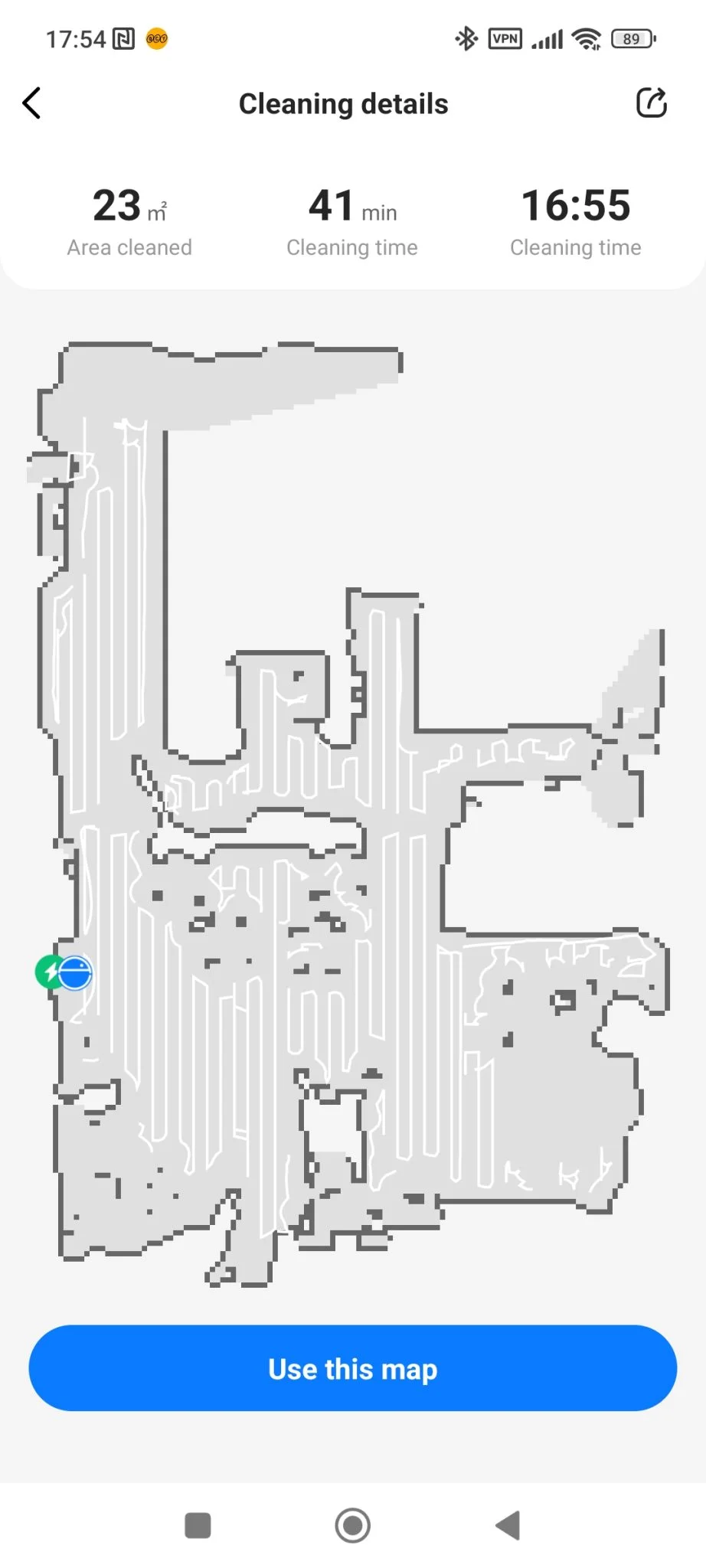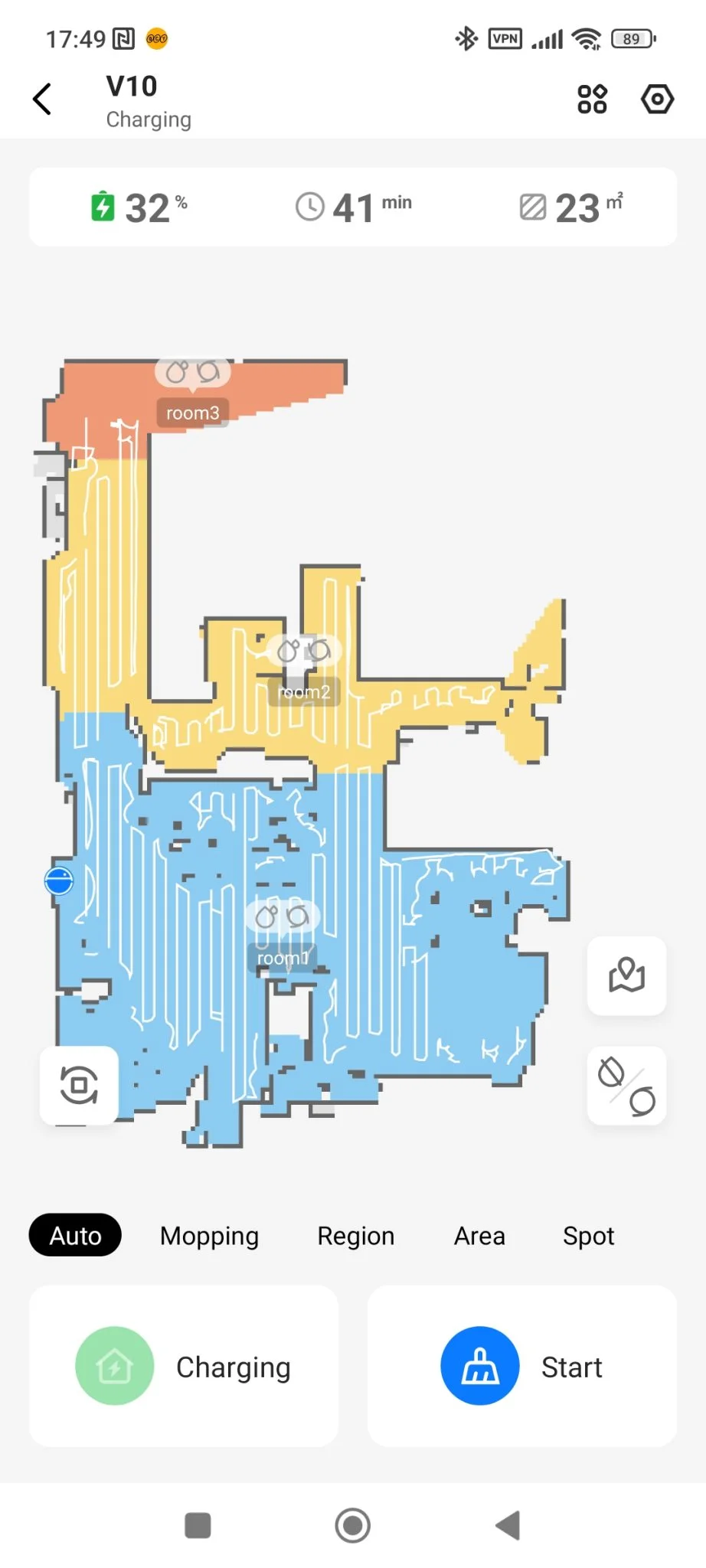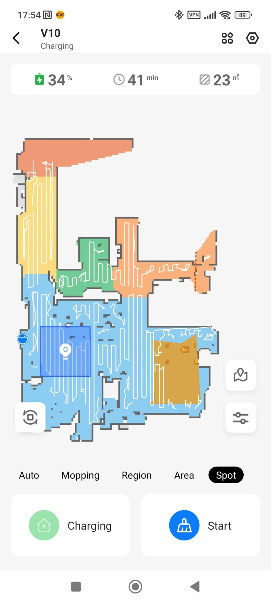 Mint látható, a lista megegyezik a Floobot X1-ével, leszámítva az önürítő funkcióit, amik értelemszerűen hiányoznak. Sajnálatos módon a DND mód még mindig hibás, és a V10 is eléggé „vehemensen” takarít, vagyis, nekizúz bizonyos dolgoknak, de olyan lendülettel, hogy odafordultam, hogy mi volt ez a puffanás. Máskor meg finoman érintette csak a tárgyakat, szóval az a hektikusság itt is megvan, ami a Floobot X1 esetében. Ez nem véletlen, szerintem majdnem ugyanaz a hardver – az X1-ben nagyobb akku van – és a szoftver, csak más műanyag köntösbe burkolták a beltartalmat. Mondhatjuk, egymás klónjai, vagy a V10 az X1 cserejátékosa, csak az előbbi jóval olcsóbban kapható jelenleg.