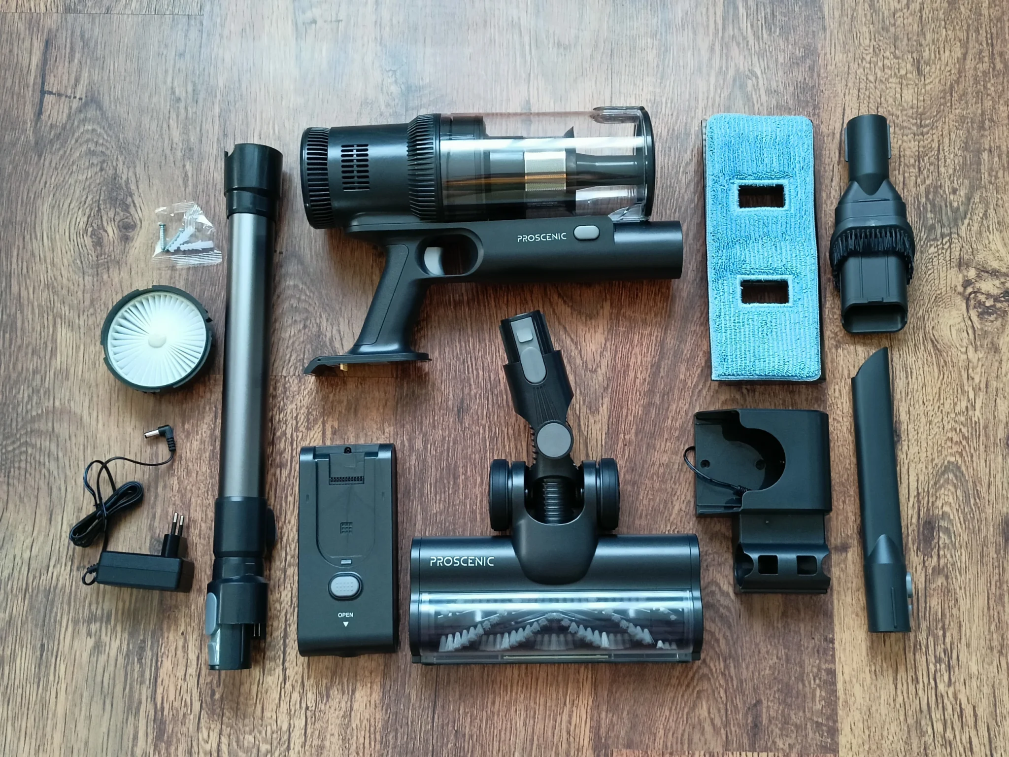 A csomag tartalmaz egy fali konzolt is, amit a mellékelt csavarokkal és tiplikkel lehet rögzíteni. Ha ezt az állványt egy elektromos aljzat közelében tudjuk felszerelni, egyszerűen felakaszthatjuk rá a porszívót, és csatlakoztathatjuk az adaptert az akkumulátorhoz. Ha nem, akkor el kell távolítanunk az akkumulátort és közvetlenül kell csatlakoztatnunk az adapterhez, amikor újból töltésre van szüksége a porszívónak. A Proscenic szerint körülbelül 4-5 óra kell a teljes feltöltéshez, a tesztjeim során viszont ez inkább csak 4 órát vett igénybe.