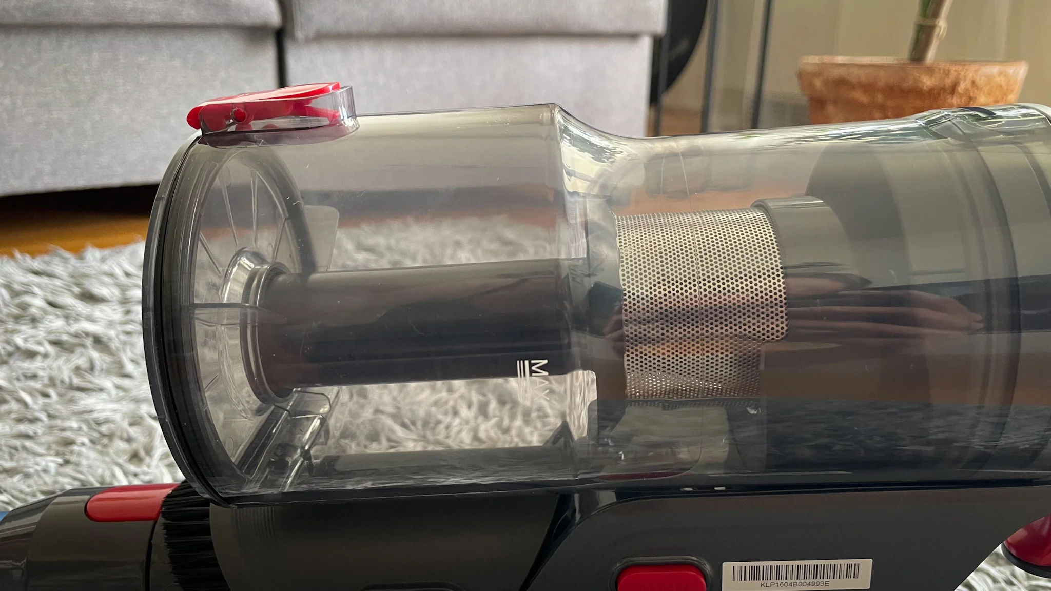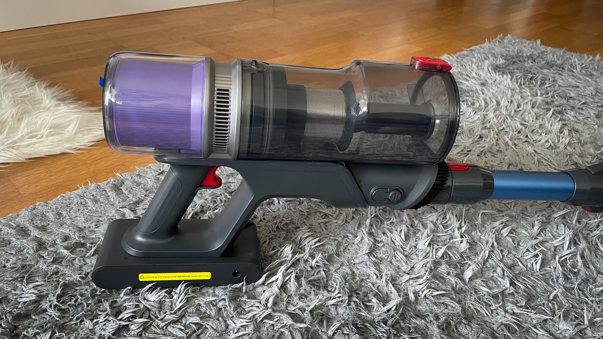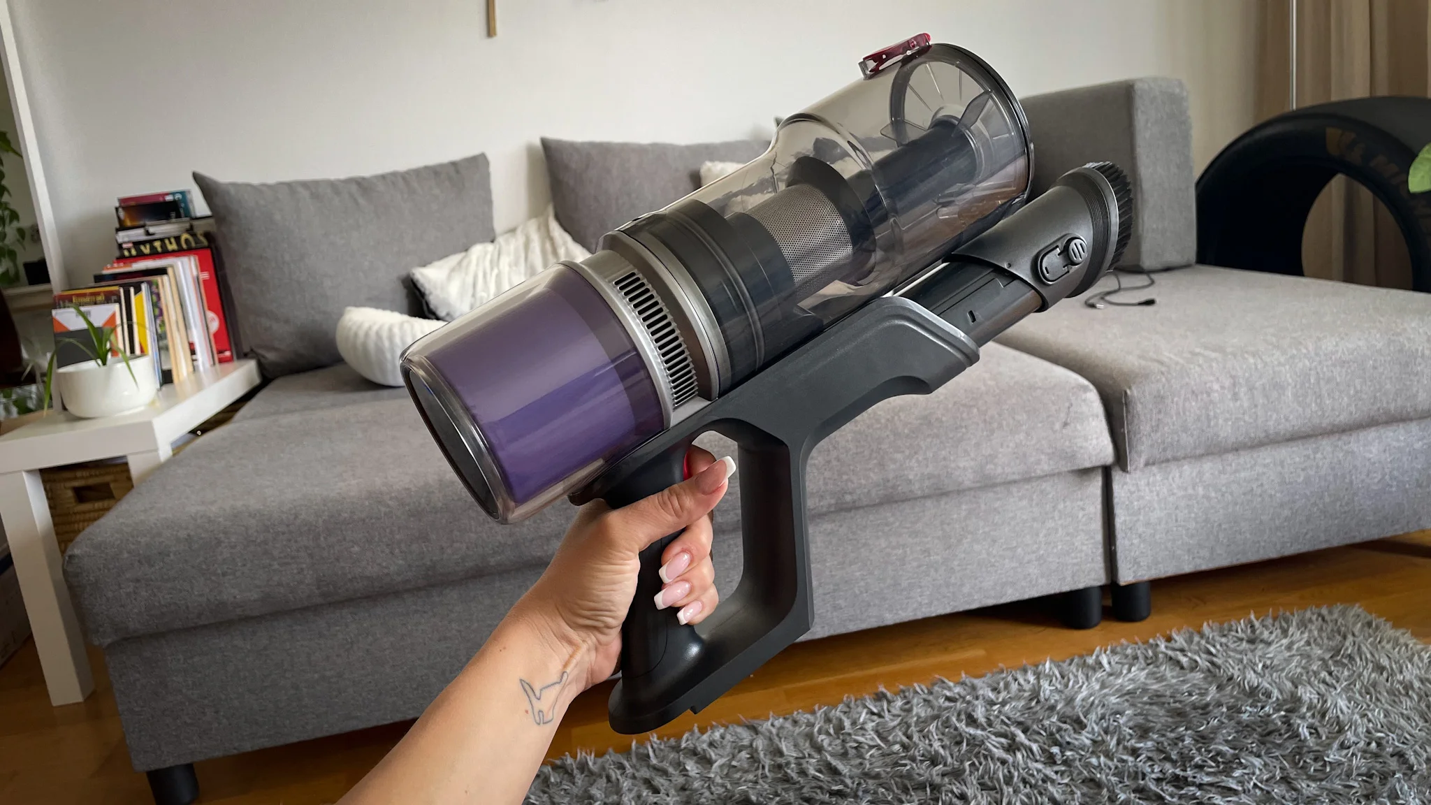 A teljes feltöltés körülbelül 6 órát vesz igénybe és a 2200 mAh kapacitású aksit külön is lehet tölteni a porszívótól, vagy fali konzolról szintén – ez praktikus. A zajszint kellemes meglepetés volt: eco módban konkrétan halkabb, mint a kávéfőzőm. A gyártó szerint 65 dB a maximum zajkibocsátás, de eco módban az applikáció csak 35 dB körüli értéket mért, normál fokozaton 49 dB-t, turbón pedig 59 dB-t – ezek még mindig simán elviselhetők.