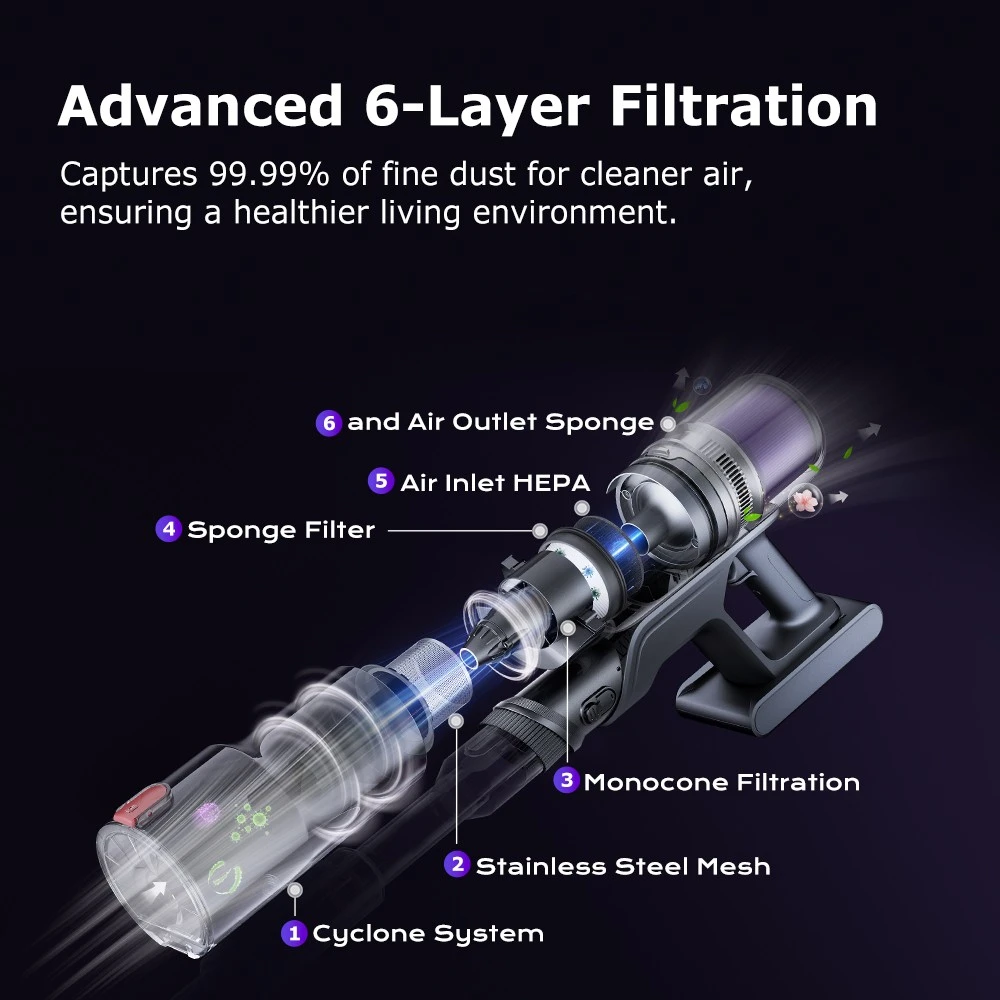 Tényleg megvilágítja azt is, amit elsőre nem is látnék – por, morzsa, szöszmösz, minden lebukik előtte. A porszívó tömege szintén barátságos: a kézi egység mindössze 1,7 kg a cső és bármilyen fej nélkül, és ennek, valamint a 180 fokban előre és hátra forgatható, illetve 90 fokban balra és jobbra dönthető fejnek köszönhetően az egész szerkezet kiválóan manőverezhető. A Proscenic P16 hatrétegű szűrőrendszere gondoskodik arról, hogy a levegőbe visszajutó levegő a lehető legtisztább legyen. A több szűrőfokozat – köztük HEPA-szűrő és fémszűrő – hatékonyan kiszűri a port, az allergéneket és a mikroszkopikus részecskéket is.