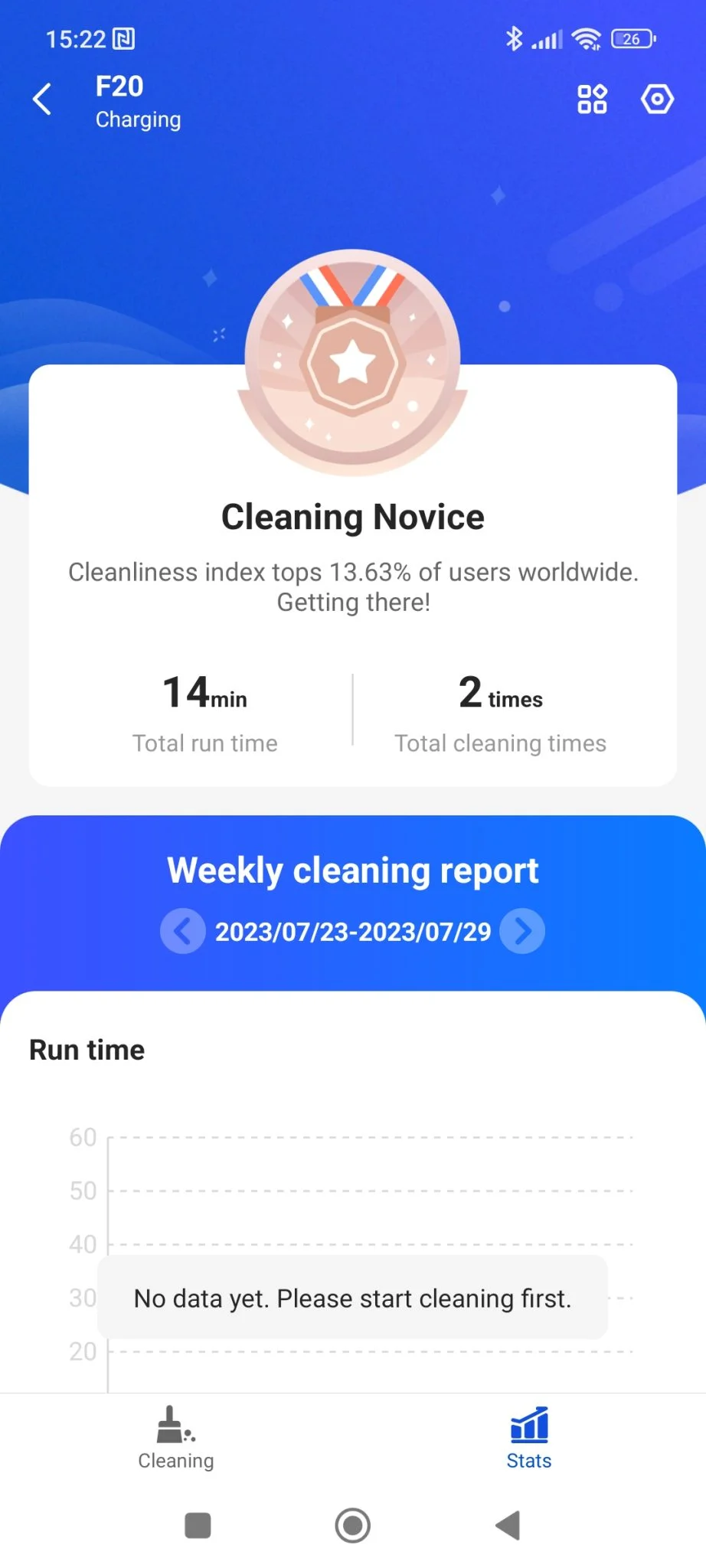 Leszedtem a progit, összelőttem a WiFi-vel, és hopp, még egy métert nem toltam, de már megkaptam a „Cleaning novice” rangot, vagyis valaki már járatta a gépet. Minőség-ellenőrzés? Igen, az erről szóló matricát meg is találjátok a tiszta víz tartályon. Az mondjuk vicces, hogy a víztartályok állapotára először azt mondta, hogy normál, pedig nem is volt bennük folyadék. Mentségére legyen mondva, mikor elindítottam az öntisztítást, akkor egyből észrevette, mi a szitu. Az alkalmazás egy dologra nagyon jó: rinyál, ha valami kifogy vagy valamit cserélni kell, és lehet követni a takarítási statisztikákat is. A hiánya nem lenne nagy érvágás, de jó hogy van, megkönnyíti az üzemeltetést.