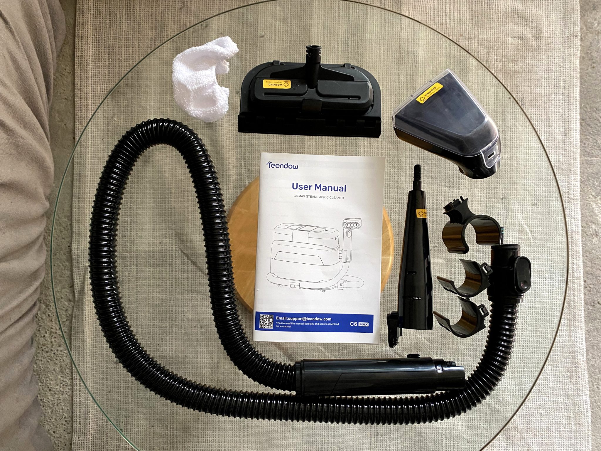 A Teendow C6 Max egy olyan dobozban érkezik, ami semmilyen titkot sem rejt, mert a dizájnja egyből elárulja, hogy mi van benne: nemcsak a kárpittisztító, hanem egy halom kiegészítő is. A csomagból előkerülő gép nem éppen pehelysúlyú, mert 5,4 kilogrammot nyom, viszont a tetején lévő fogantyúnak és a 4 kis kerekének köszönhetően könnyedén mozgatható, szállítható. A dizájnja minimalista és sokkal diszkrétebb, mint a C5 esetében, hiszen a gépet körbe fekete és fehér színű burkolat takarja, így nem teljesen látni, hogy mennyi és mennyire koszos víz van benne. Az anyaghasználata korrekt, nem gagyi, nem recseg vagy ropog. Van rajta 3 darab műanyag bilincs, amik segítenek megtartani a flexibilis csövét, így az rátekerhető körbe, ráadásul a kábelnek szintén megvan a maga helye, hogy hova kell feltekerni, ez pedig különösen tetszett.