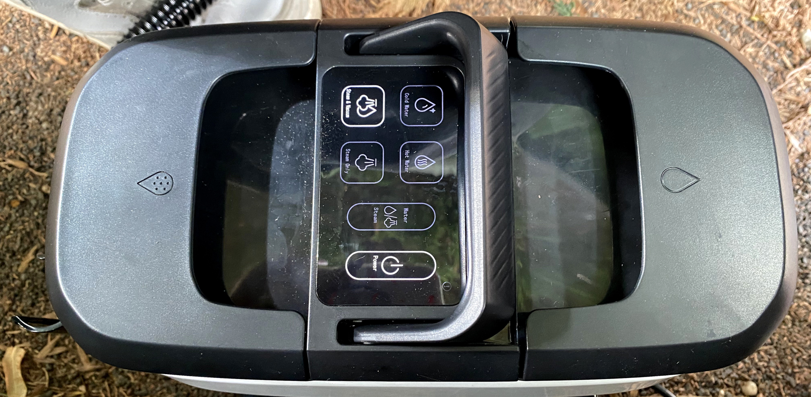 A gép fogantyúja alatt kapott helyet a kezelőfelület, ahol 4-féle módból választhatsz: van egy gomb külön a hideg (Cold Water) és külön a meleg víznek (Hot Water), még egy a gőzölésnek (Steam Only), a negyedikkel pedig a gőzt és a porszívózást kombinálhatod (Steam & Vacuum). Van egy ötödik gomb is, ami a víz és gőz adagolásához szolgál (Water/Steam). Első ránézésre kicsit zavaros ez az elgondolás, de a használati utasítás lépésről lépésre leírja, hogy melyik módnál milyen sorrendben kell nyomkodni a gombokat, bár ez már az első használatnál egyértelművé fog válni. Például, ha csak a gőz funkciót szeretnéd használni nem elég megnyomni a „Steam Only” feliratú gombot, hanem utána a Water/Steam feliratúval el is kell indítani magát a gőzt. Ugyanez érvényes a gőzölés és porszívózás kombinálására: először a Steam & Vacuum gombot kell megnyomnod, majd a Water/Steam gombbal elindítod a gőzt.